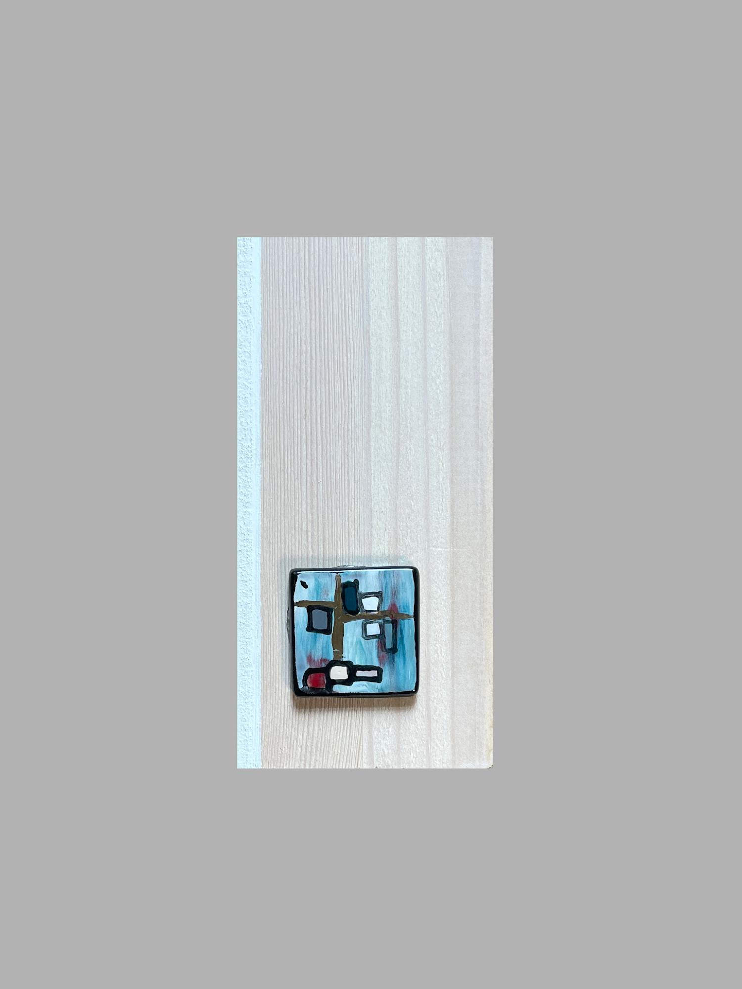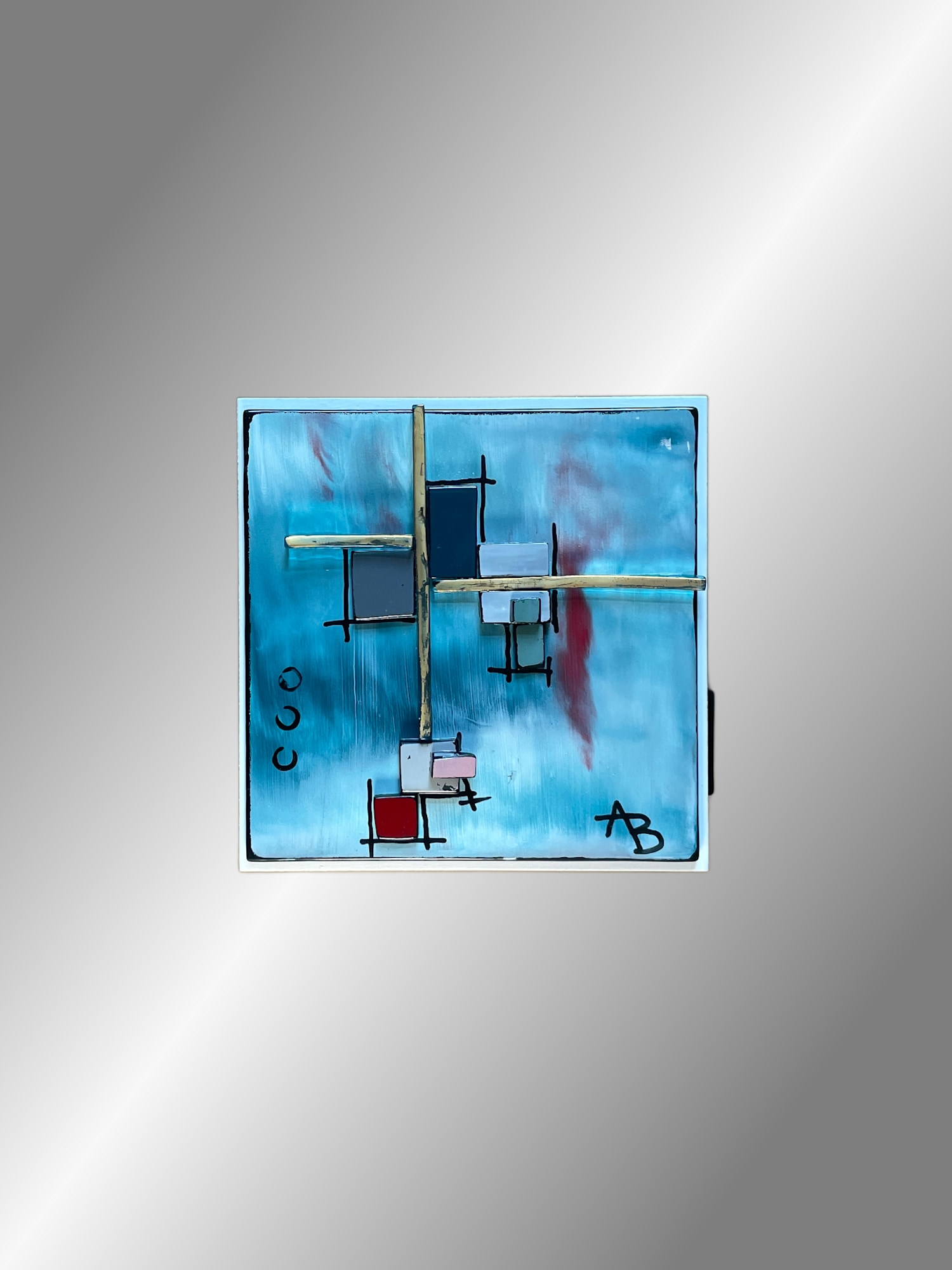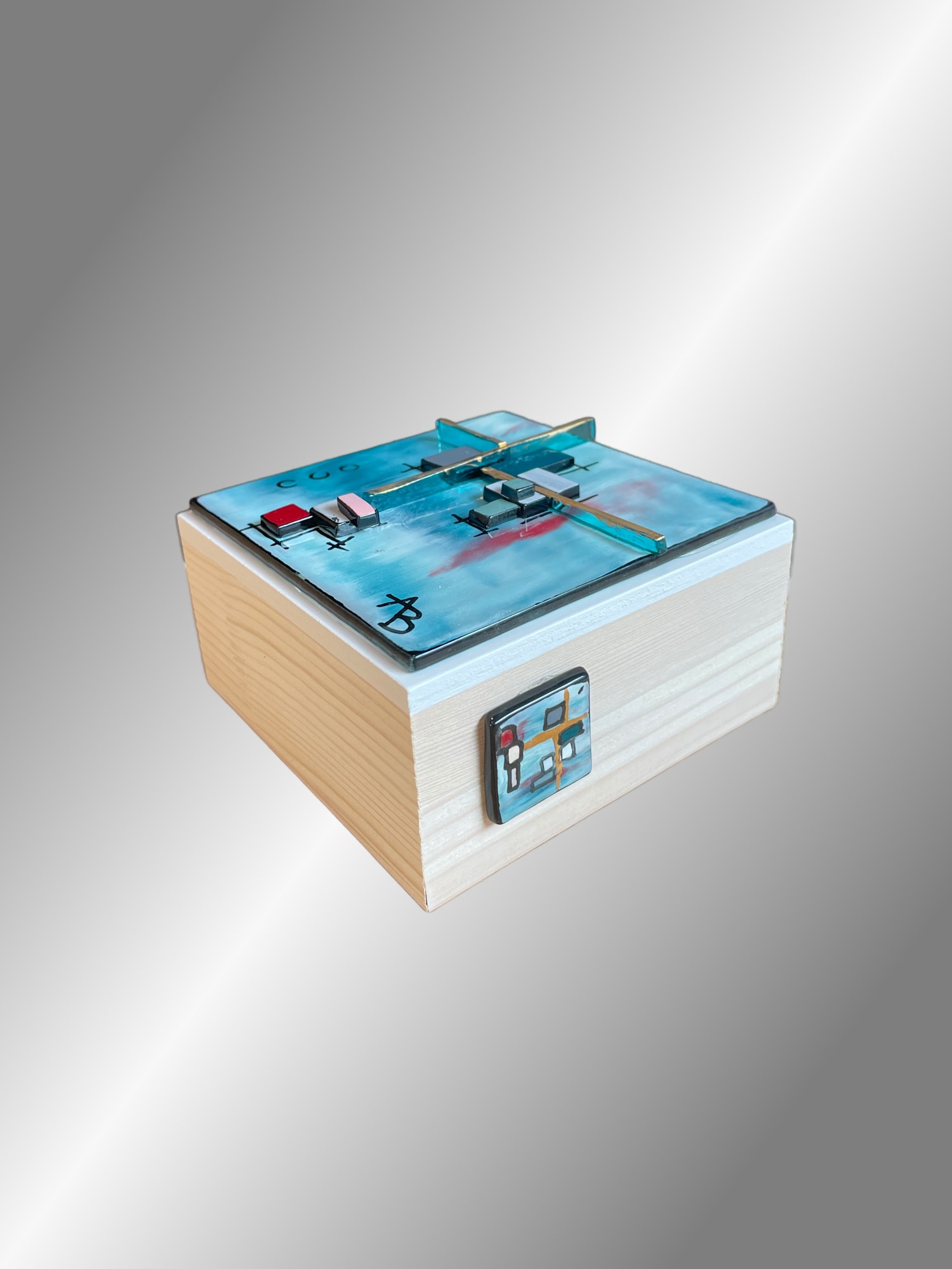 This block is part of my Glasscapes collection. "Sweet" was created by painting with enamels on glass then fired in my kiln. A colorful turquoise, red and white background creates interest, but the star of the show is the transparent turquoise glass placed on edge with brilliant gold along the top. The background design is layered with multiple complementary colored glass pieces for texture. I really love the way this one came out.
