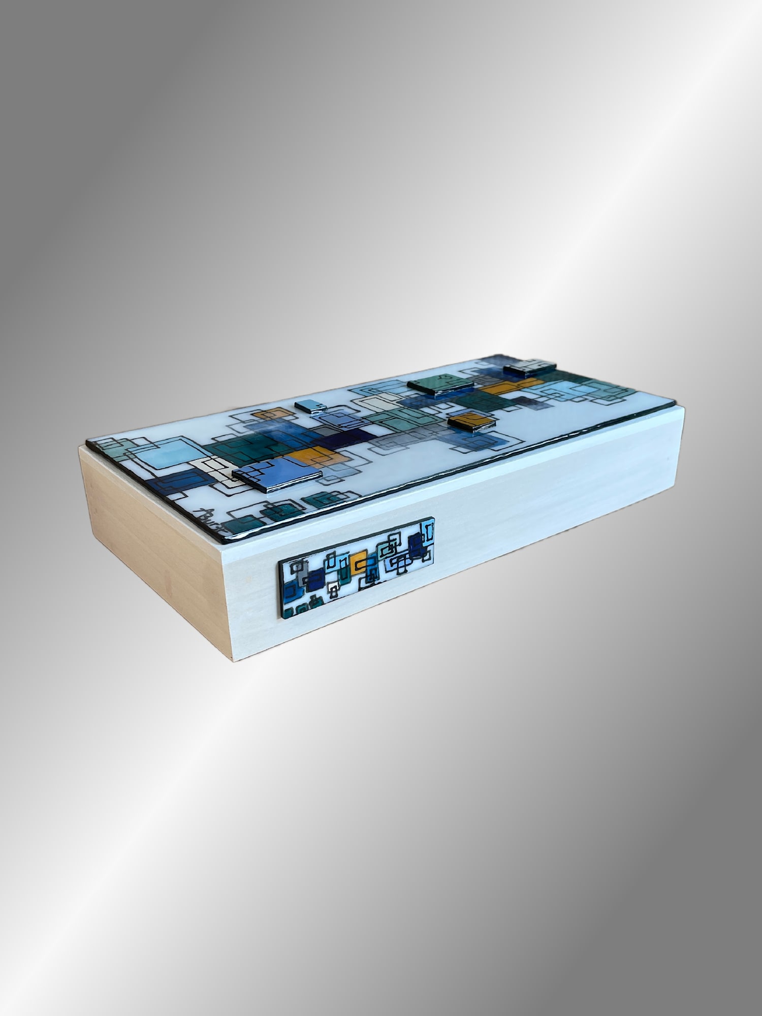 Greens and blues with gold highlights really set this fused glass piece apart from the others. The background is painted with enamels and fired in the kiln. Then I use a fluid writer to draw black lines onto the colored design to give this piece a Mid-Century Modern vibe. An added layer of painted glass pieces with complimentary designs and colors make "Tacit Blues" such a unique piece. It is adhered to a 12"x6"x2" whitewashed wood panel and ready to hang.