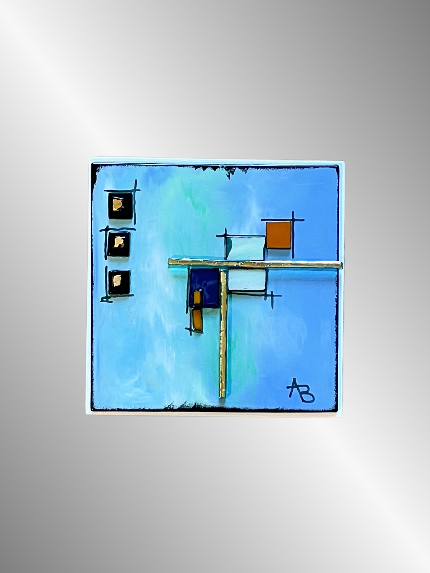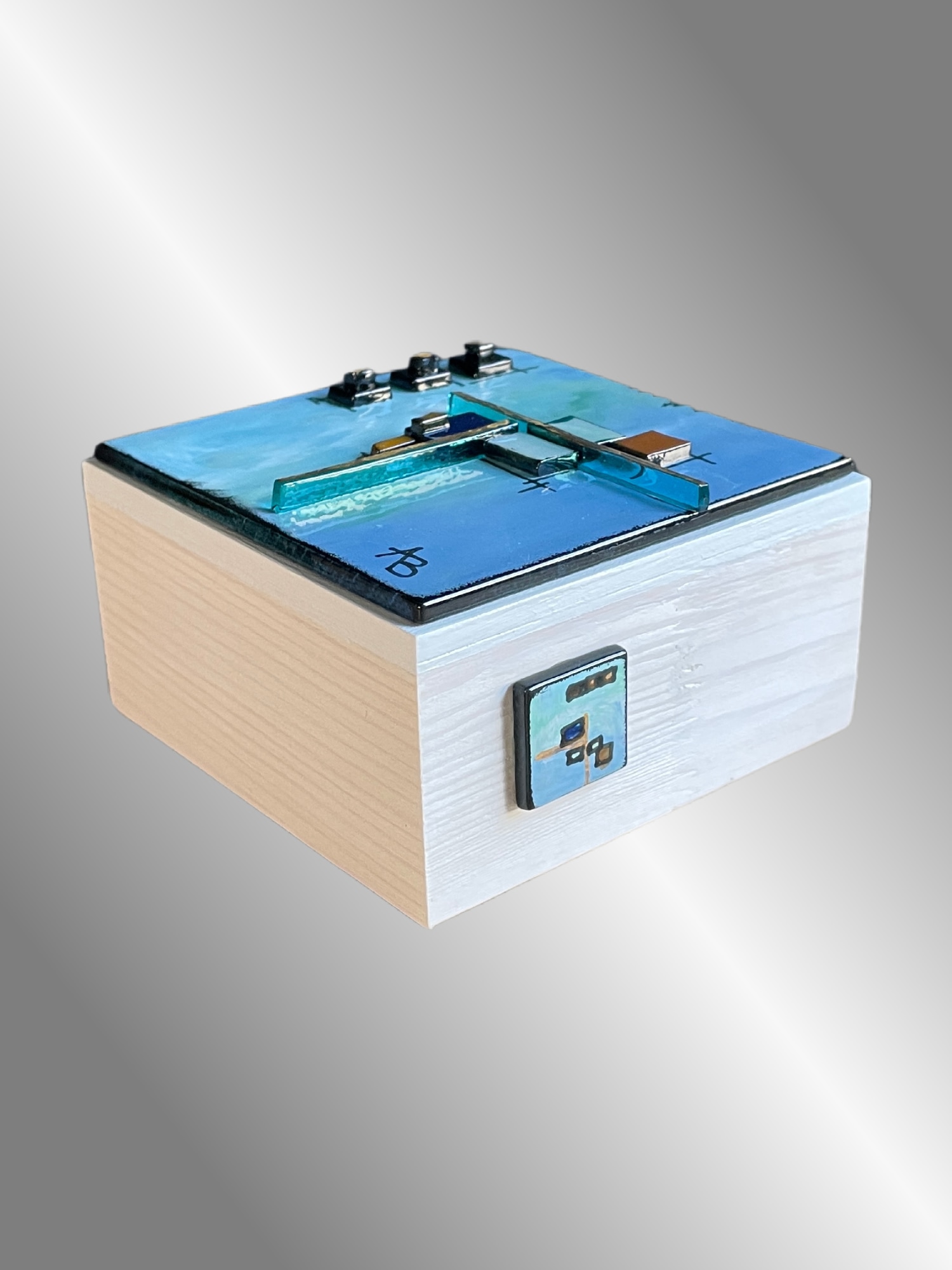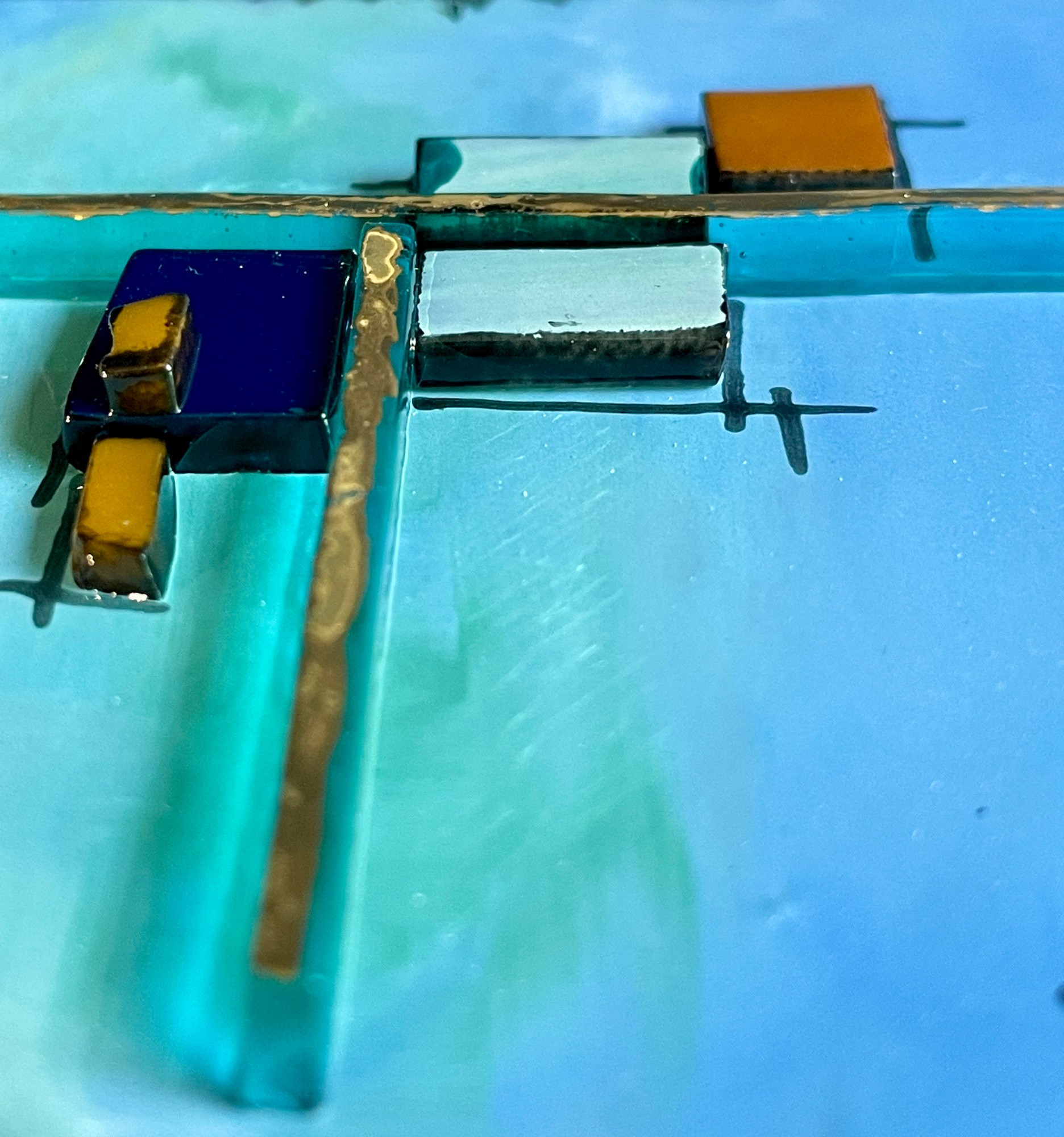 "Thankful" is a stunning piece of fused glass art that will add a pop of color to any space. This unique block is created by painting with enamels on glass then fired in my kiln, resulting in a calming background of greens and blues with gold highlights. The piece also features lots of surface texture formed by several layers of glass design, including transparent sea green glass sitting on edge. The block is 4"x4"x2" with whitewashed sides.