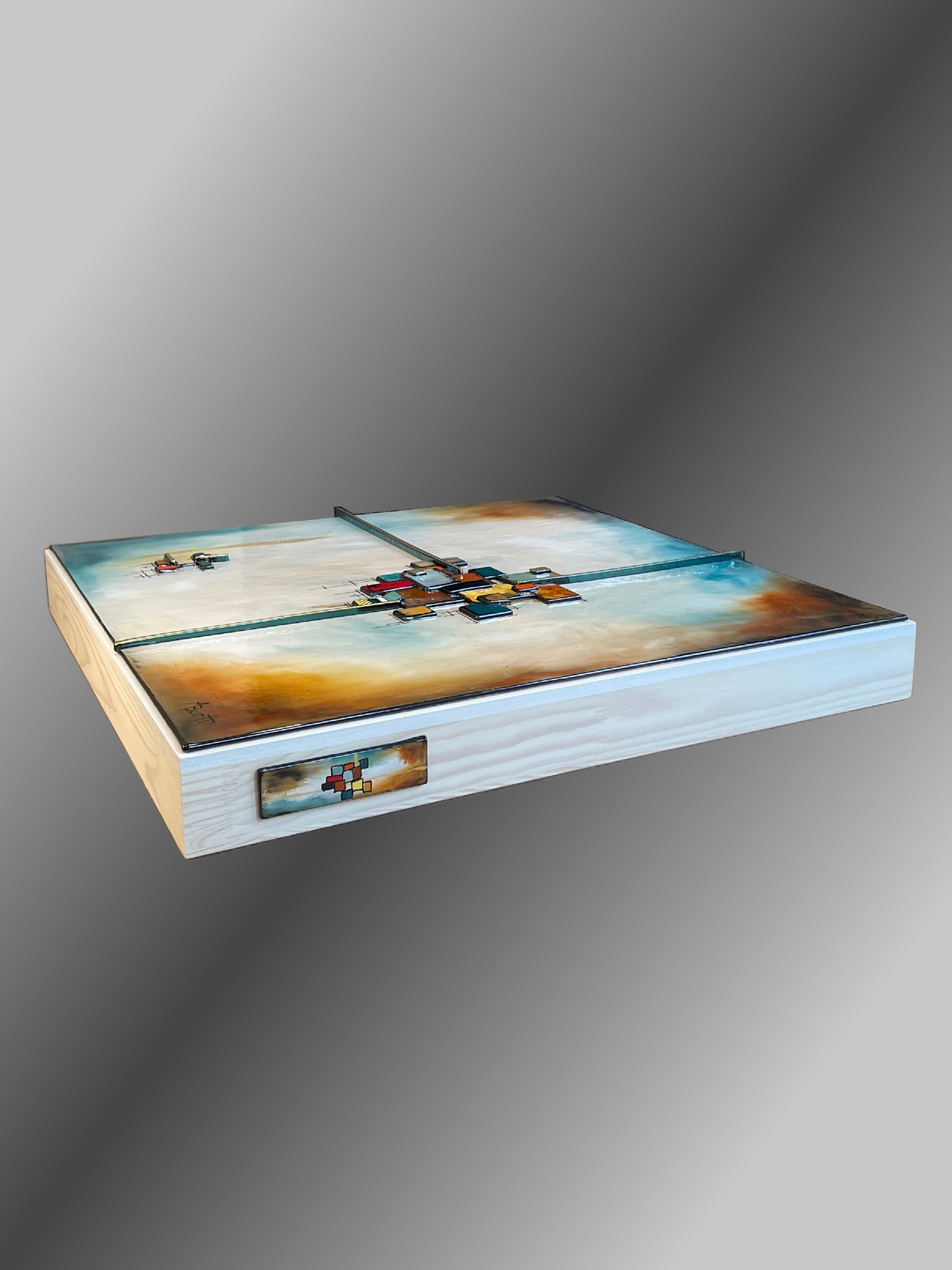 Part of the Glasscapes series, What Remains reads as a distilled city grid — structure reduced to its essentials. Intersecting linear elements establish the framework, while layered geometric forms suggest buildings, blocks, and the memory of place. Anchored by intersecting linear elements, layered geometric forms gather in the upper field while a smaller cluster rests below — suggesting memory, foundation, and continuity.