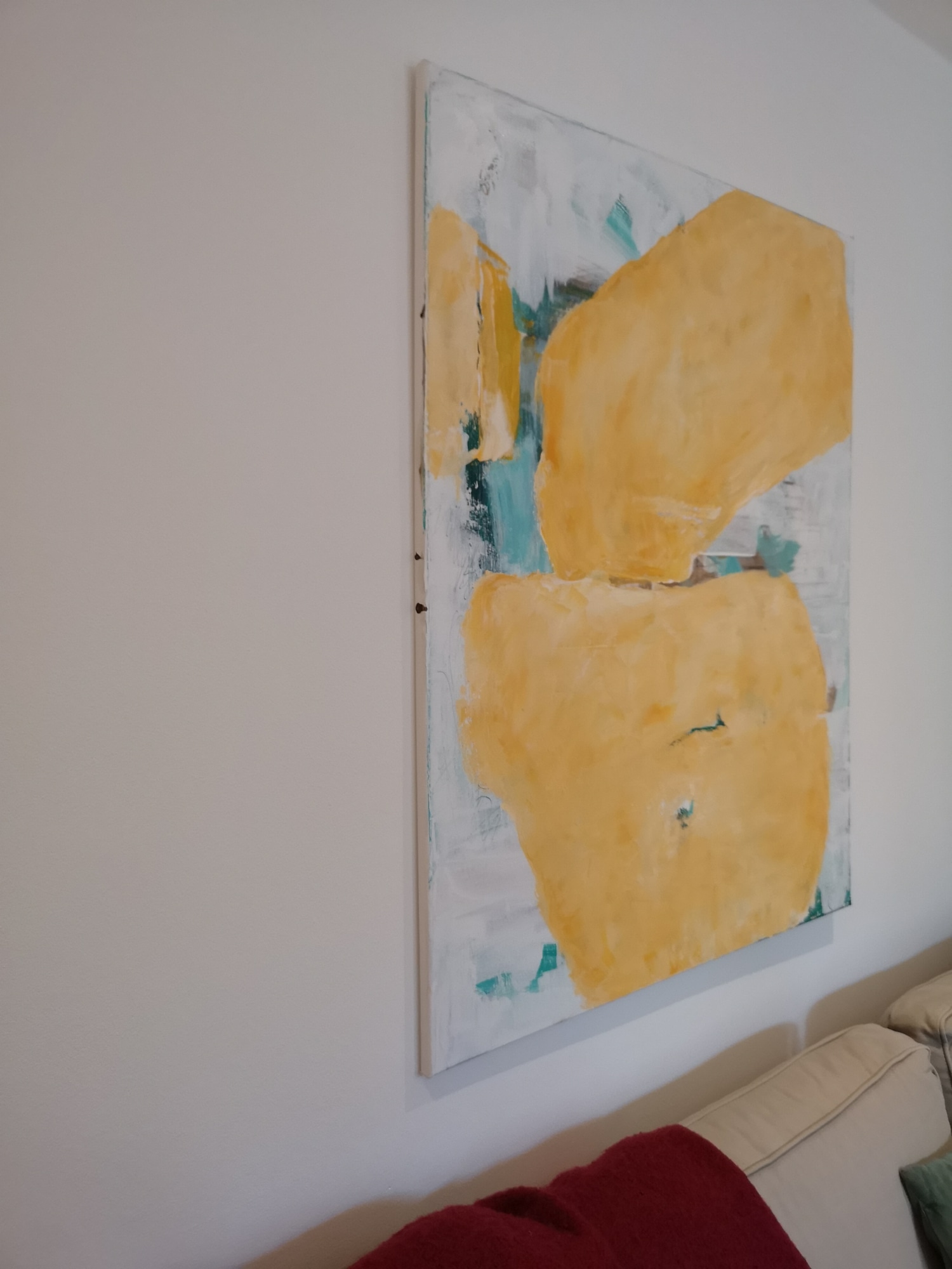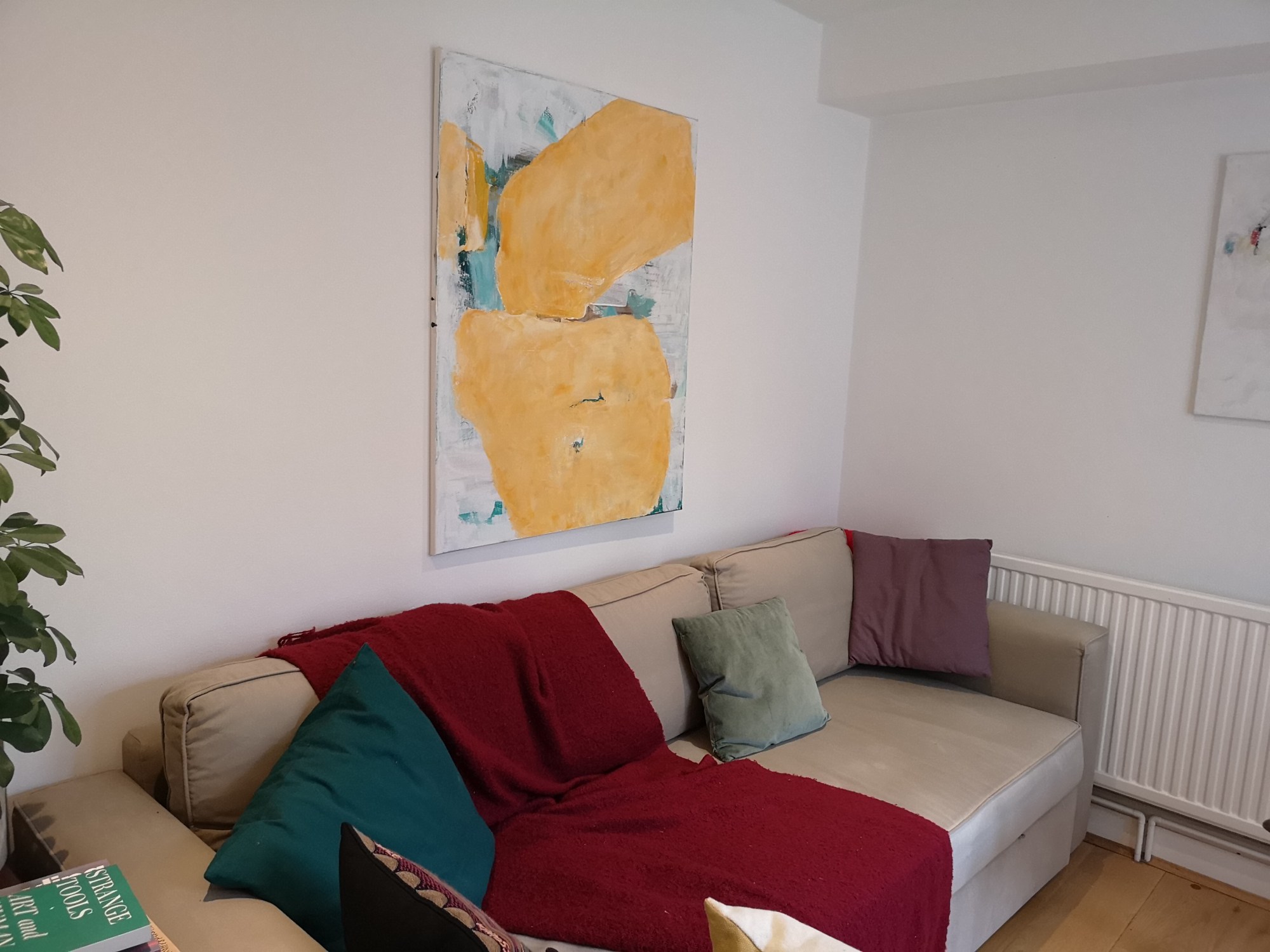 This painting brightens up the room, is light in character and has an uplifting effect. You can have it on the wall as it comes, unframed, or opt for a simple (my suggestion) tray frame - allowing a bit of space between the frame and the canvas.