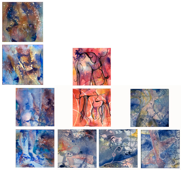 (10) 8"X8" panels that compose a single painting that depicts three yoga poses of the Sun Salutation. Each pose could be purchased individually. Inquire about prices for the three individual paintings: