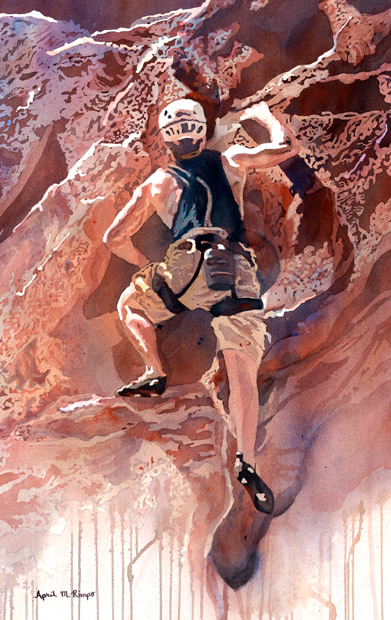 Although I may not partake of this athletic endeavor, I do love to celebrate it. In "Moving Up" I capture the strength and agility of the climber and the ruggle cliff that provide places for him to gain perch.