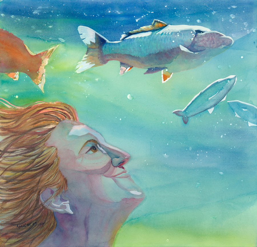 Water Sprite is a tribute to a friend who loves fish. I know this because she bought a painting I did of fish and explained how much she enjoys them. She clarified that she did not mean she liked eating them. When she told me this, my thoughts immediately turned to doing a painting of her swimming with fish with a smile from ear-to-ear.
