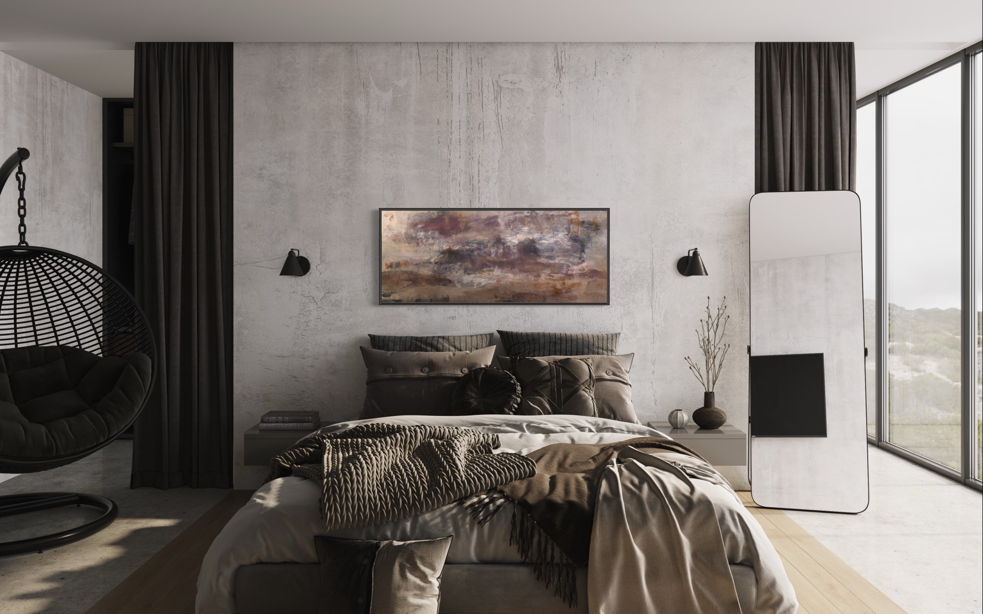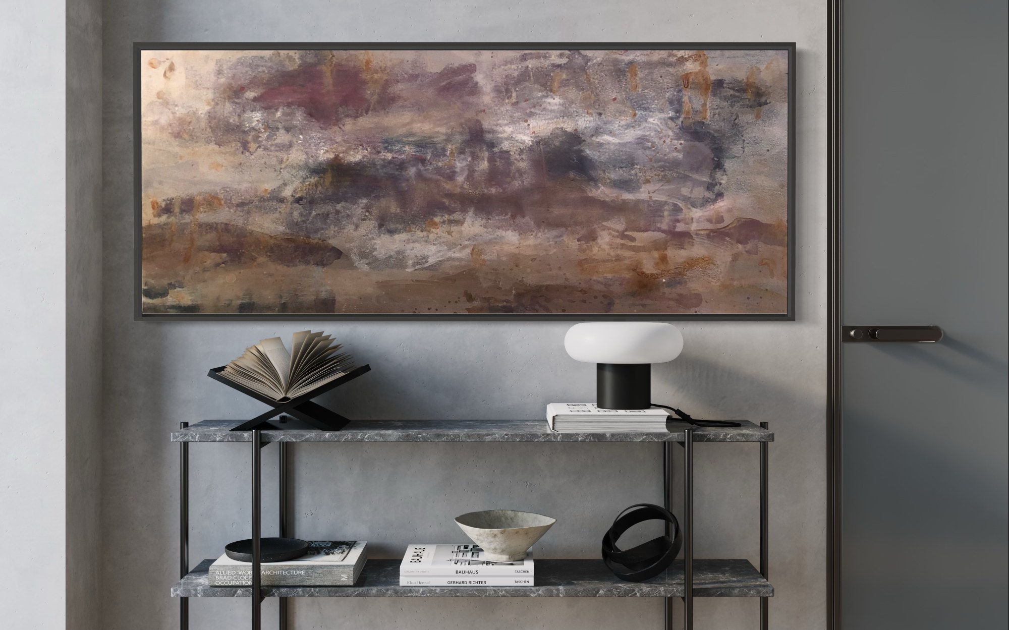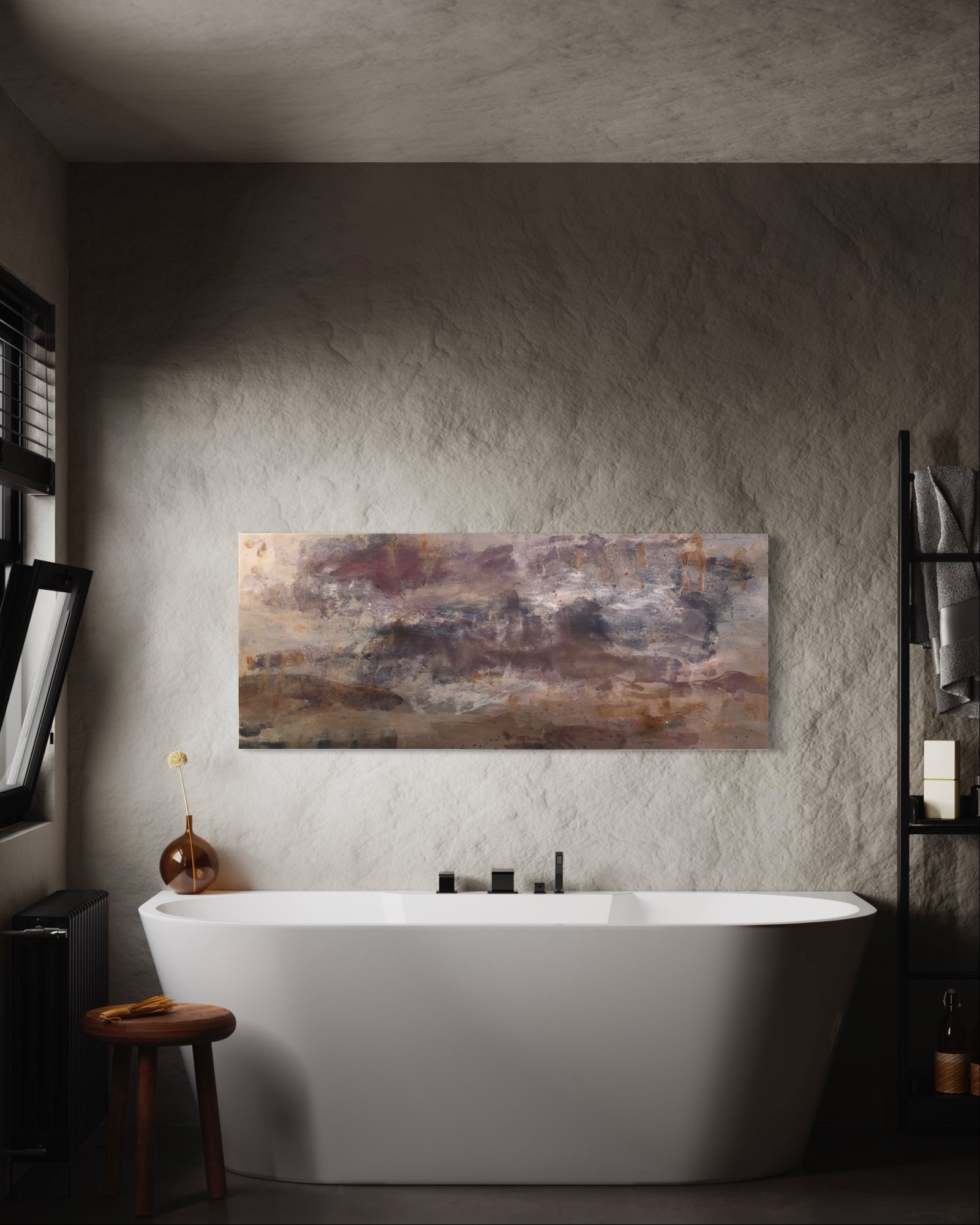 In “Reflections on Metal,” the artists masterfully weaves a tapestry of tranquility and mystery through a symphony of neutral tones and deep, mesmerizing purples.