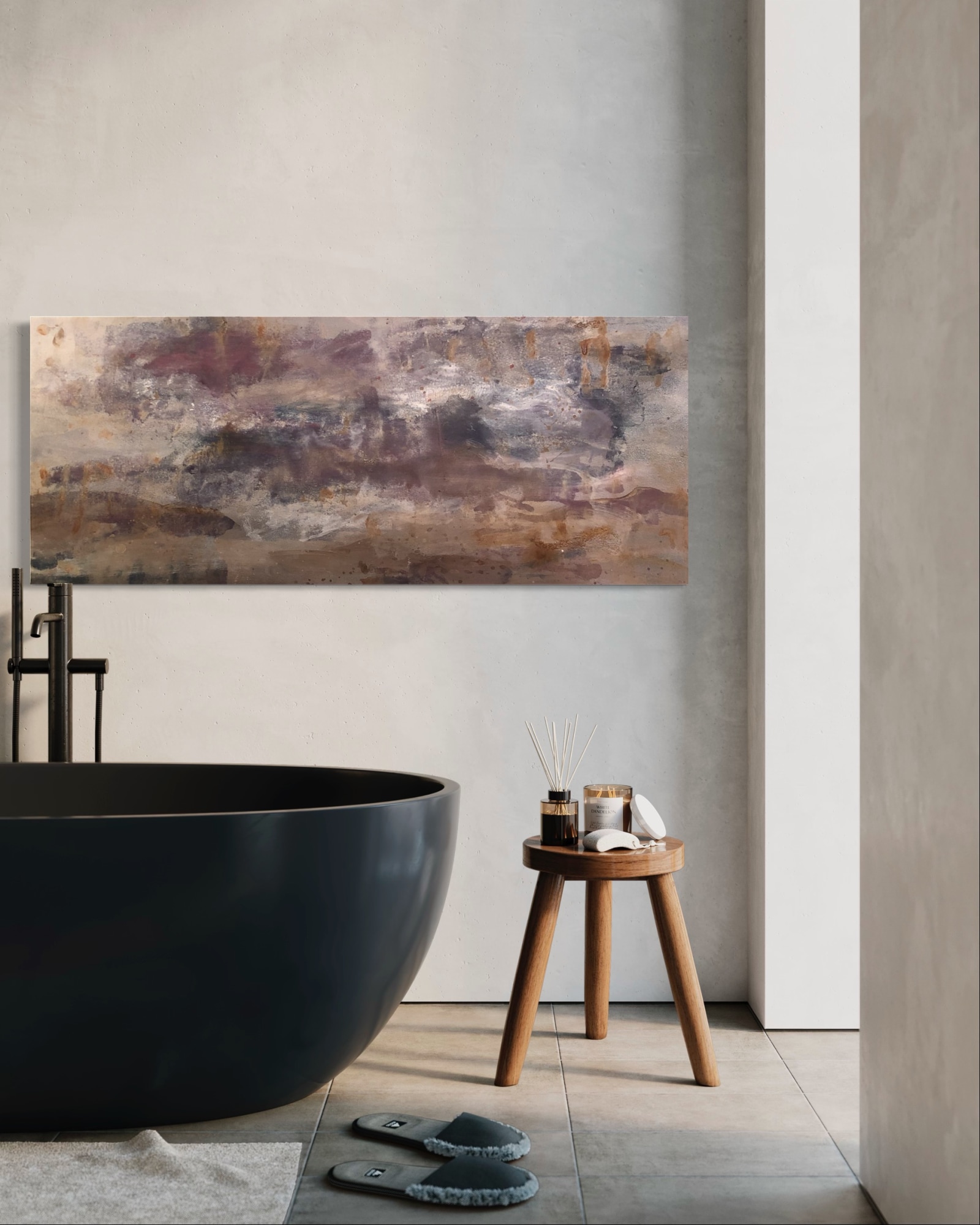 This captivating artwork is a testament to the artist’s expertise in layering and their ability to infuse a sense of fluidity, reminiscent of water’s gentle embrace. The ethereal quality of these neutral hues creates a serene backdrop upon which the vibrant purples dance and shimmer.