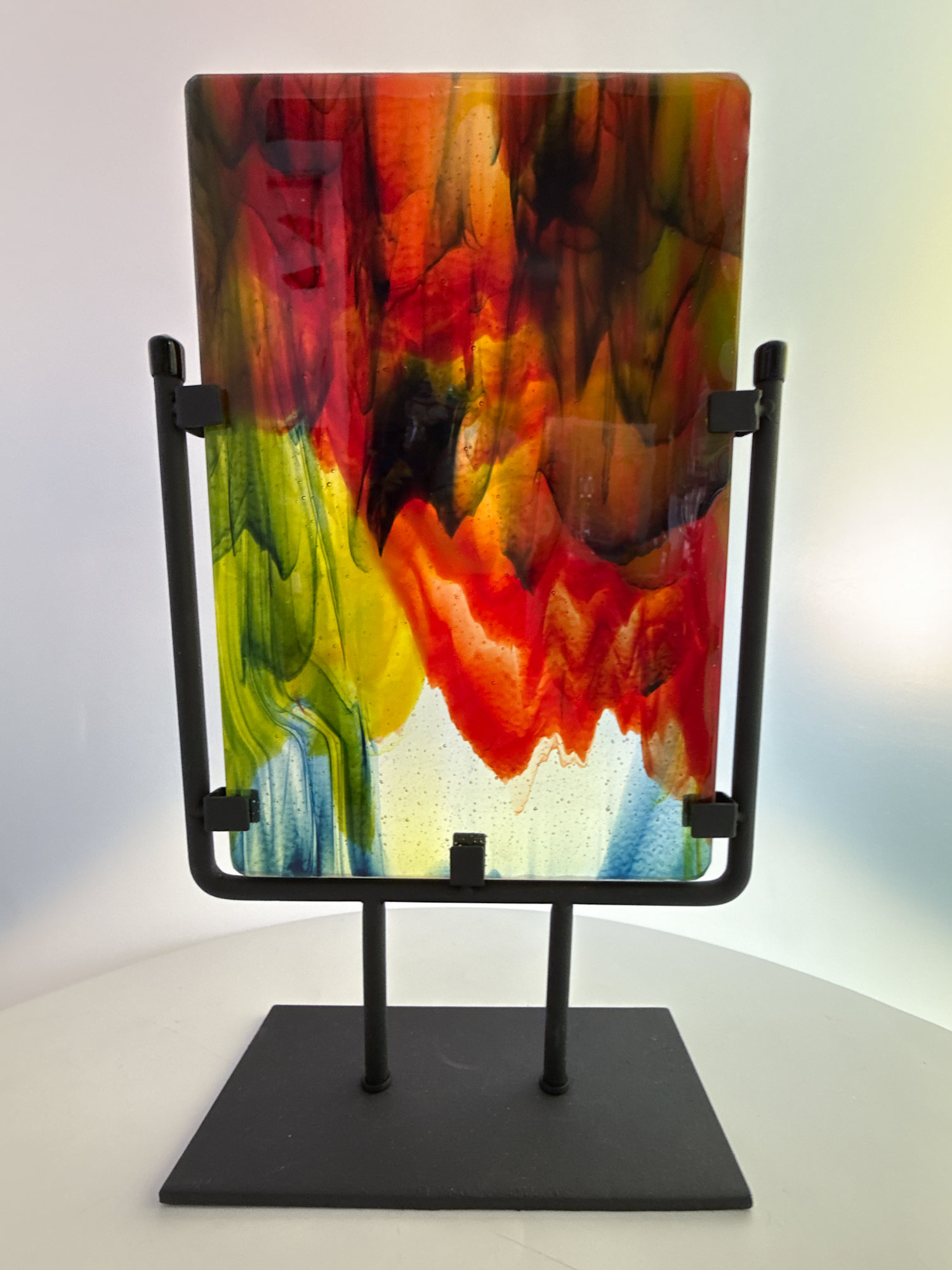 This image showcases a striking piece of fused glass art, held elegantly within a minimalist black metal stand. The glass panel bursts with vibrant, dynamic colors that intermingle seamlessly, creating an abstract, fluid composition. The varied colors and potential textures within the glass panel would cause light to bounce, scatter, and pass through, creating dynamic and ever-changing visual reflections in its surroundings and on its surface. The vibrant colors themselves could be seen as reflections of different light sources or emotional states.