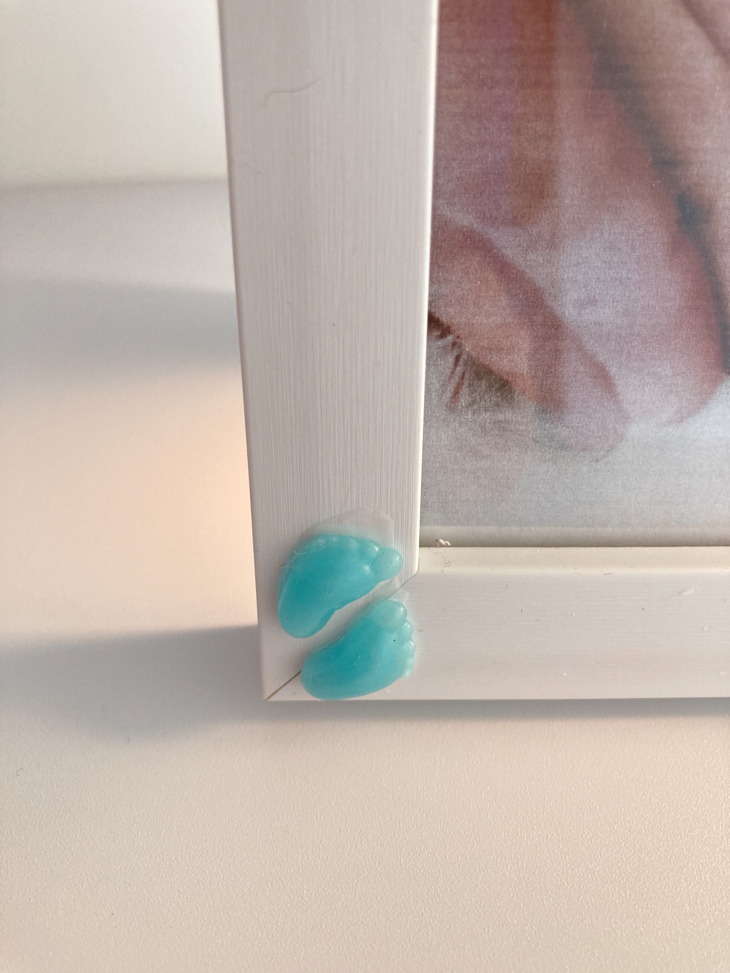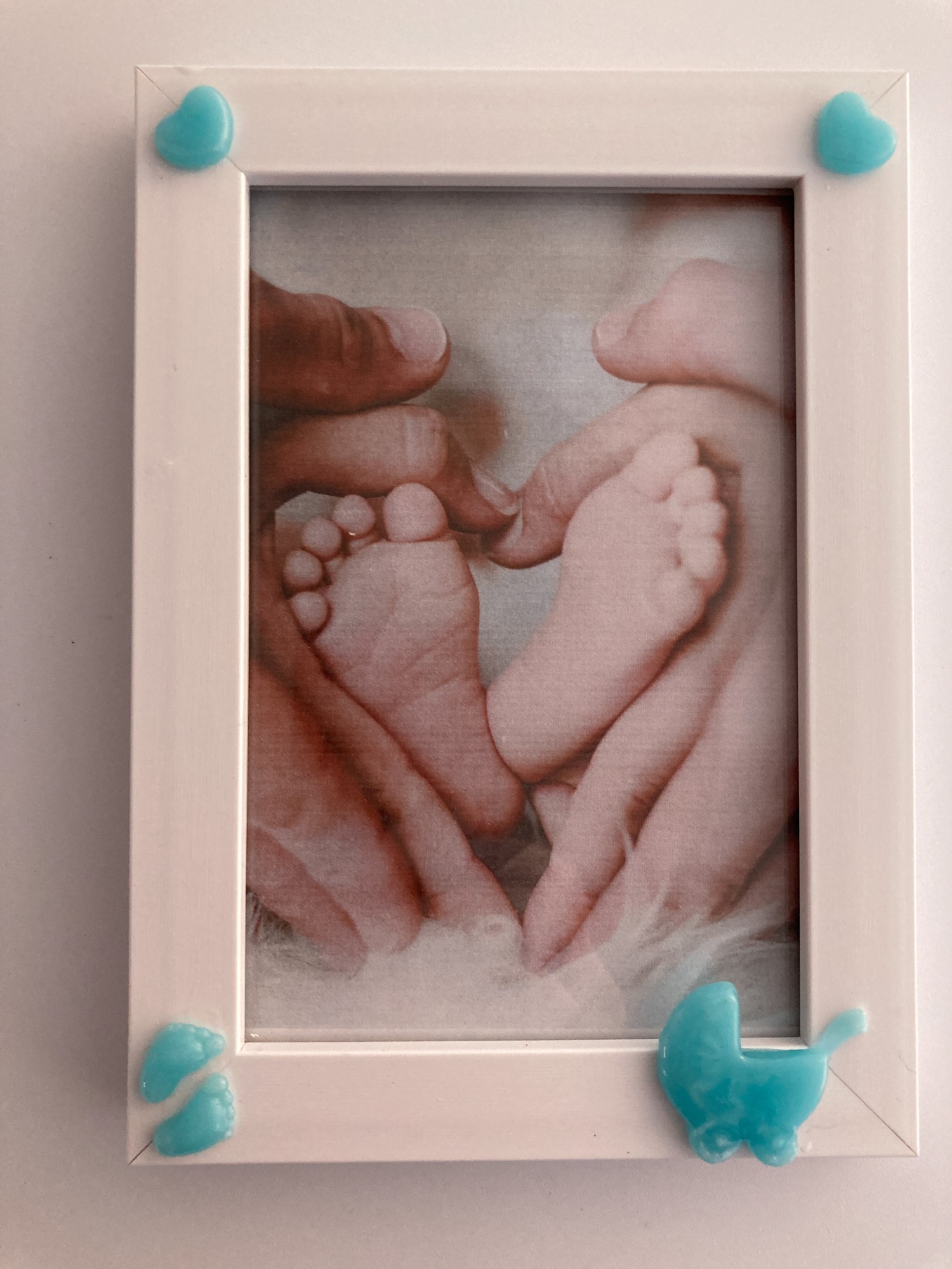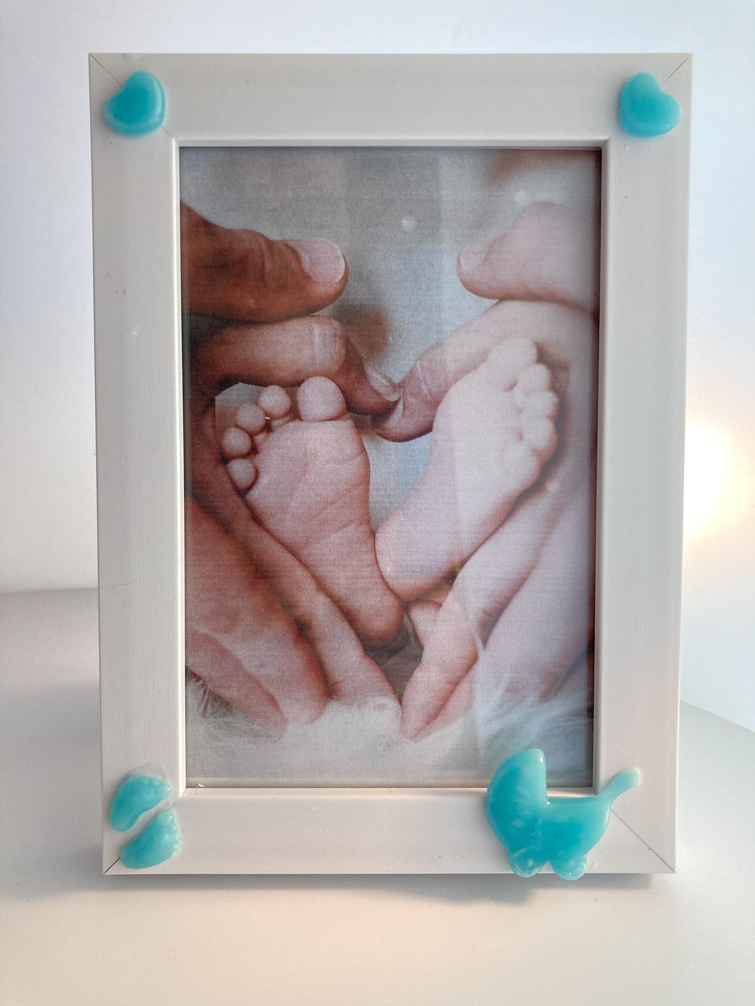 White wood frame with blue glass baby-themed decorations. Holds 6x4" photo.