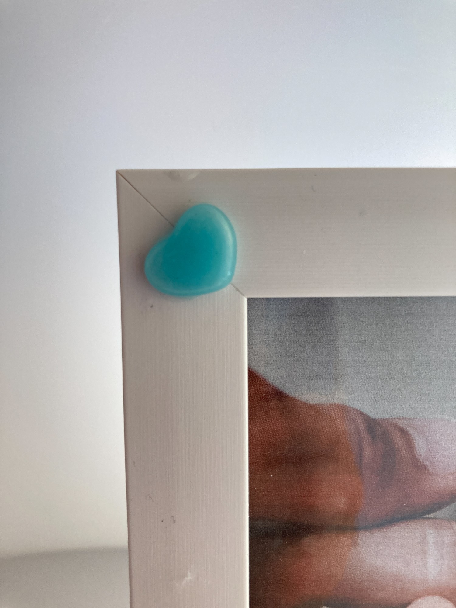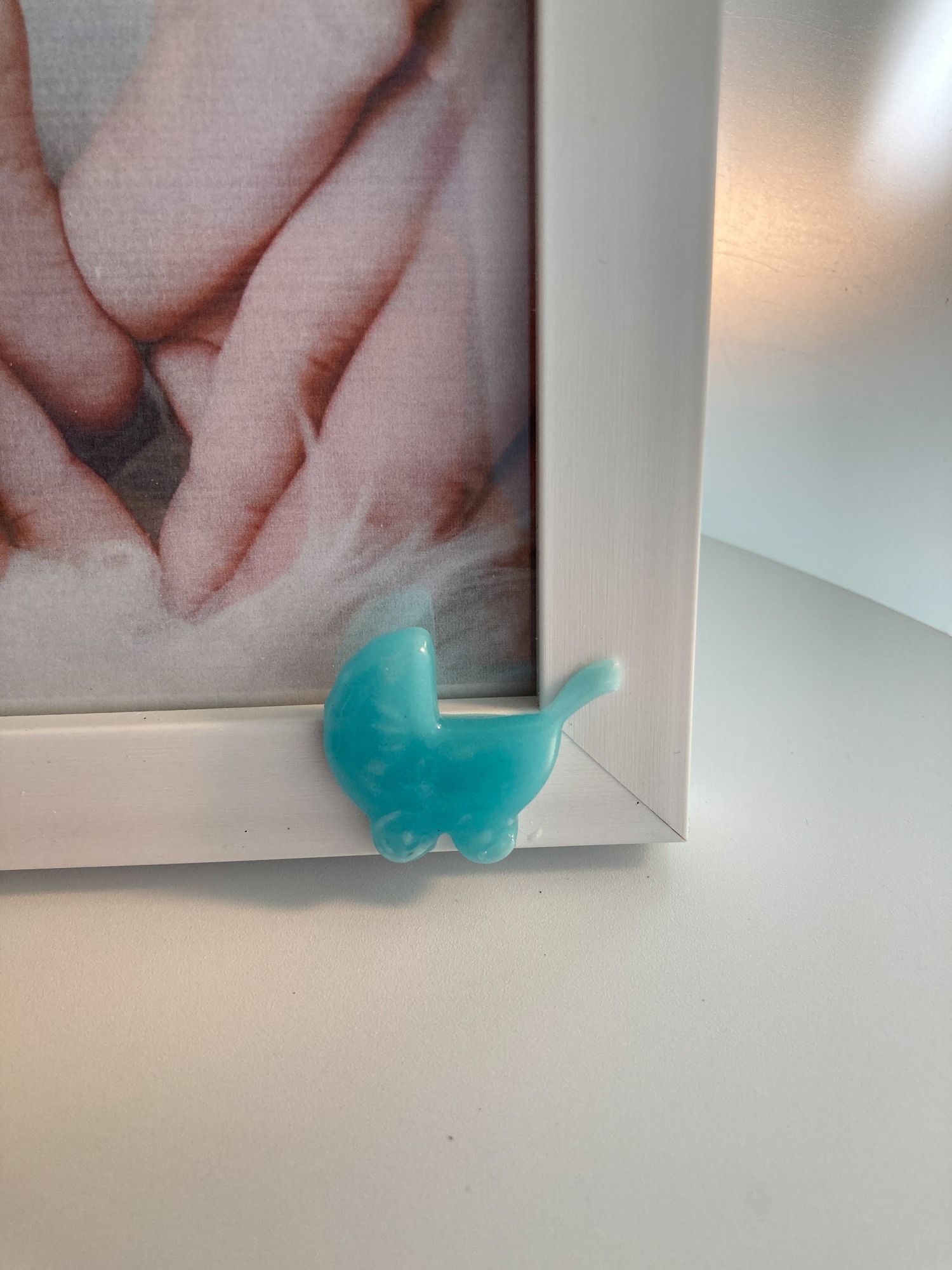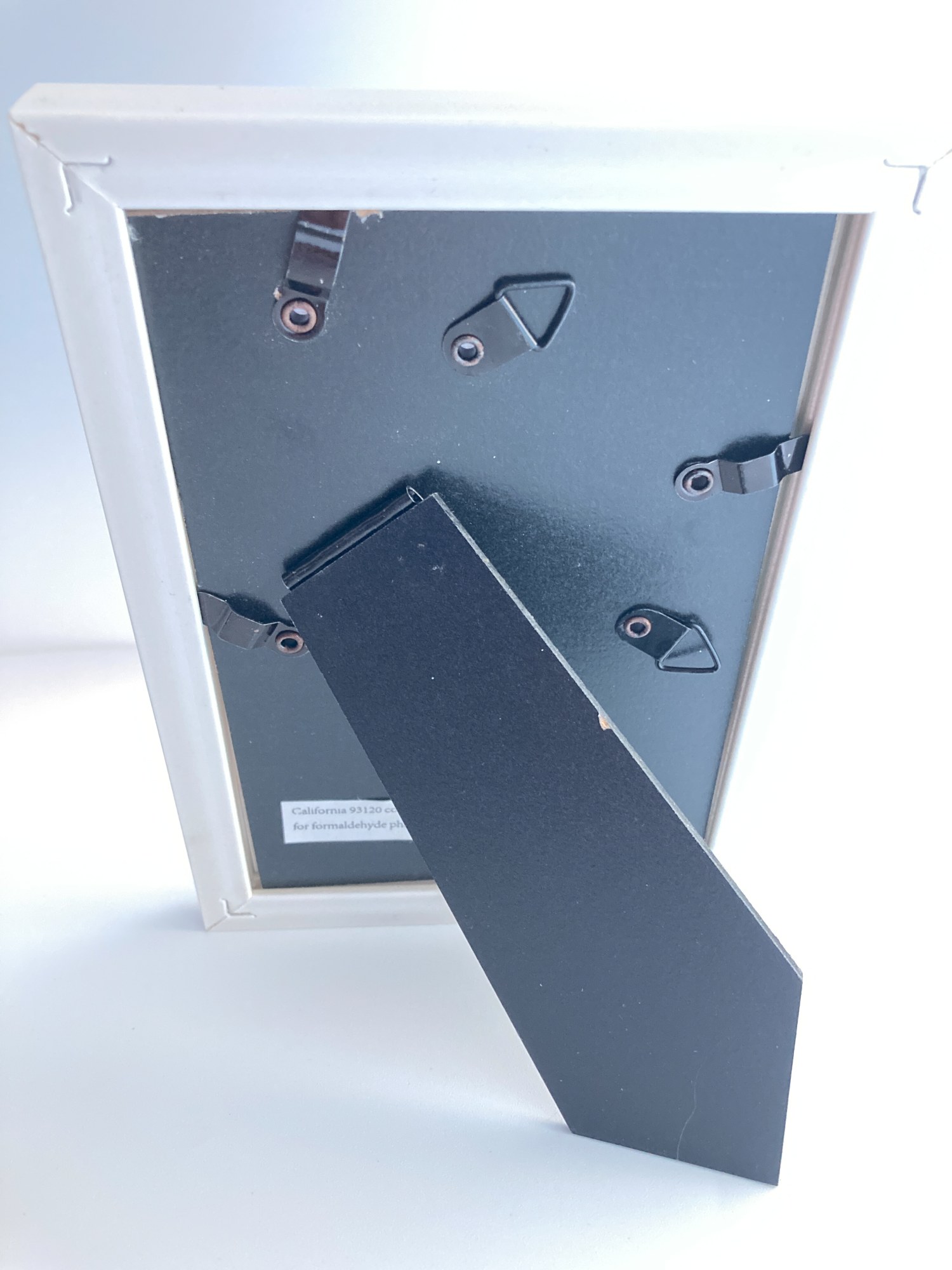 White wood frame with blue glass baby-themed decorations. Holds 6x4" photo.