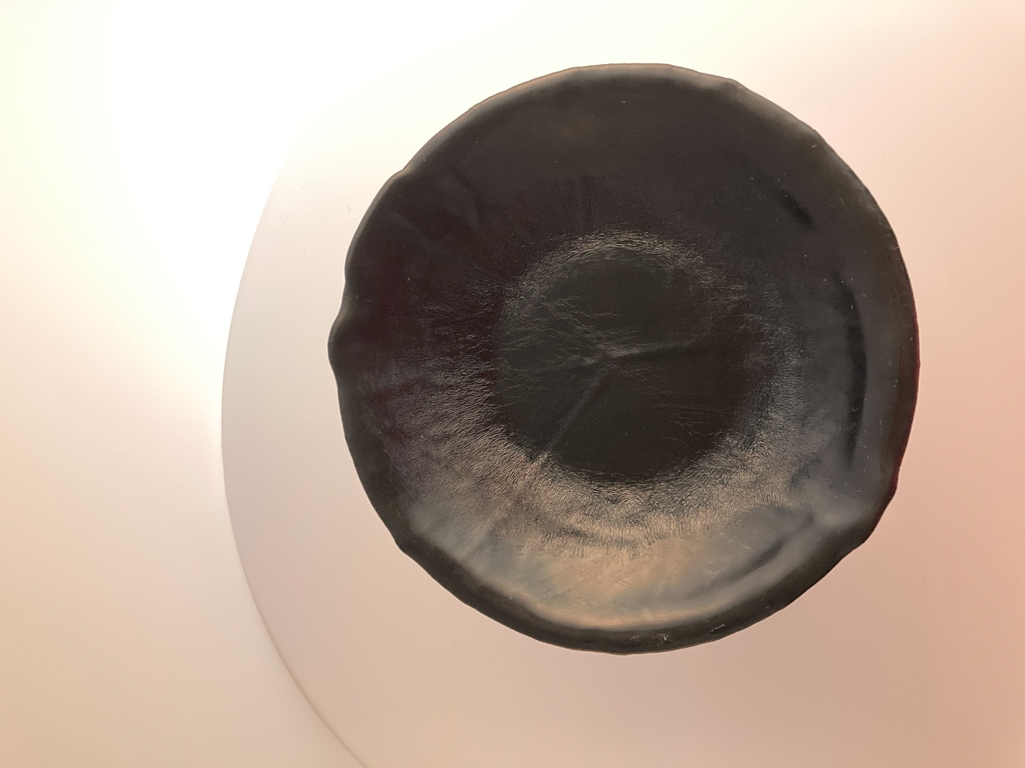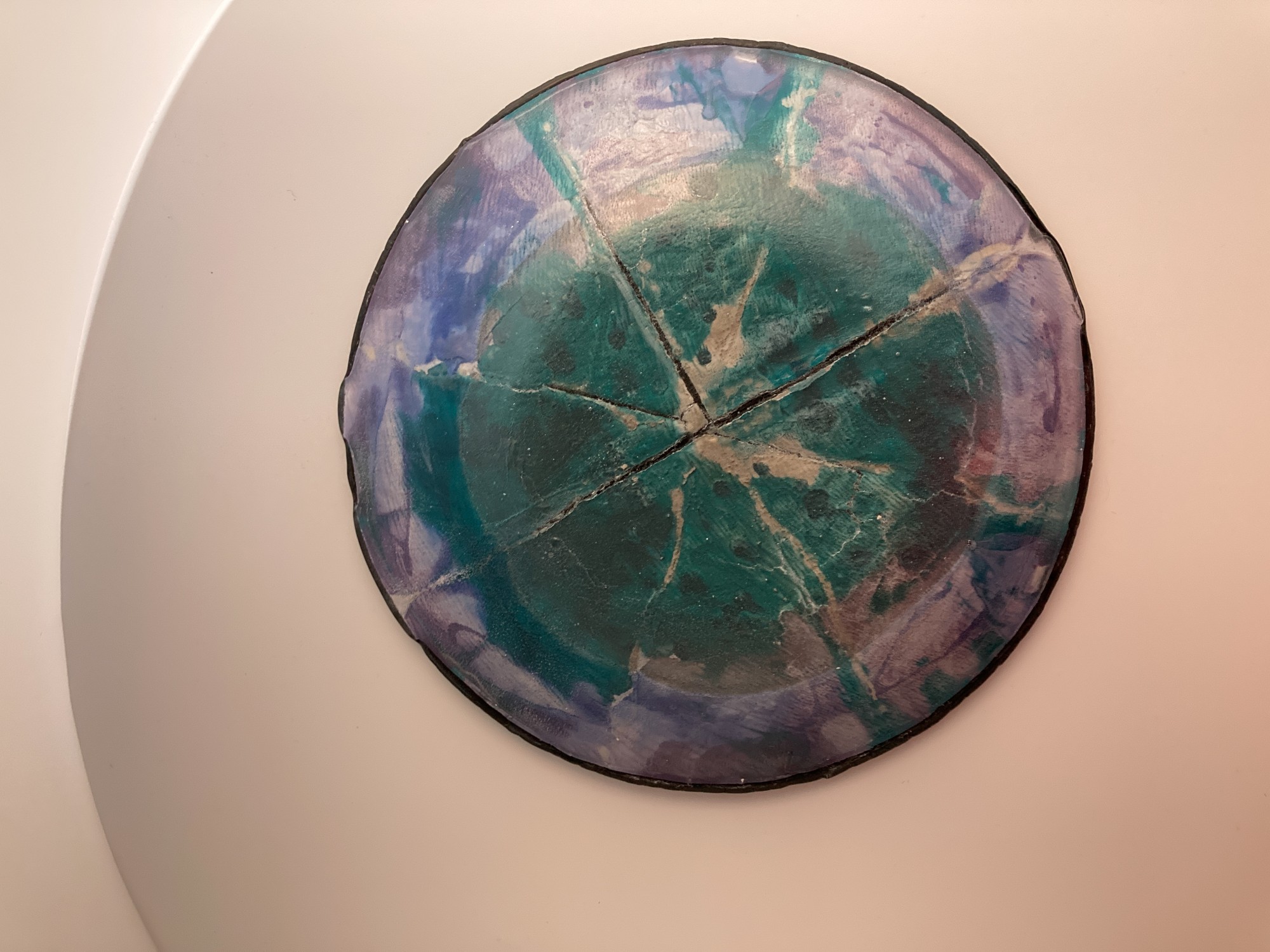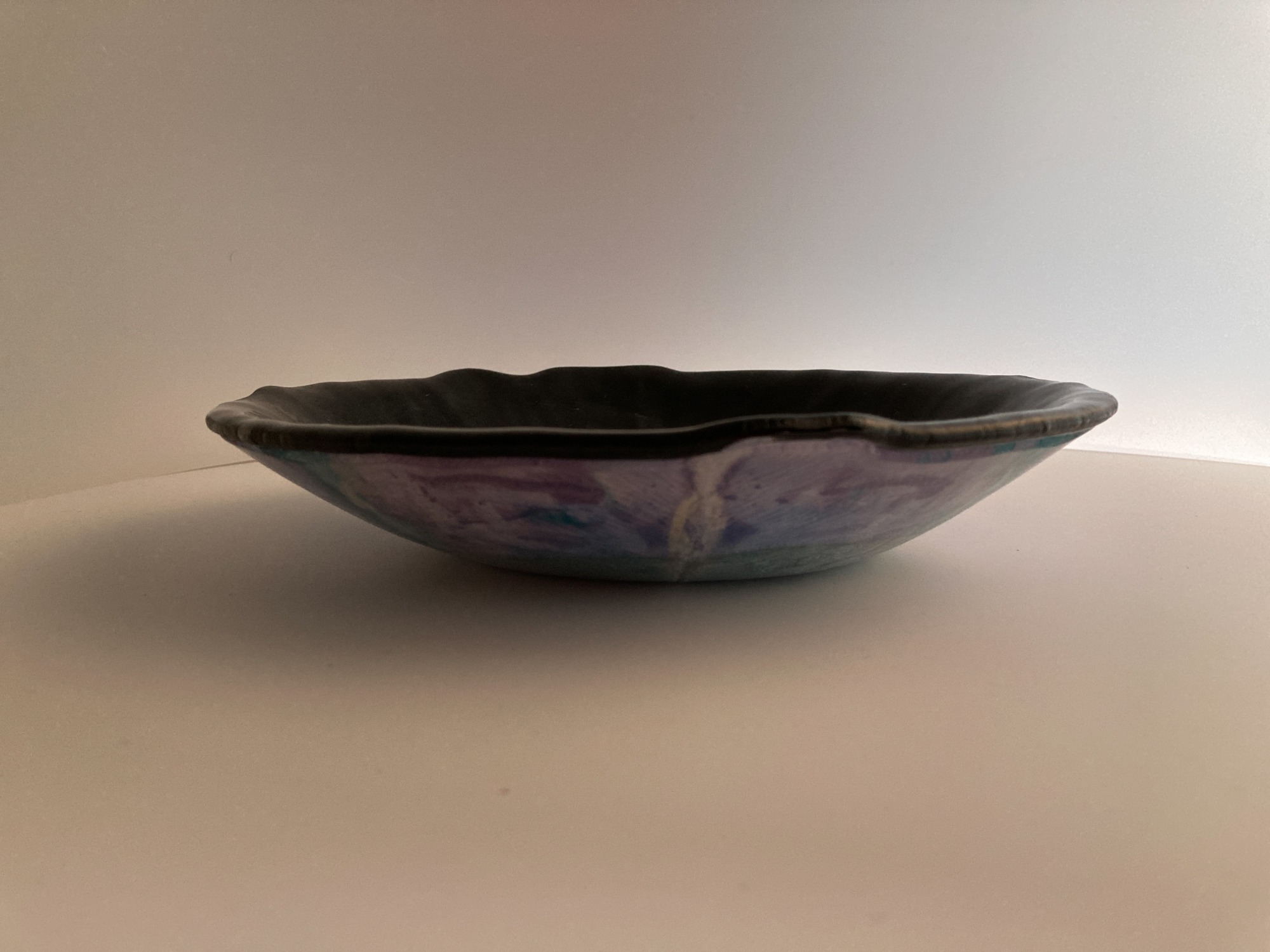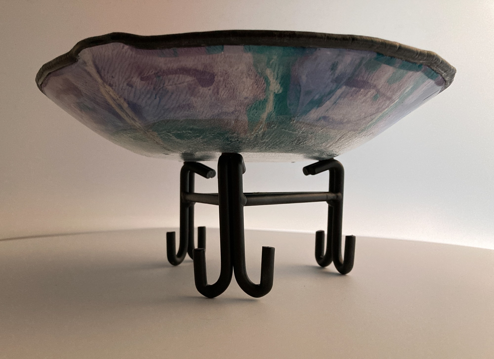 Display this unique piece on a high shelf to view the beauty of the teal and purple painted exterior. Matte black interior serves as a great counter to a colorful fruit display or salad. (Stand not included.)