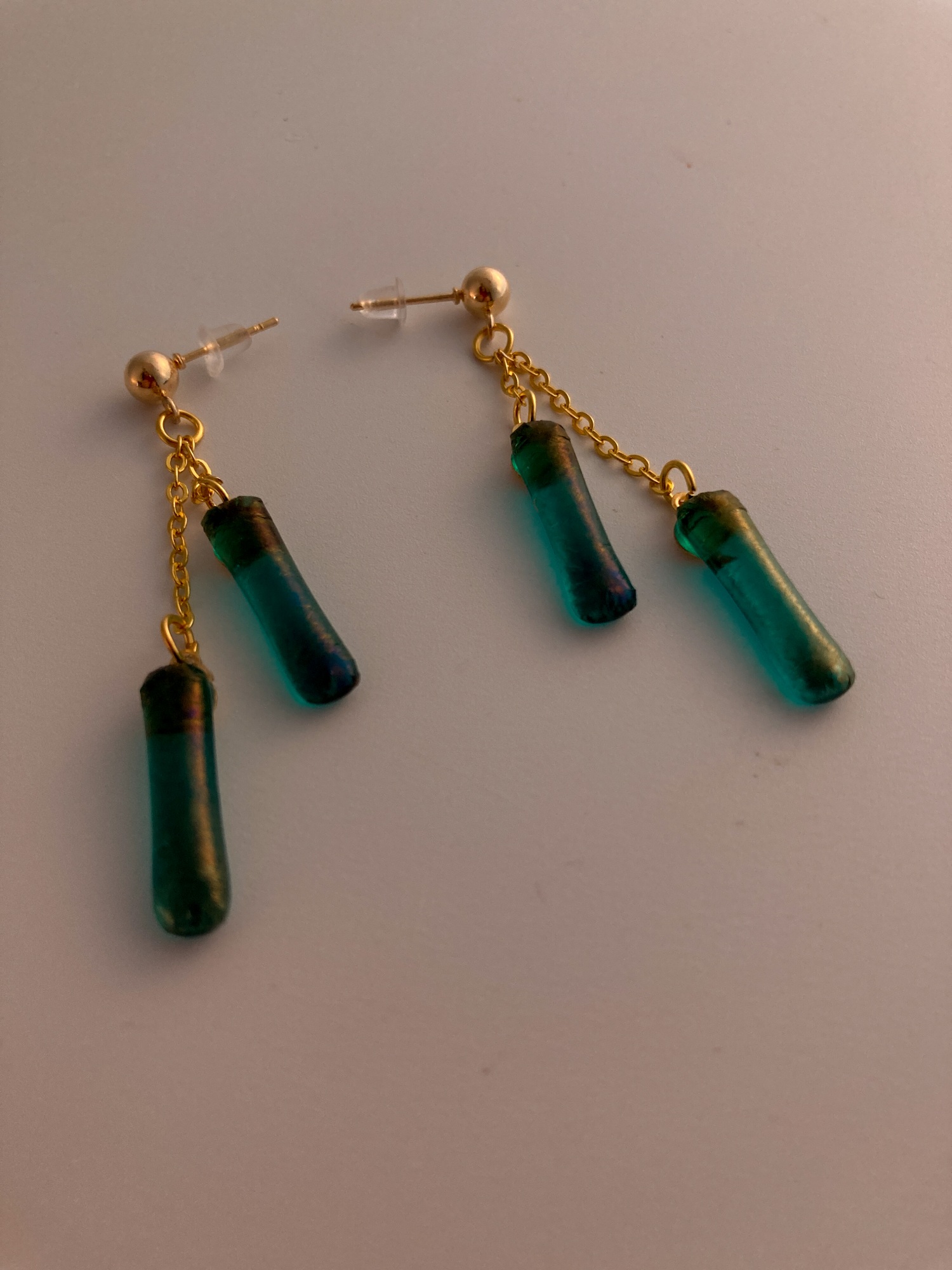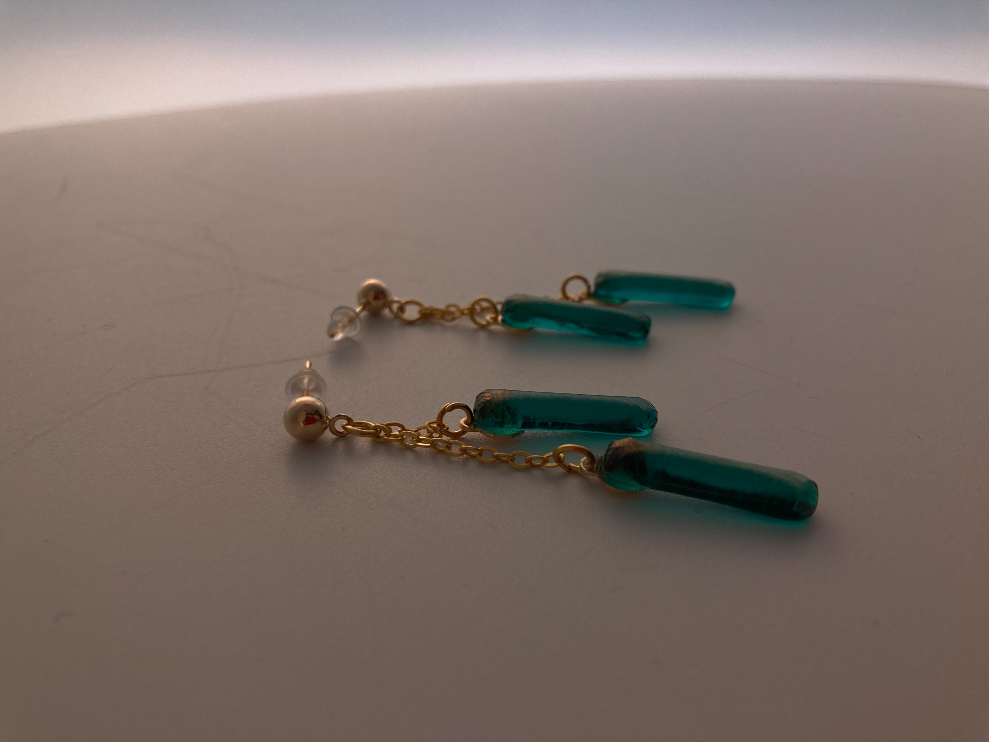 Double strung translucent peacock blue pierced earrings.