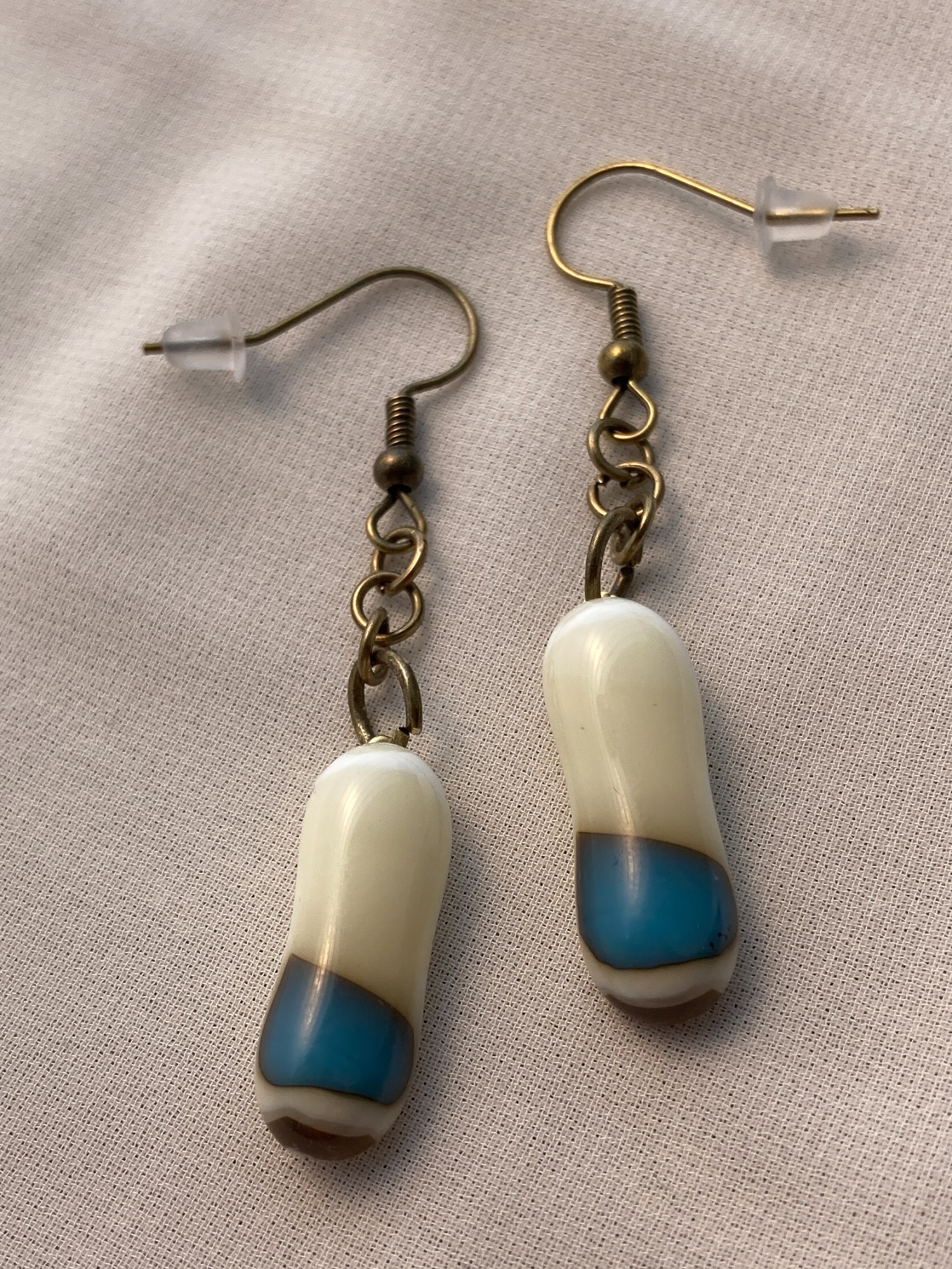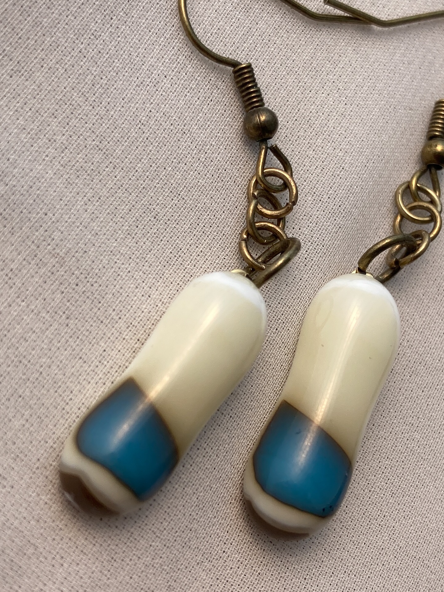 Reactive cream and calm blue hanging pierced earrings. 3/4 " glass bead. Brass ear wire.