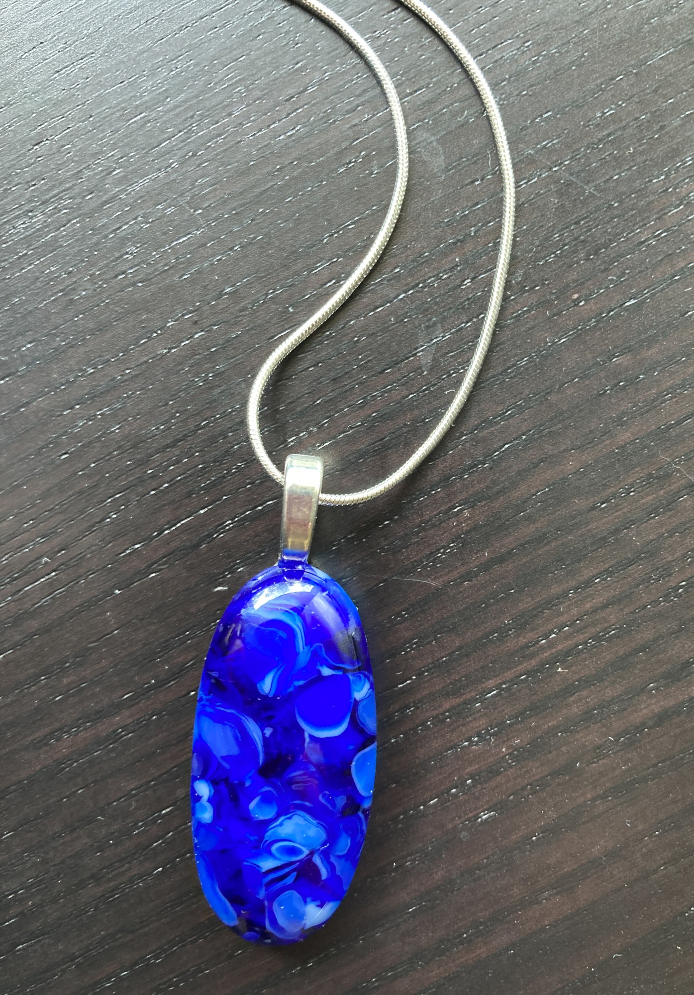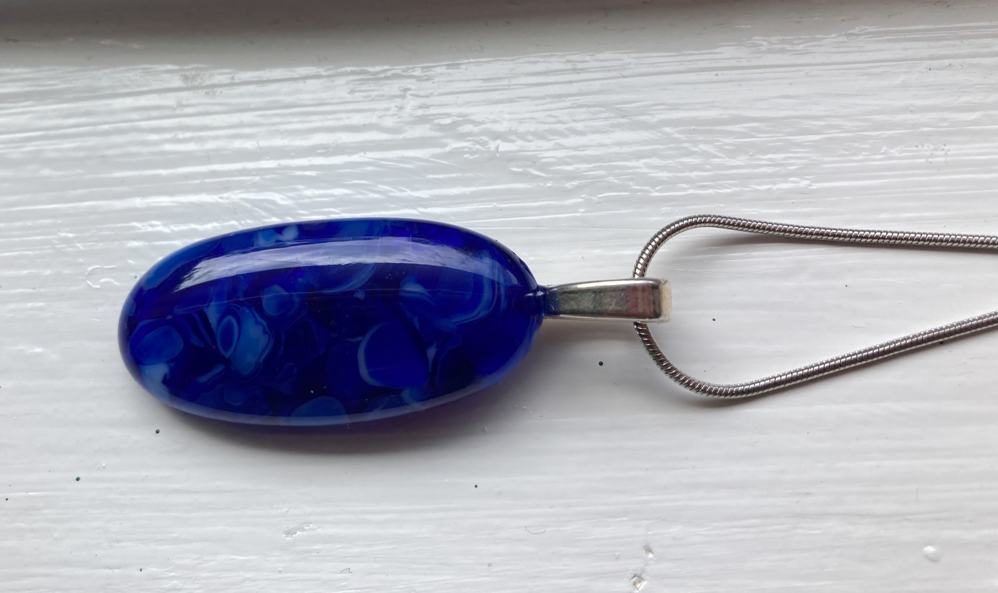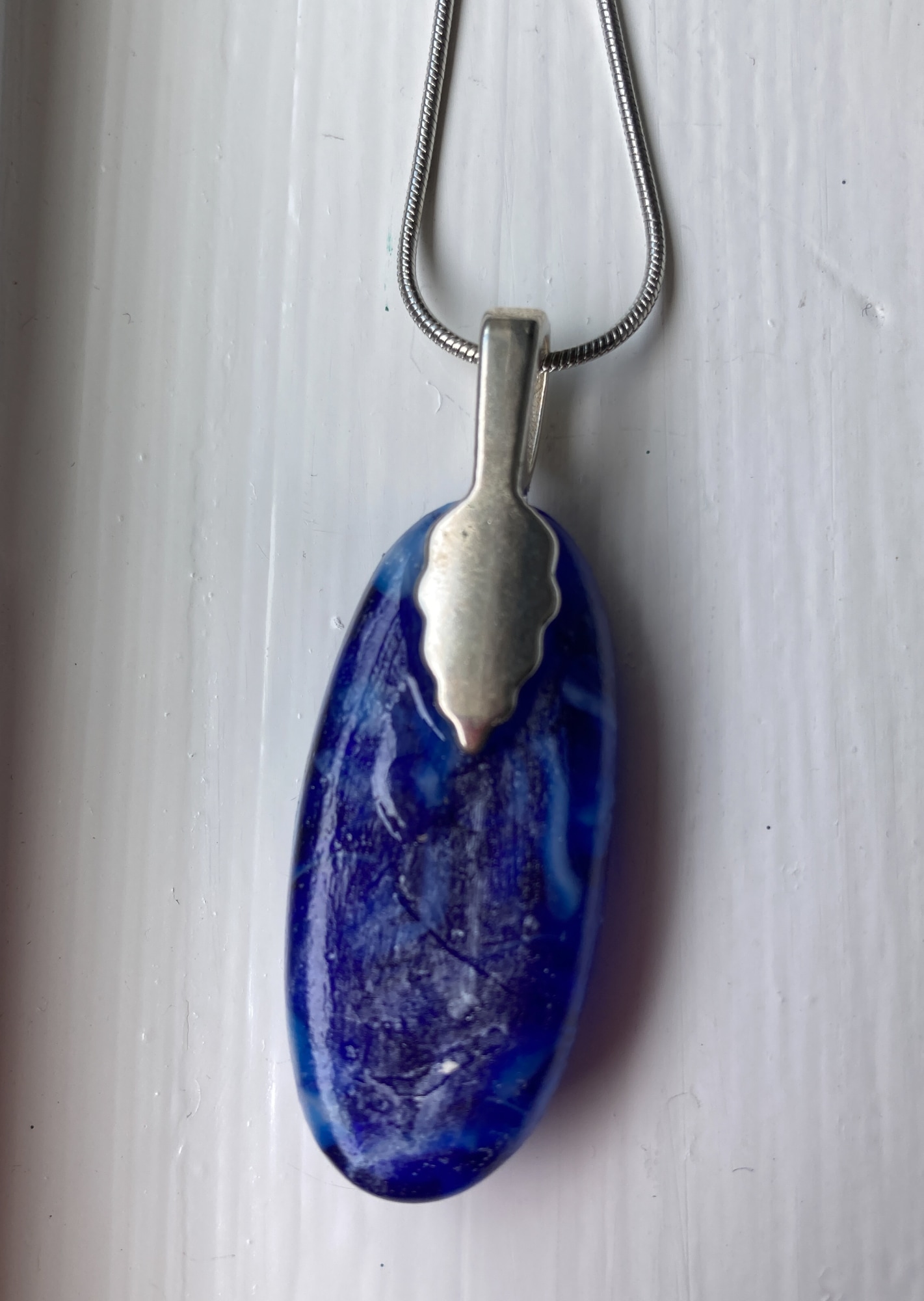 Caribbean blue/white opal glass, 1.5" elongated pendant on 16" silver plated chain.