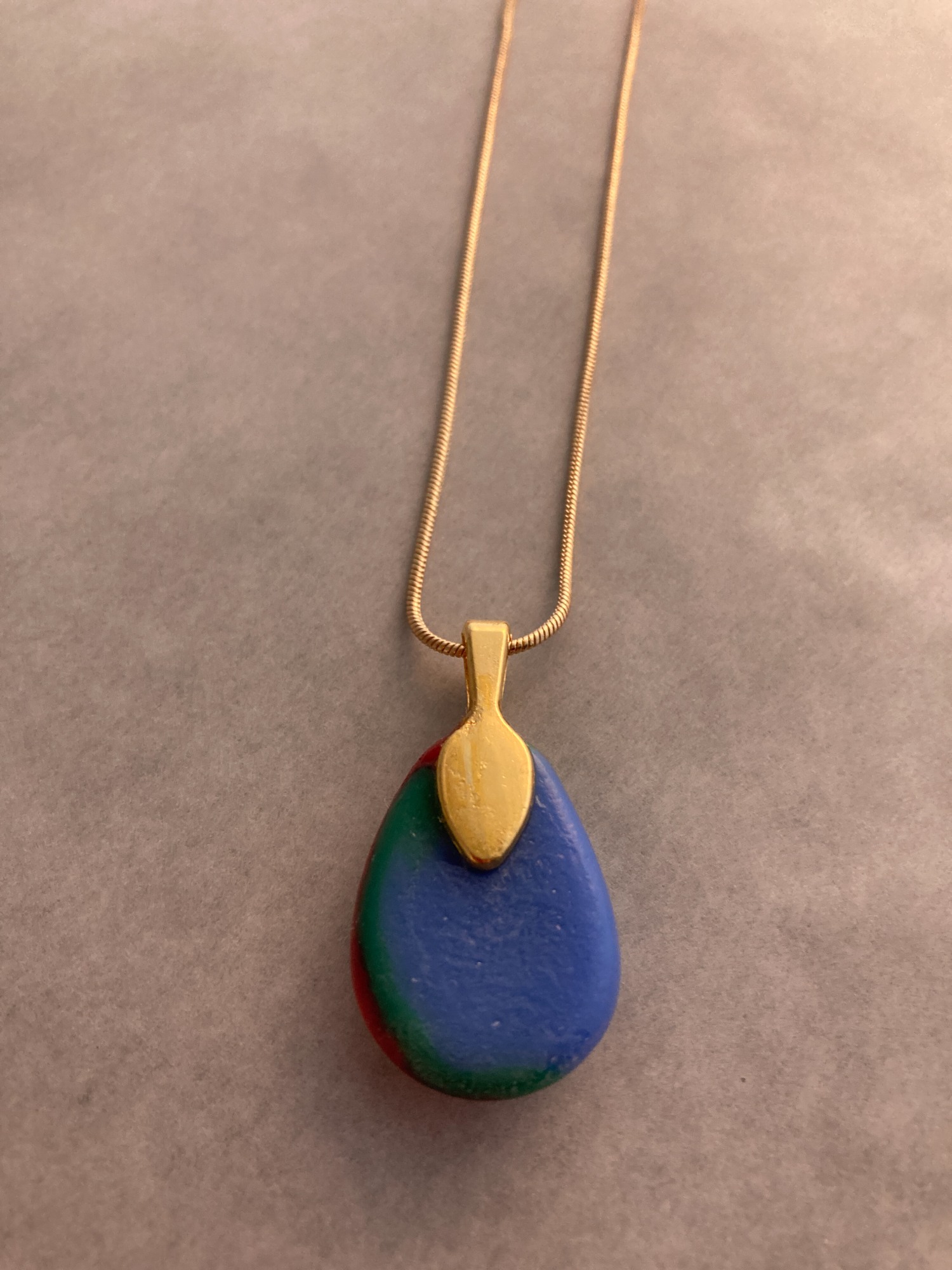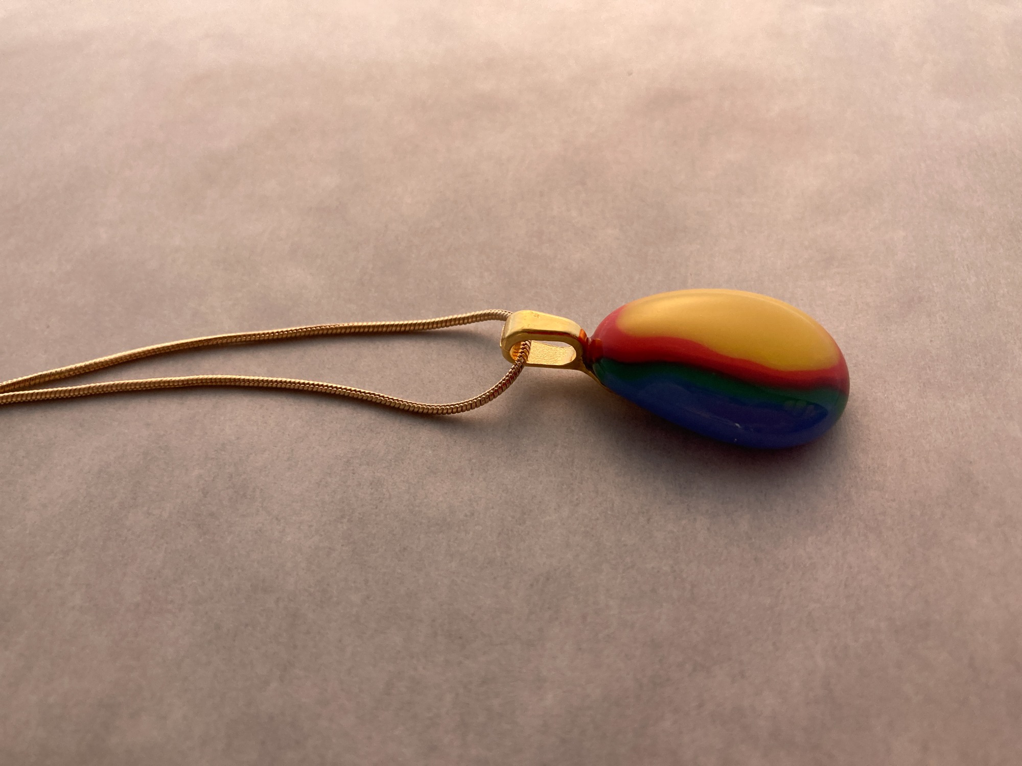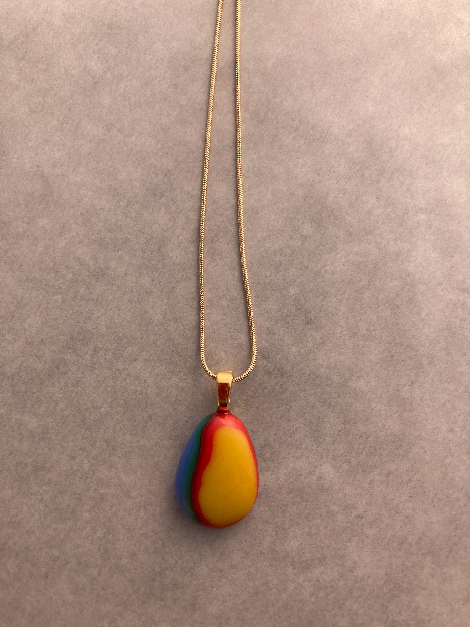 Fun rainbow drop pendant with gold plated and 16" snake chain. Puddle Glass.