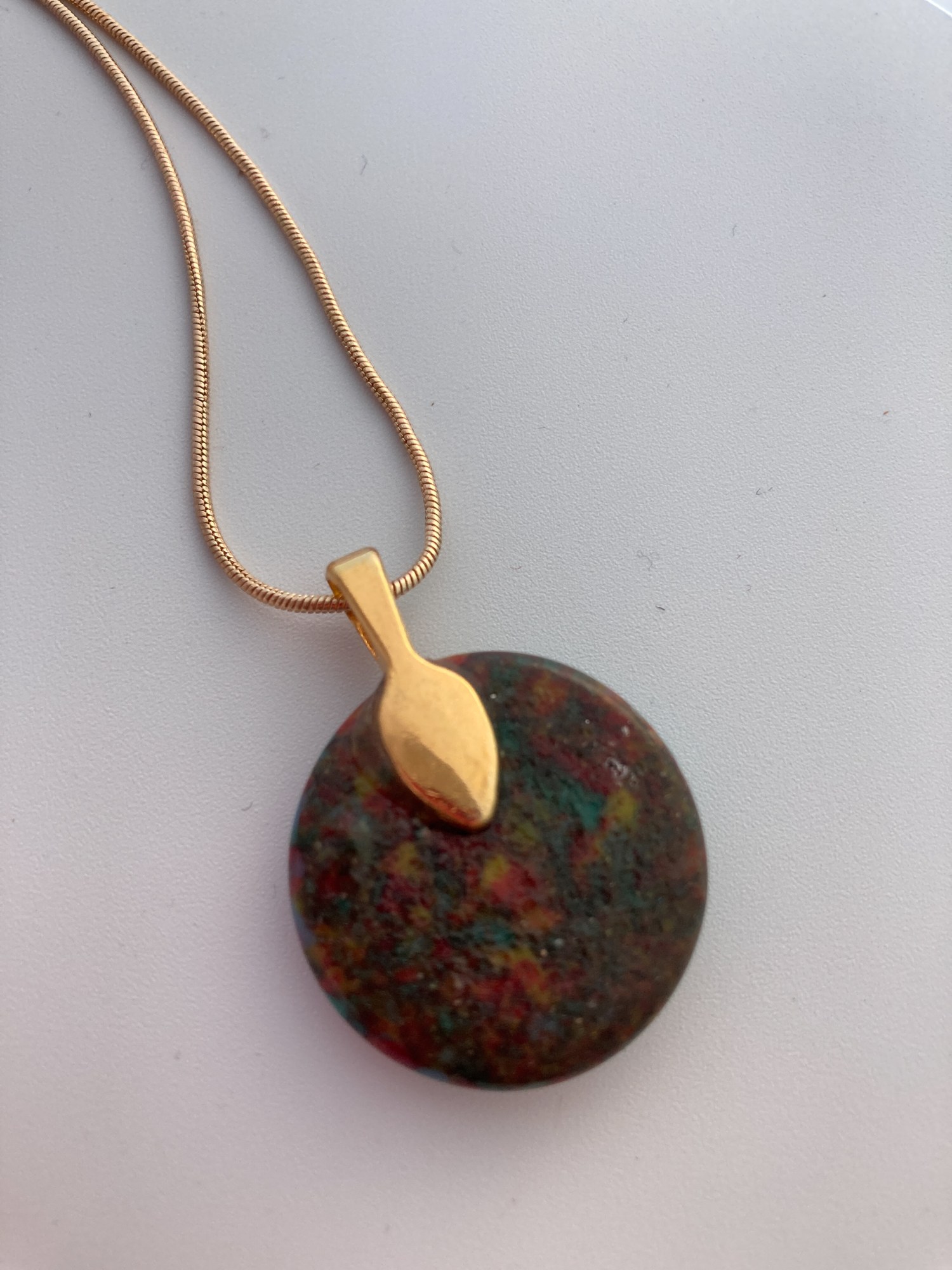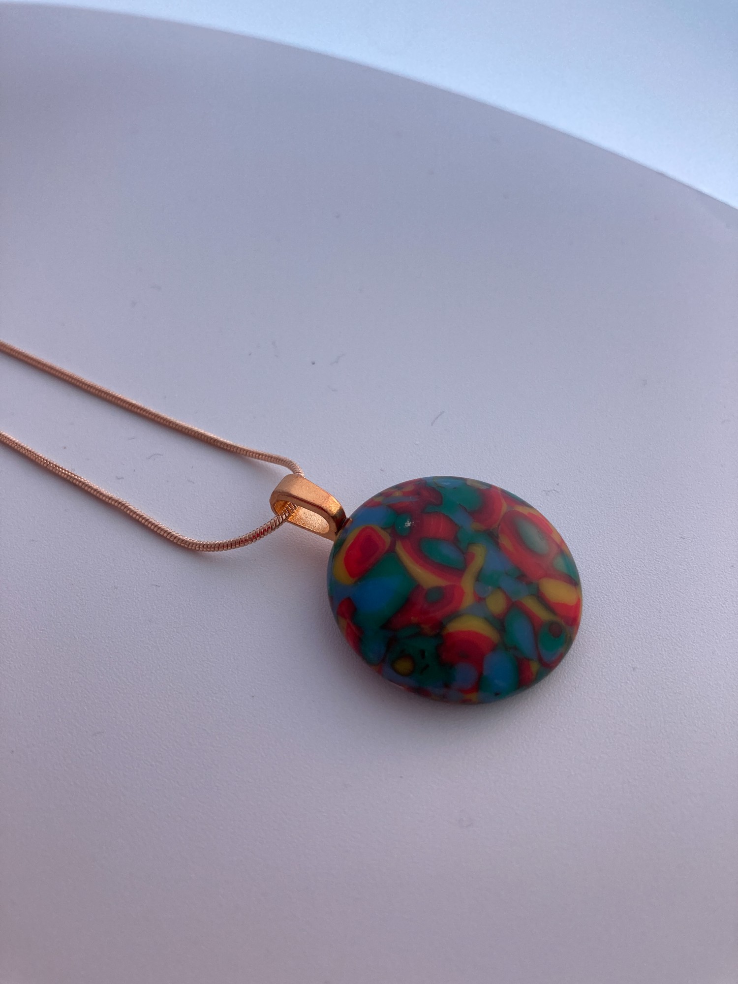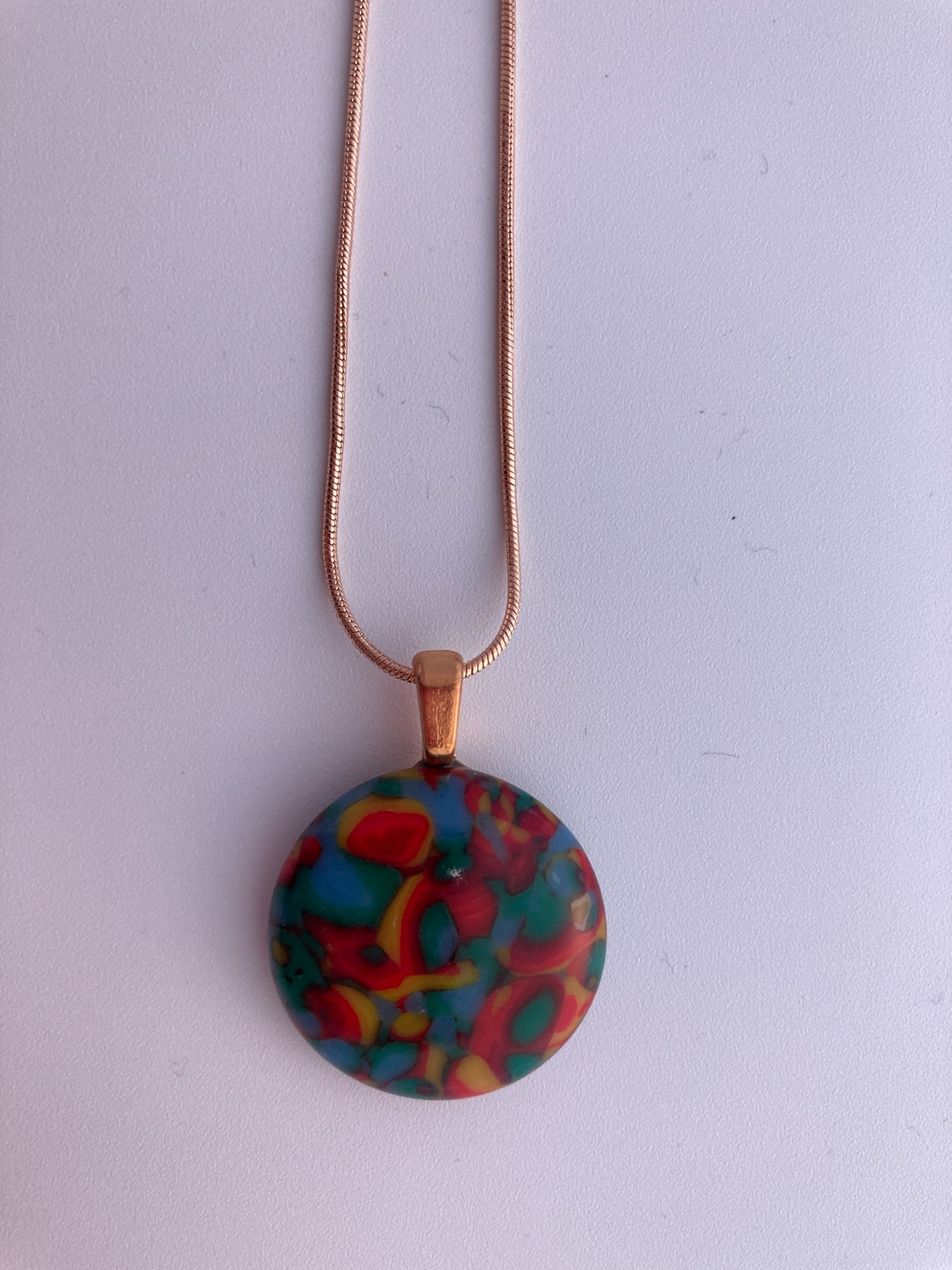 1" medallion bursting with carnival colors. A match for any outfit. 16" chain.