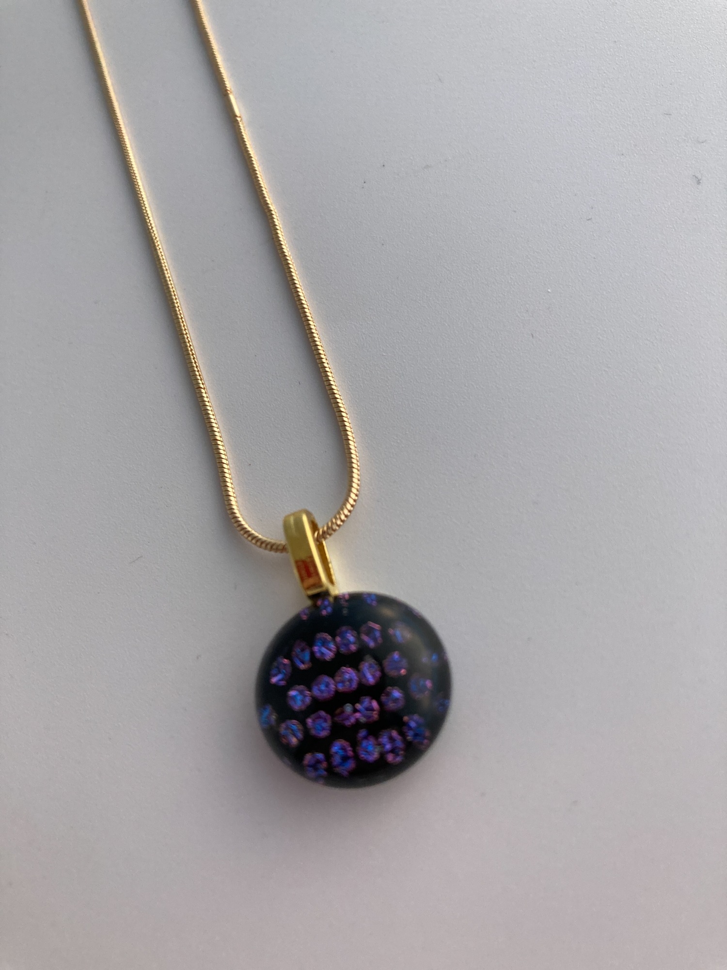 Dichroic purple spots sparkle on this small black ball pendant. Perfect for evening wear or that special occasion.
