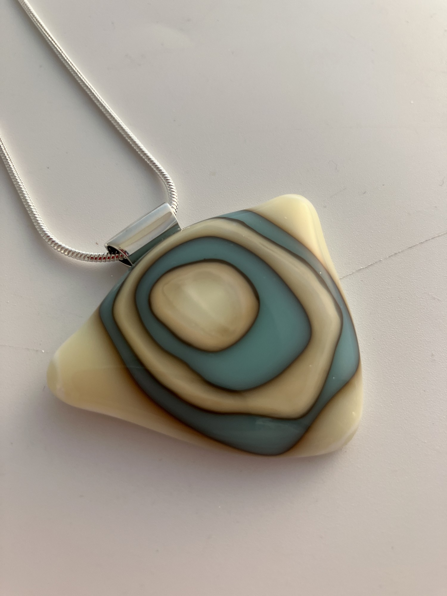 Reactive french vanilla and robin's egg blue glass pendant. 16" chain.