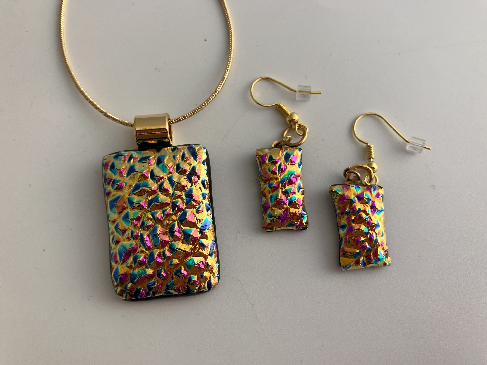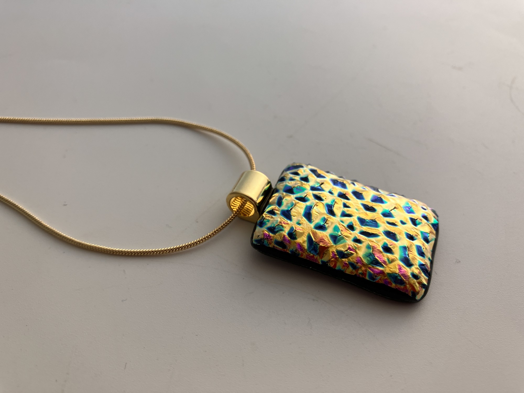 Iridescent shapes add texture and sparkle to this golden pendant.
