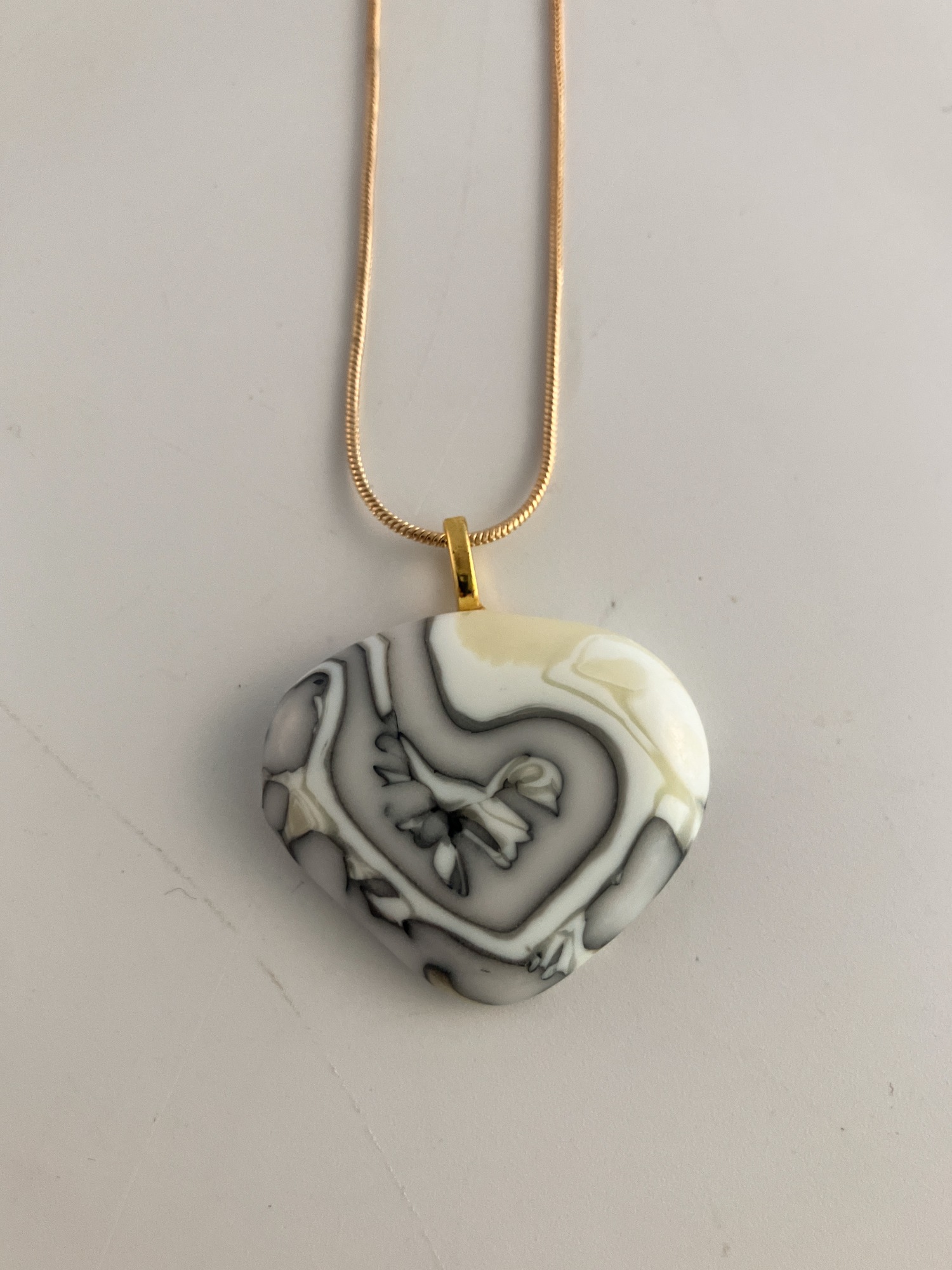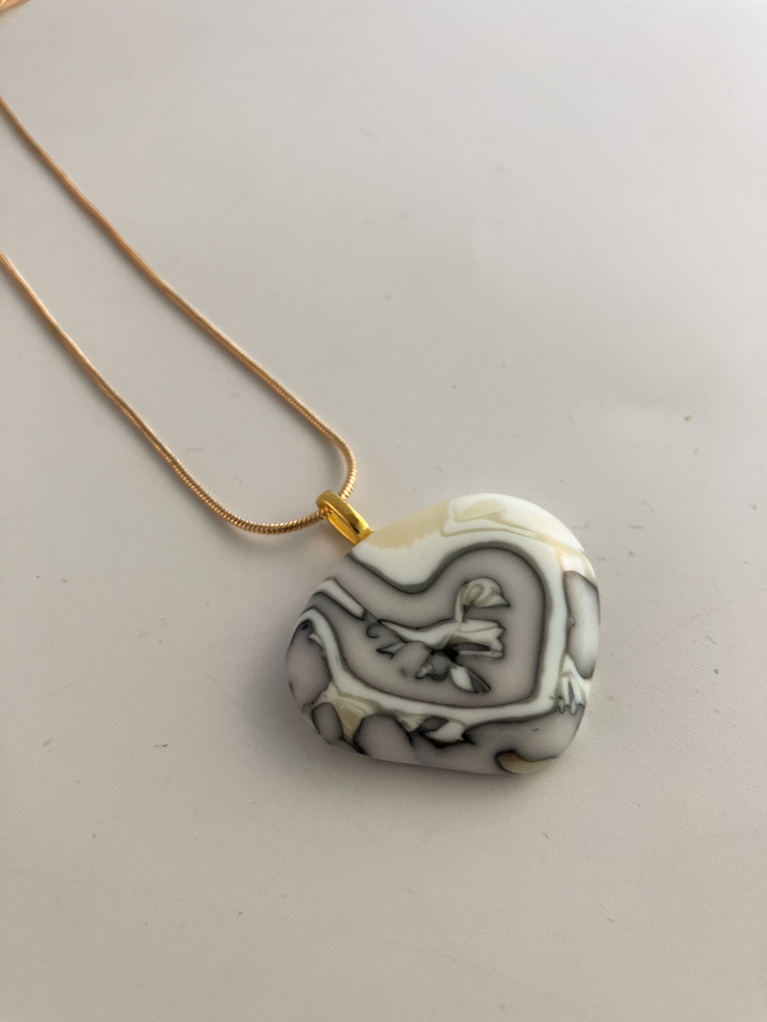 Dense white glass reacts with the sunny french vanilla glass in this heart-shaped pendant.