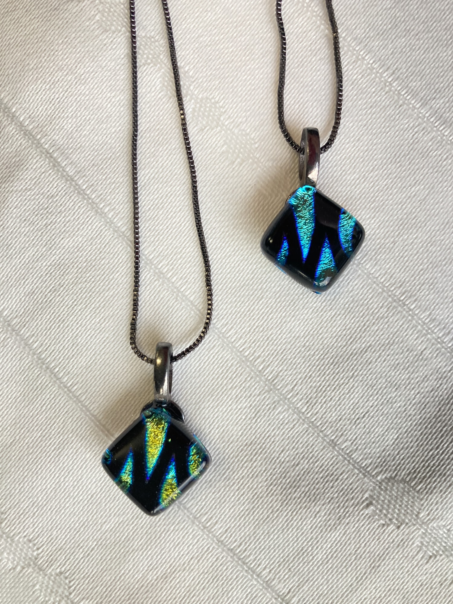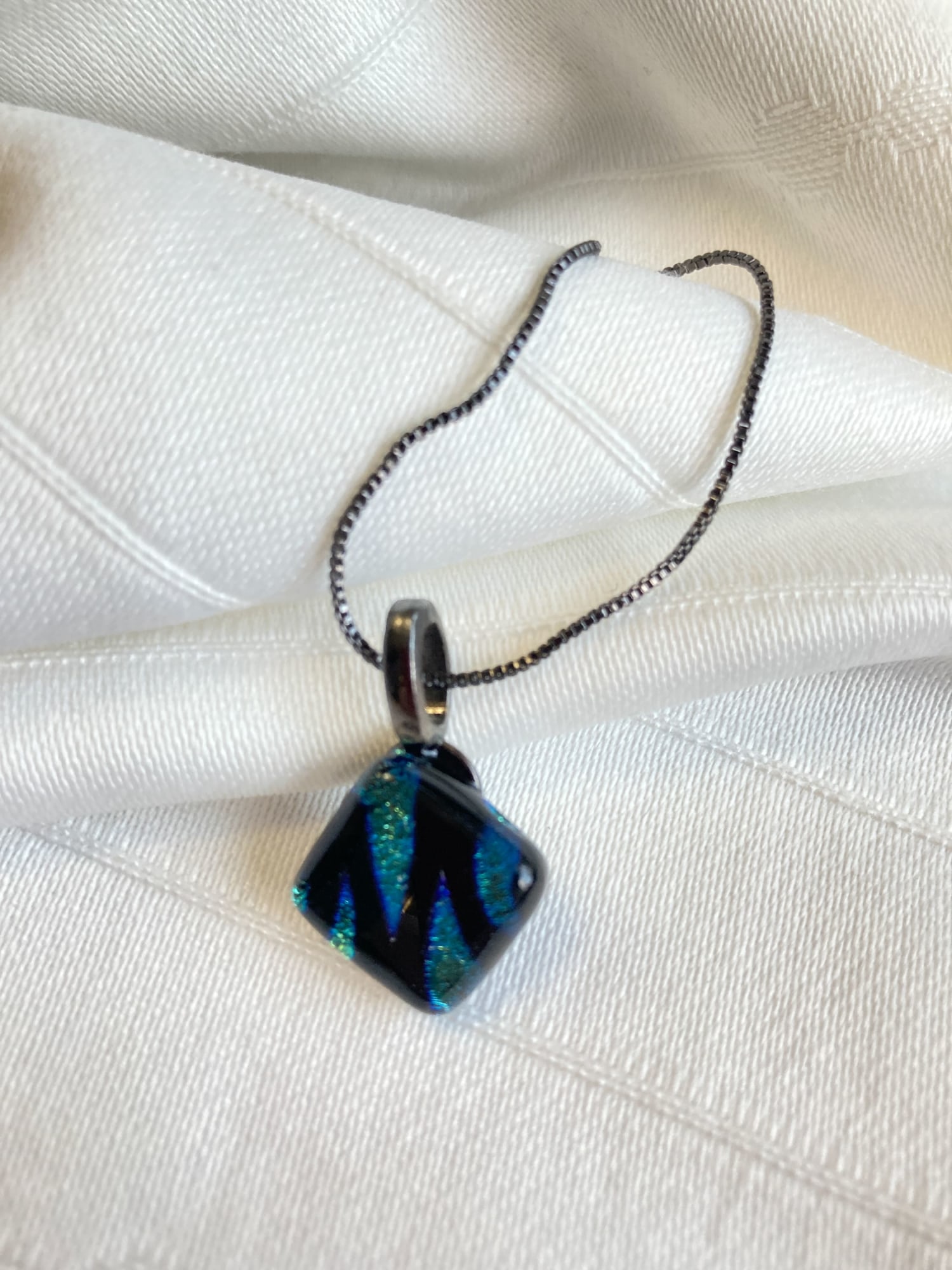 Teal and black dichroic pendant. 16" silver-plated chain.