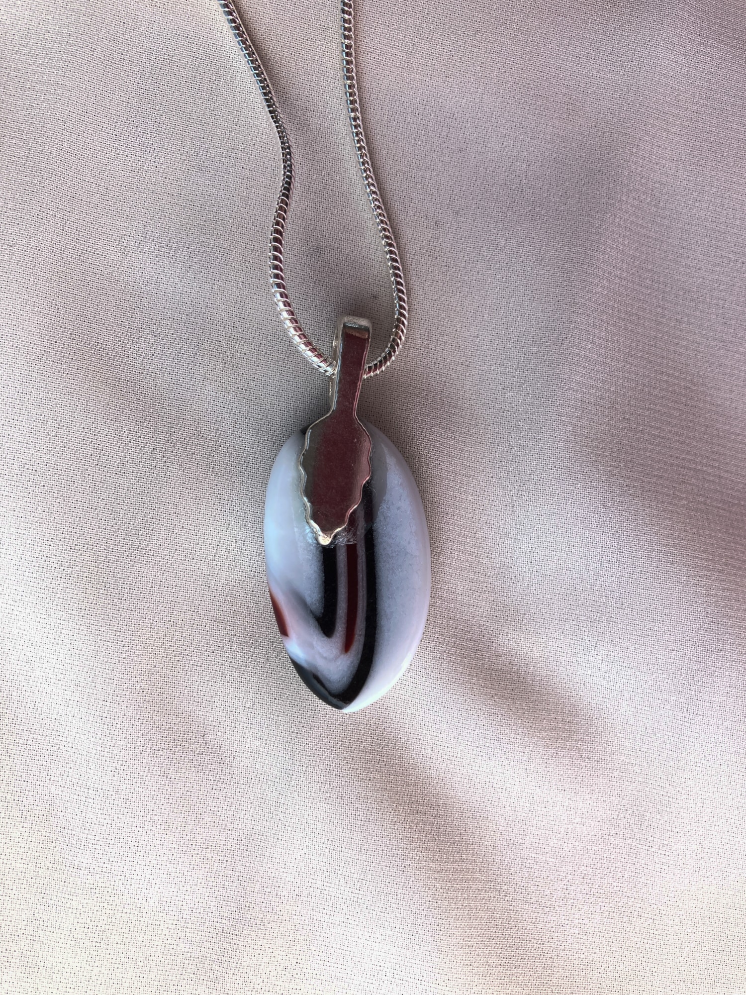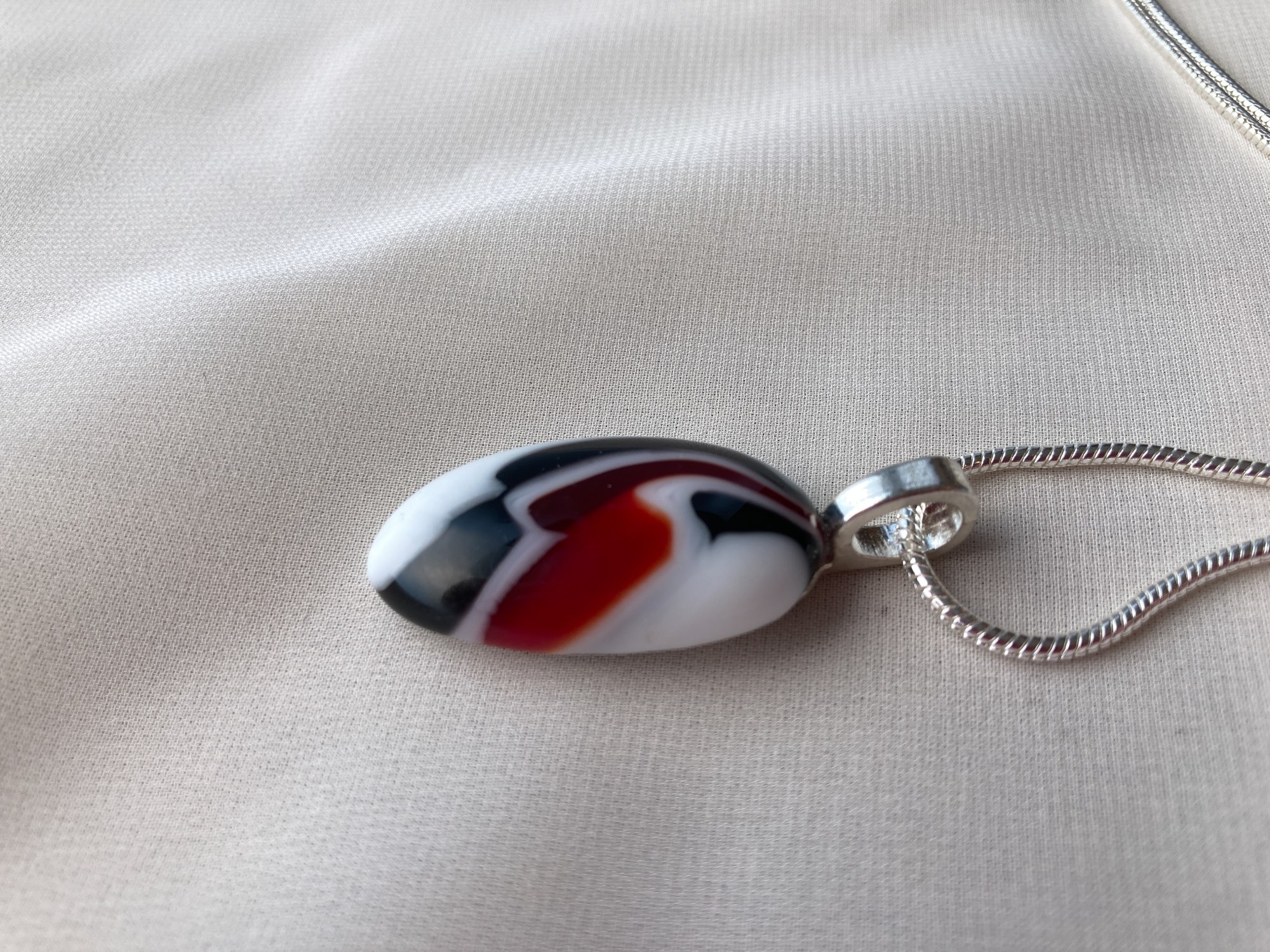 Striated red, white and black glass pendant (1.25") with silver bale and 16" chain. Puddle glass.
