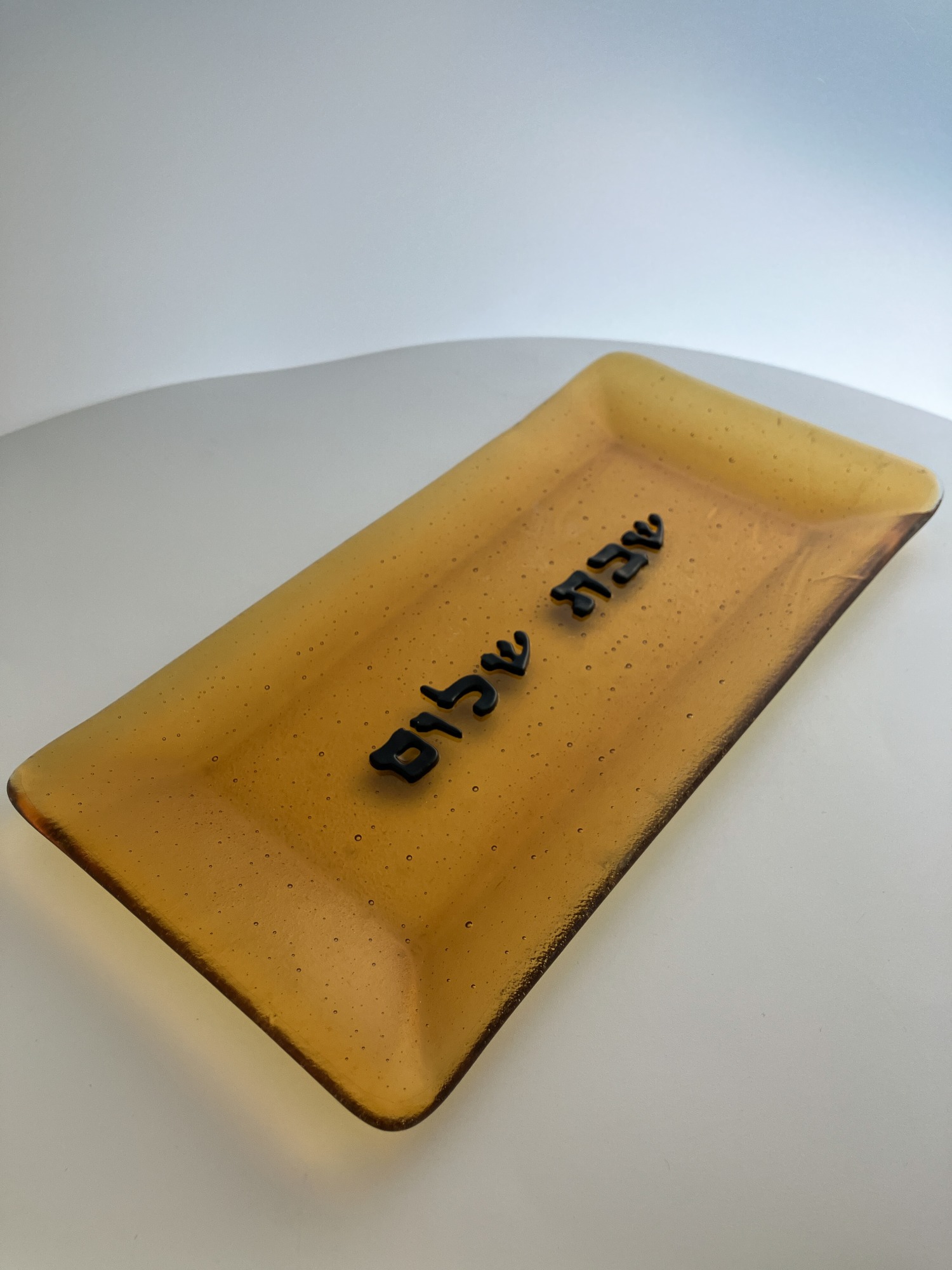 Transparent honey-colored glass dish with raised black lettering (Shabbat Shalom in Hebrew). Lovely addition to your holiday table.
