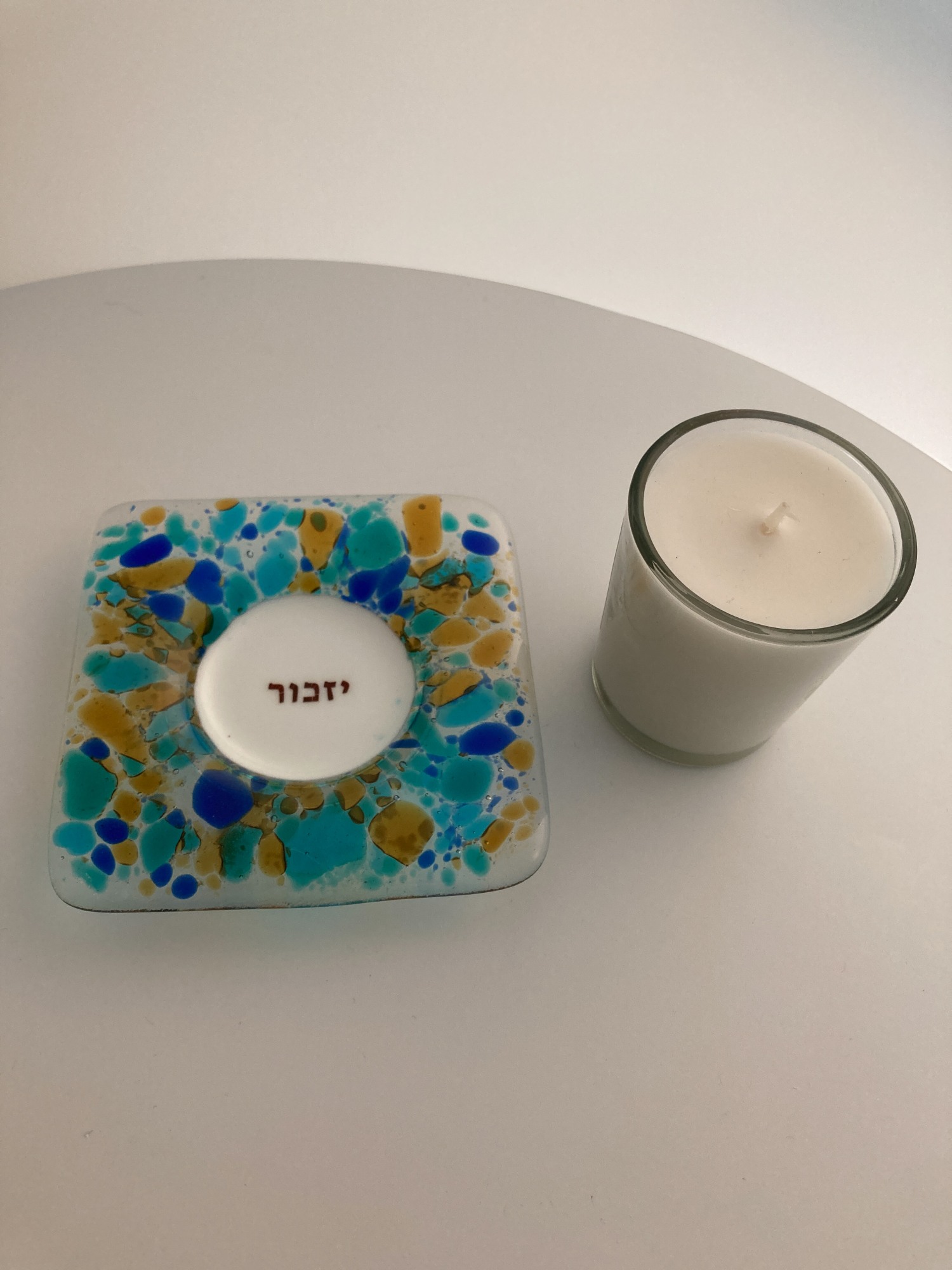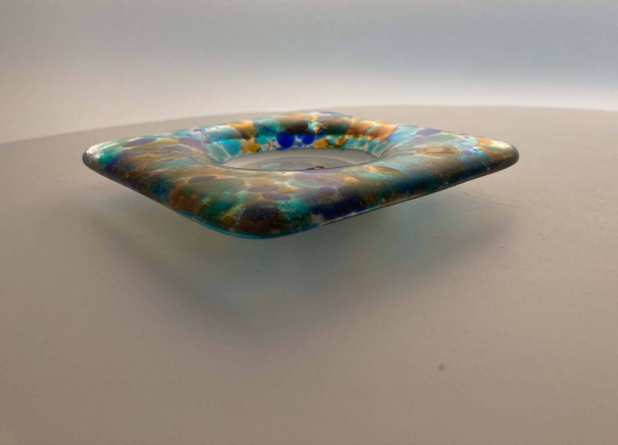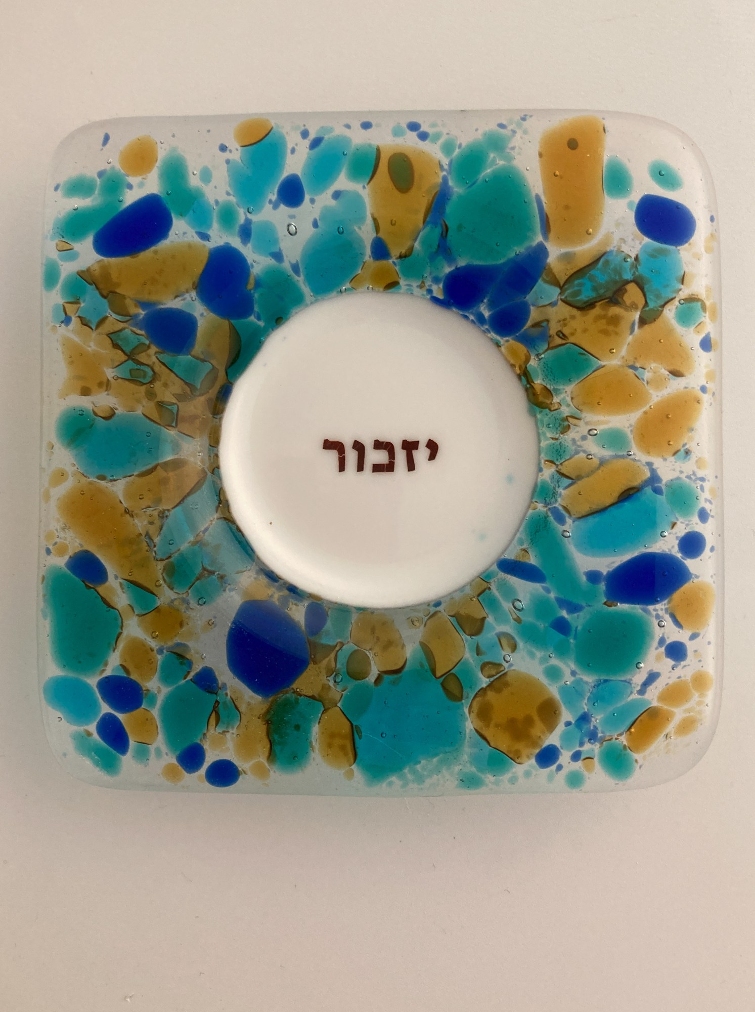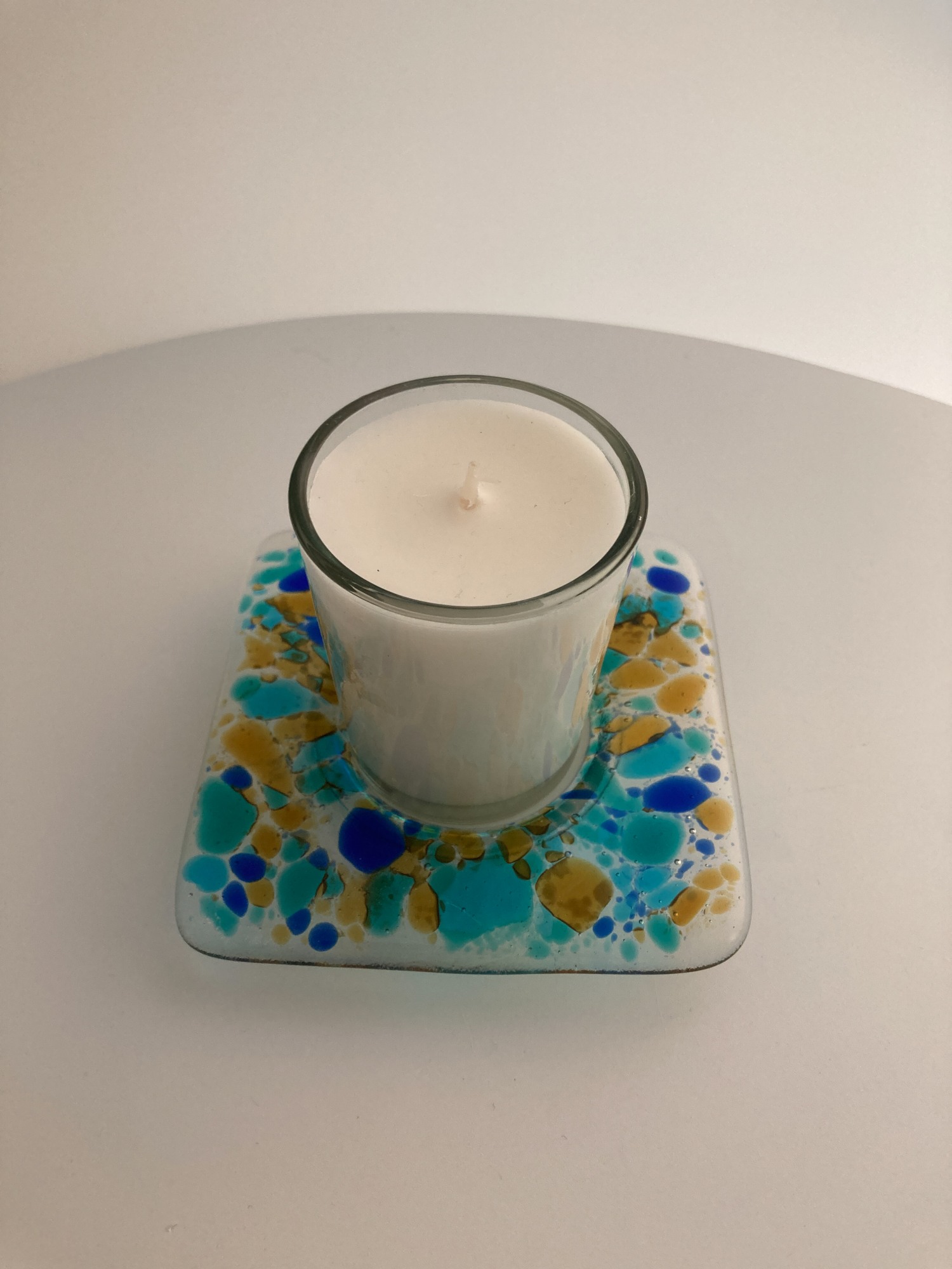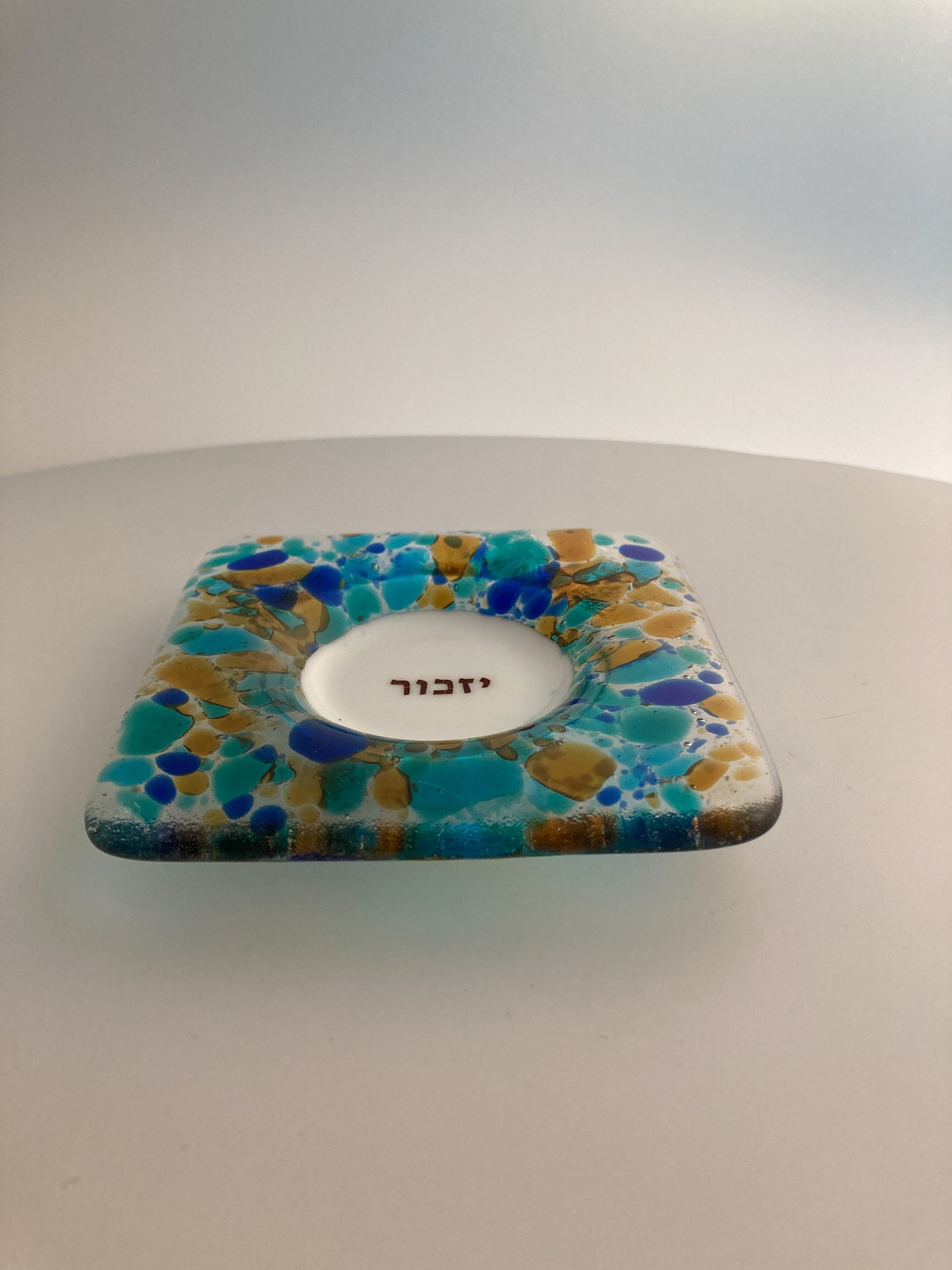 Crushed glass, peacock blue mix frames this 4" memorial plate candle holder for one.