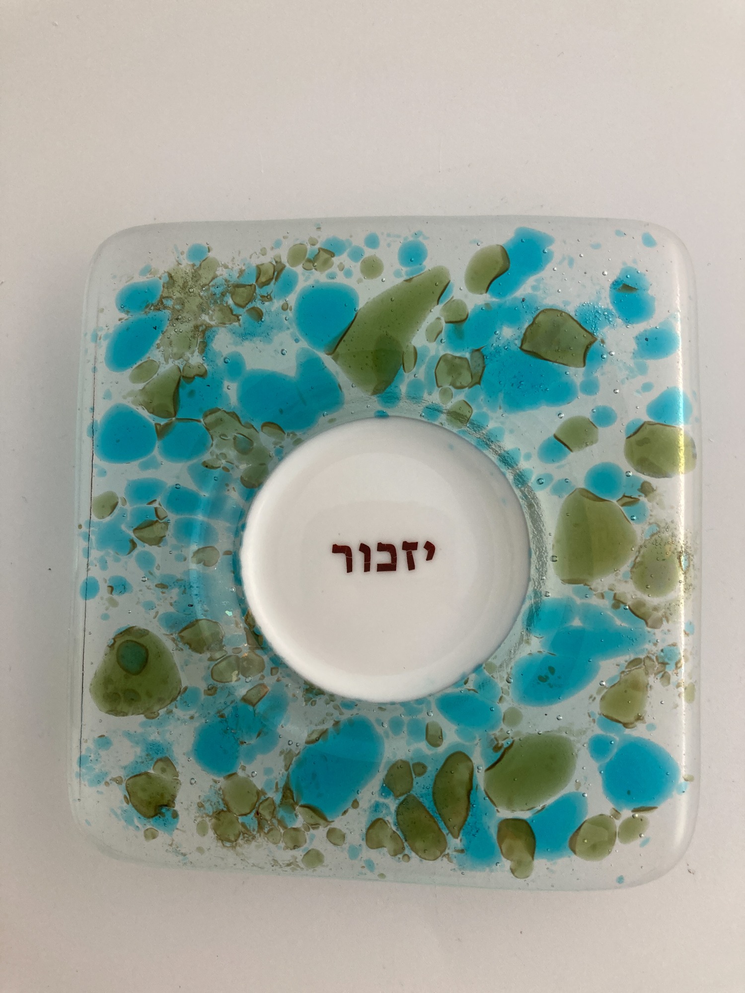 A crushed glass, green and turquoise mix frames this 4" memorial plate candle holder for one.
