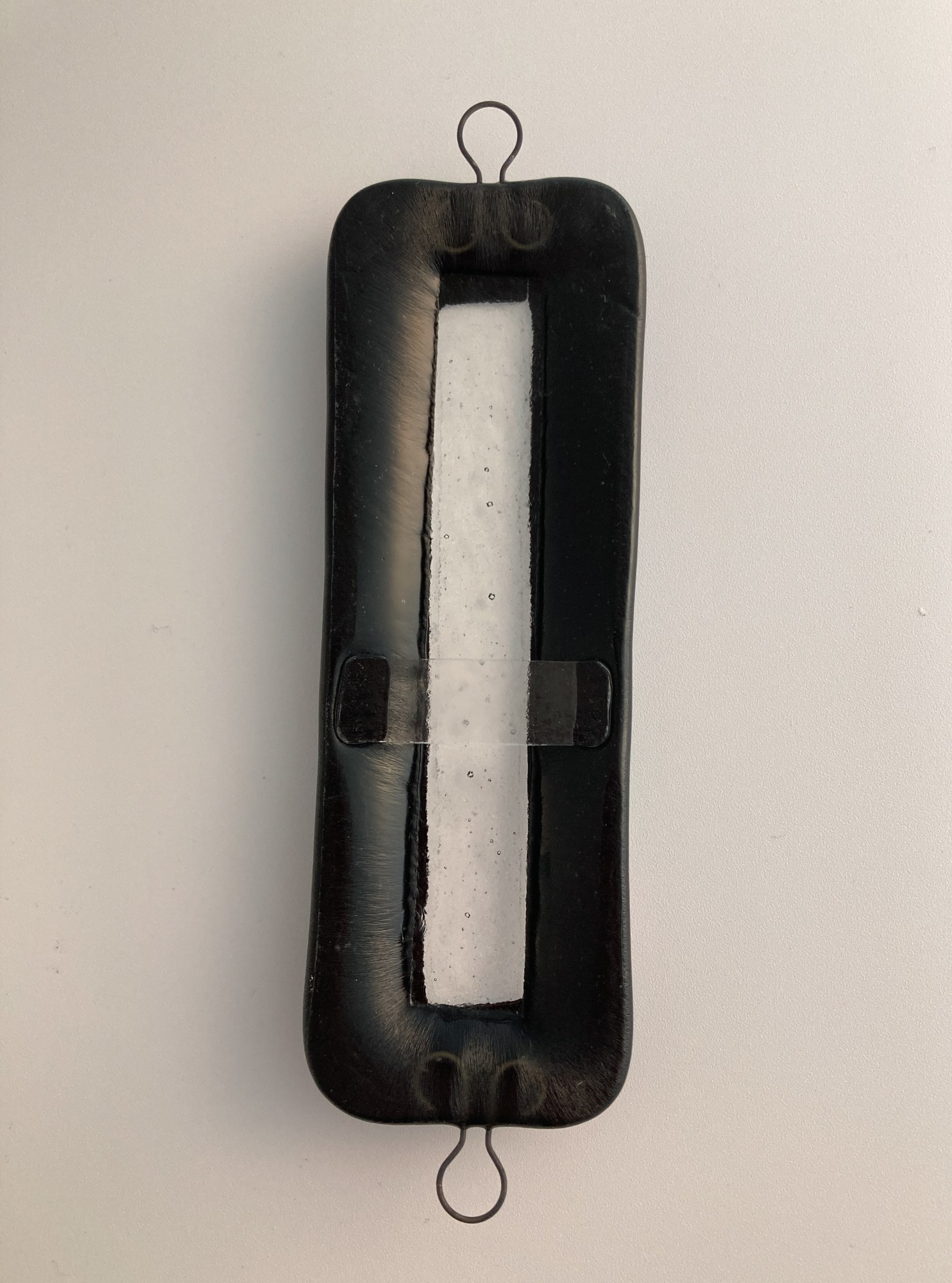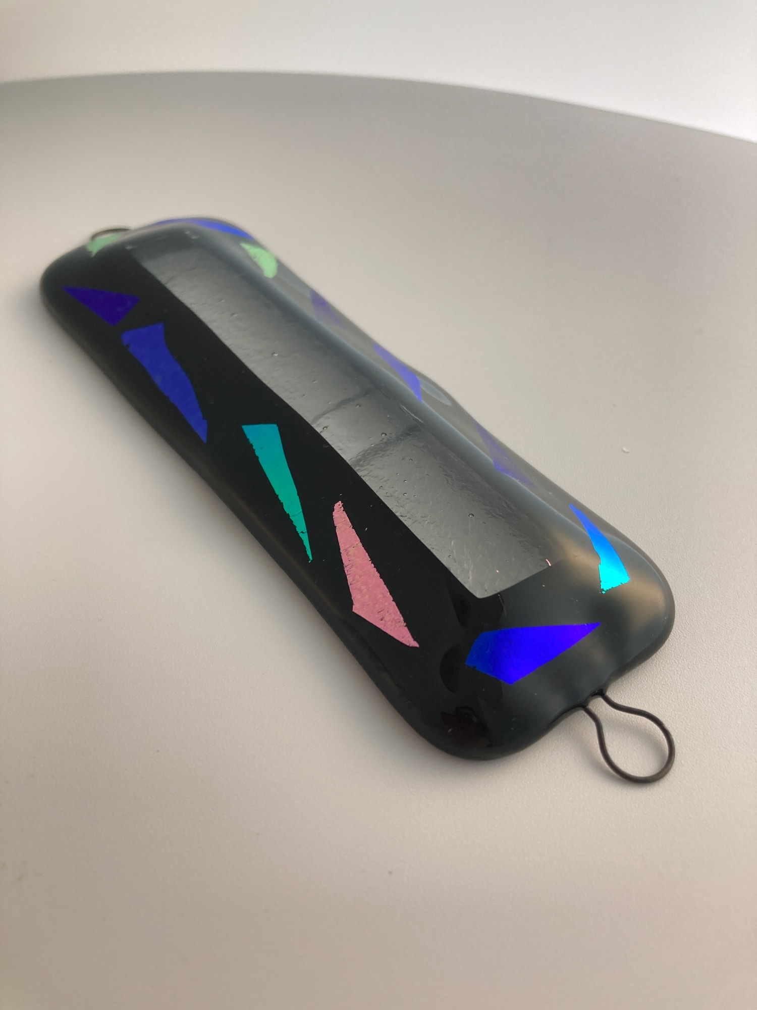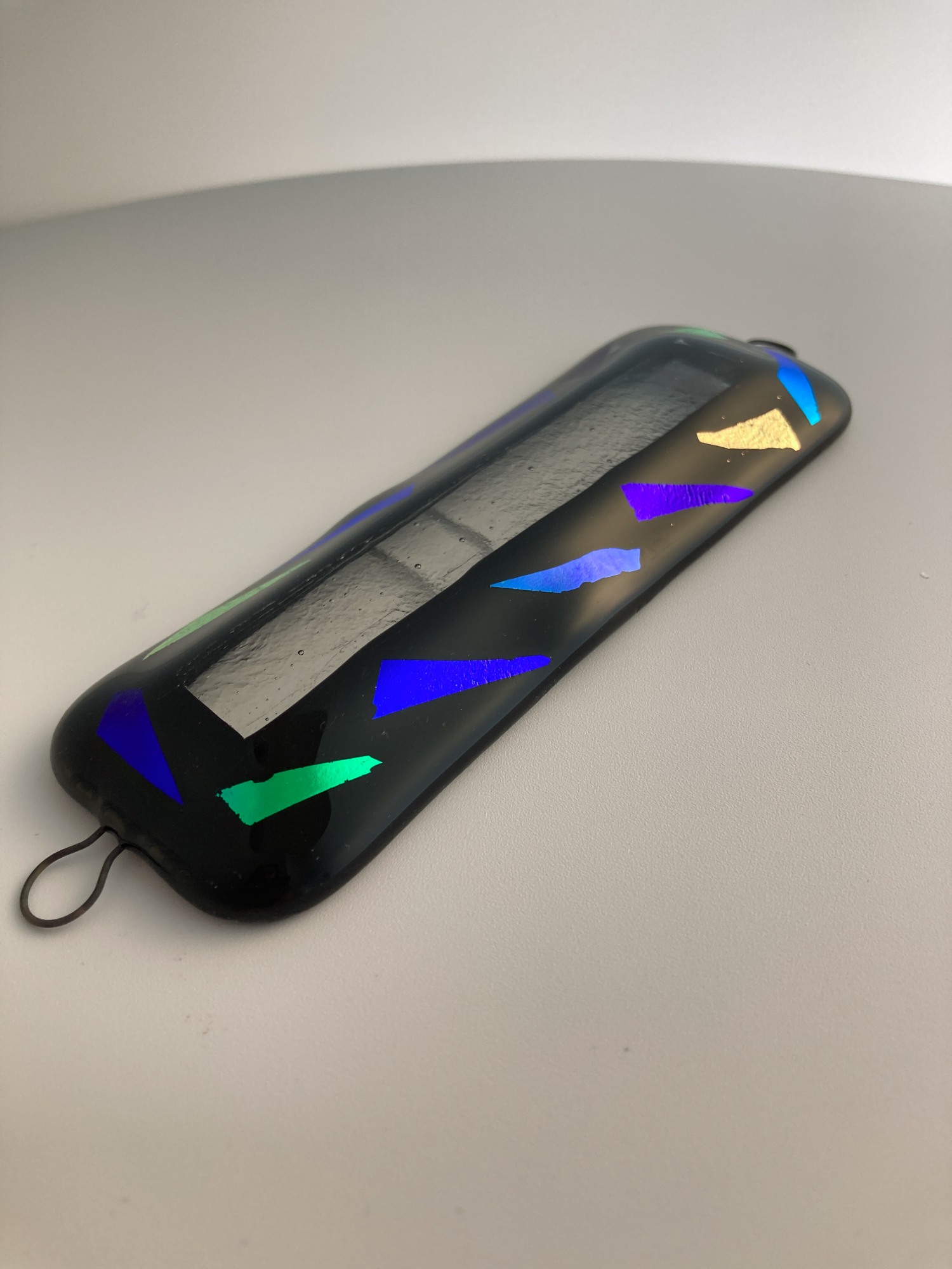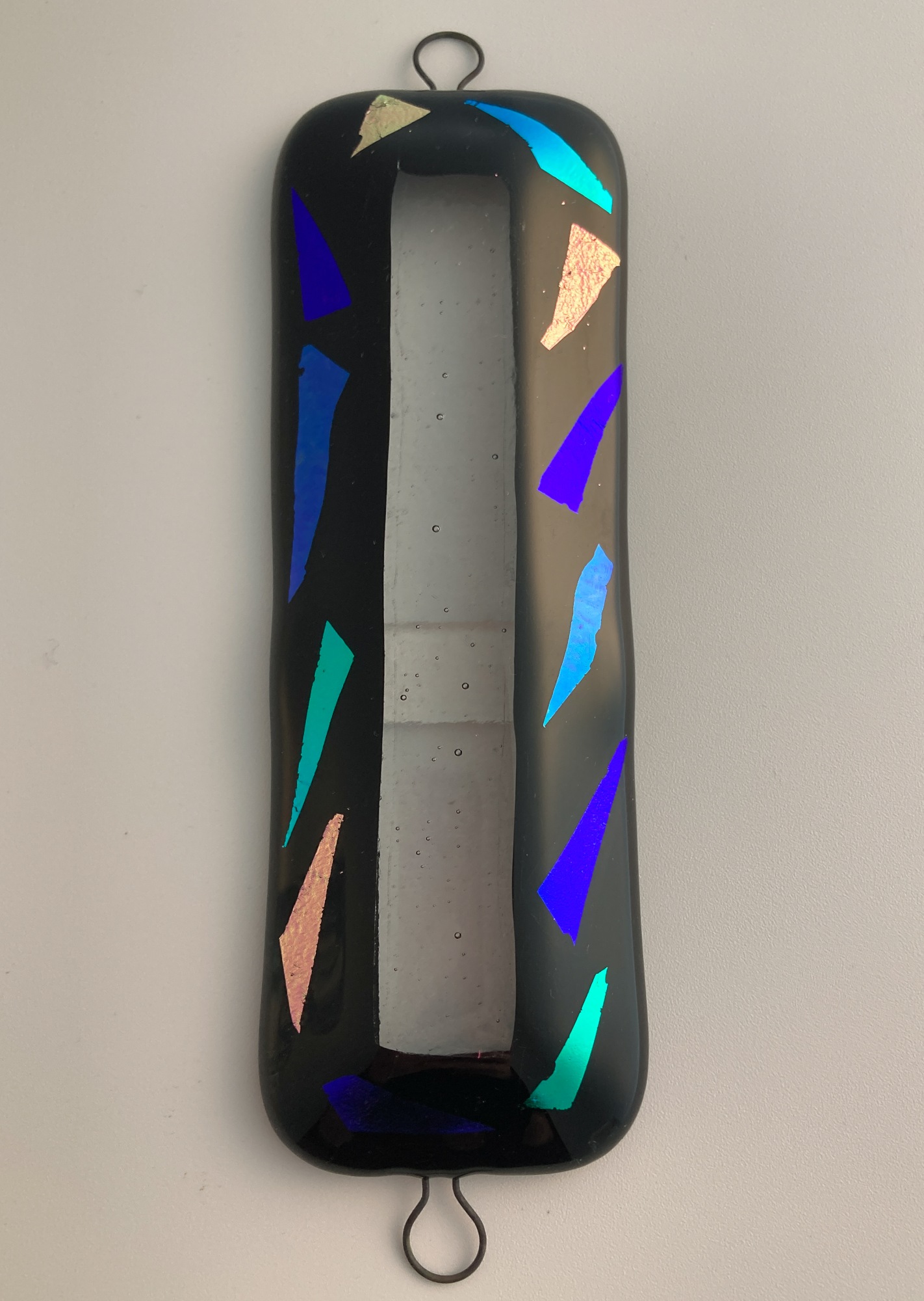 Multi color dichroic glass glitter on black to create this glass mezuzah case featuring a 'window' into the klaf. U-pins, top and bottom, to attach to your doorpost. Klaf not included.