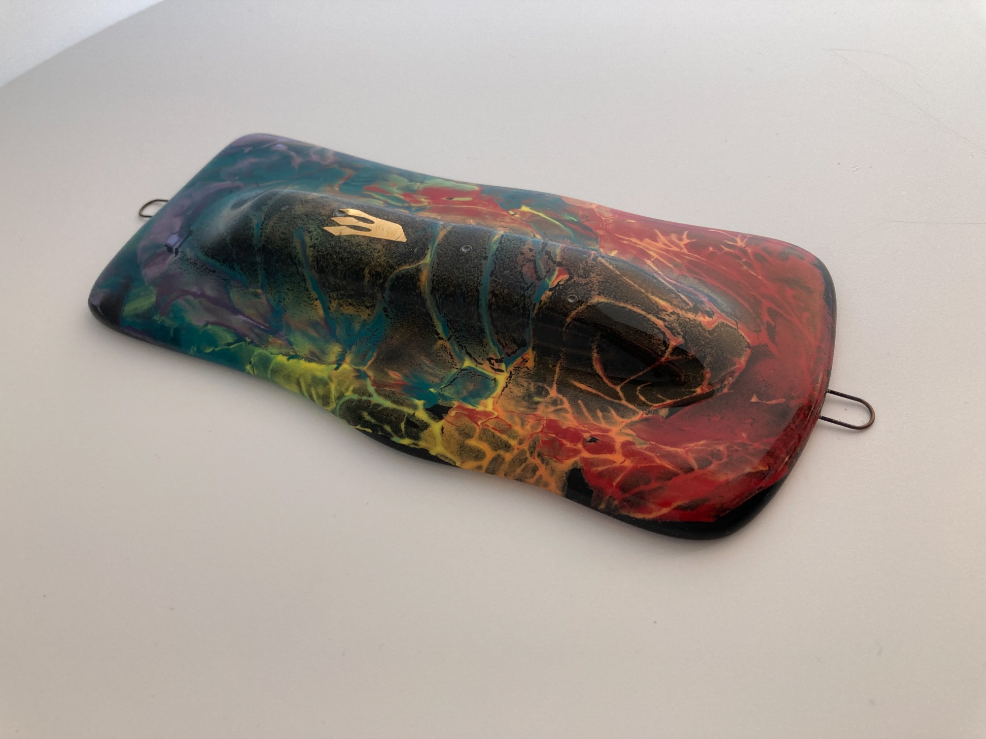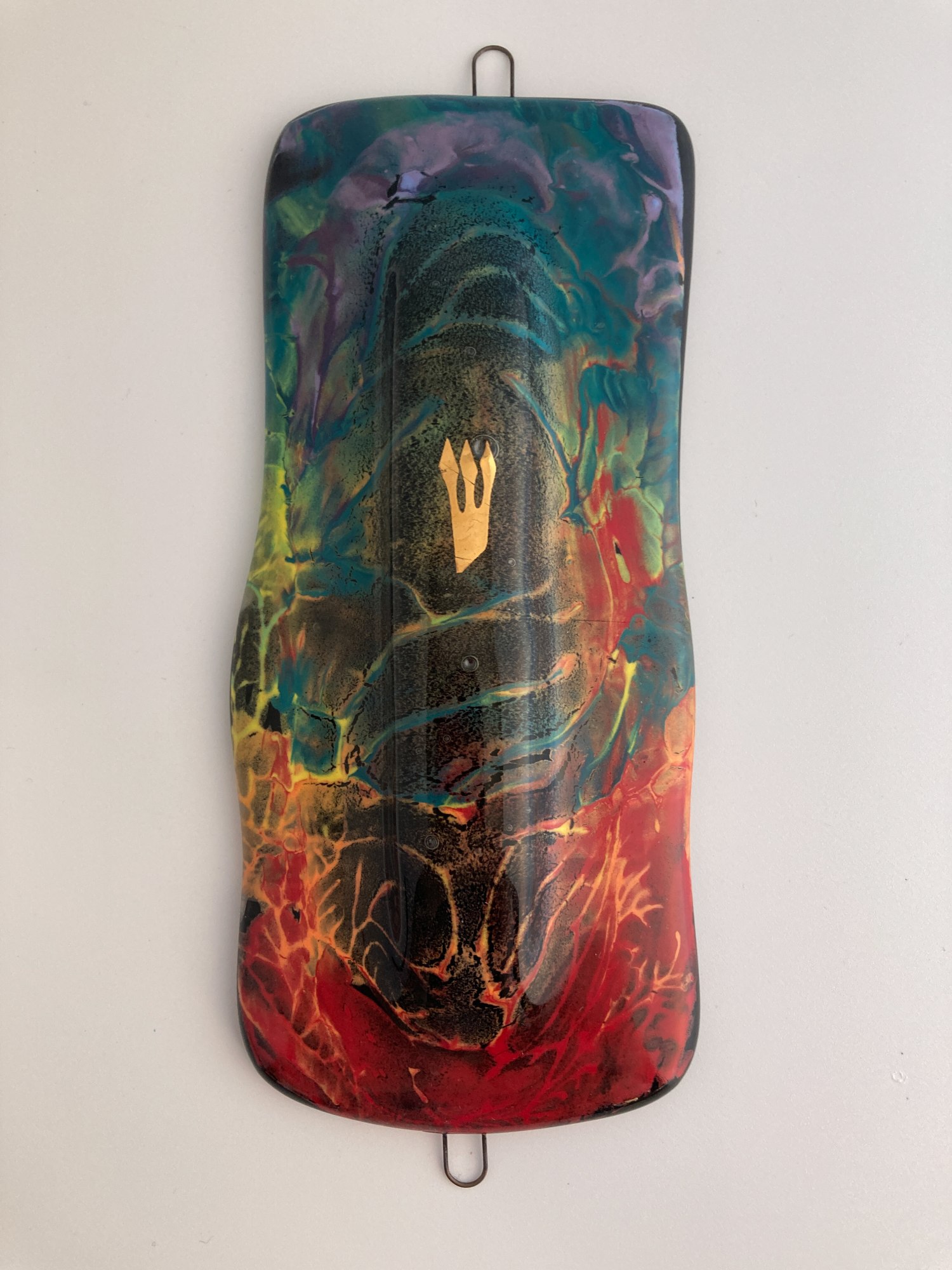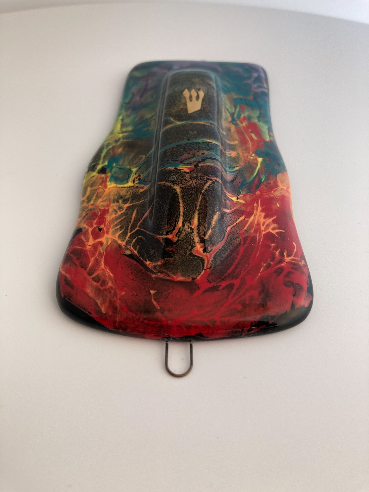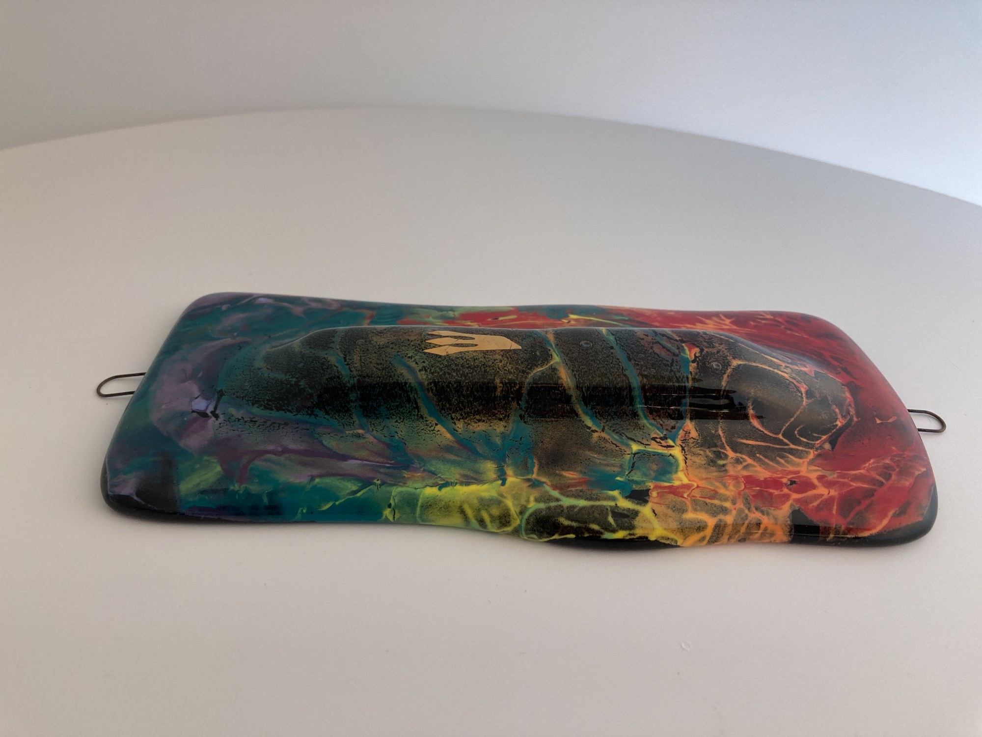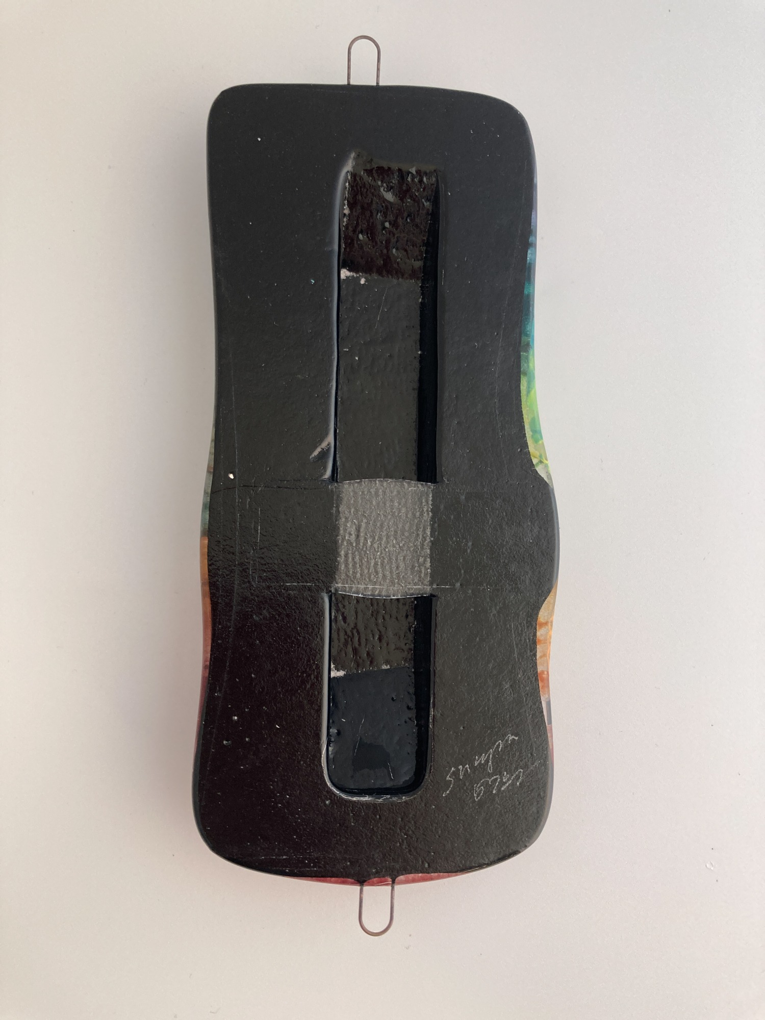 Hand-painted colorful design fused on black glass mezuzah with metal hanging wires. (Klaf not included.) Part of the rainbow series.