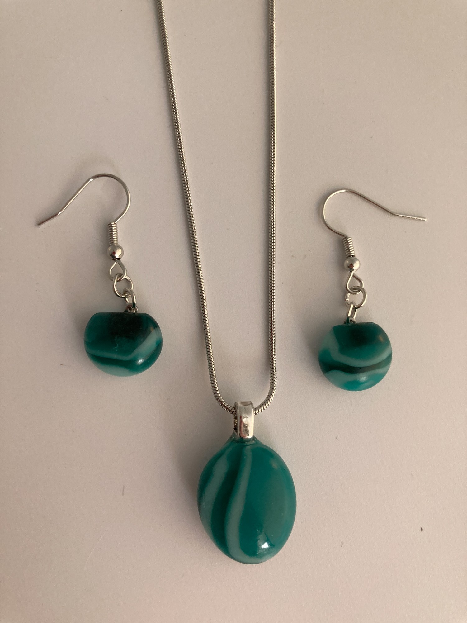 Striated teal pendant and earring set. Puddle Glass. Pierced. 16" chain.