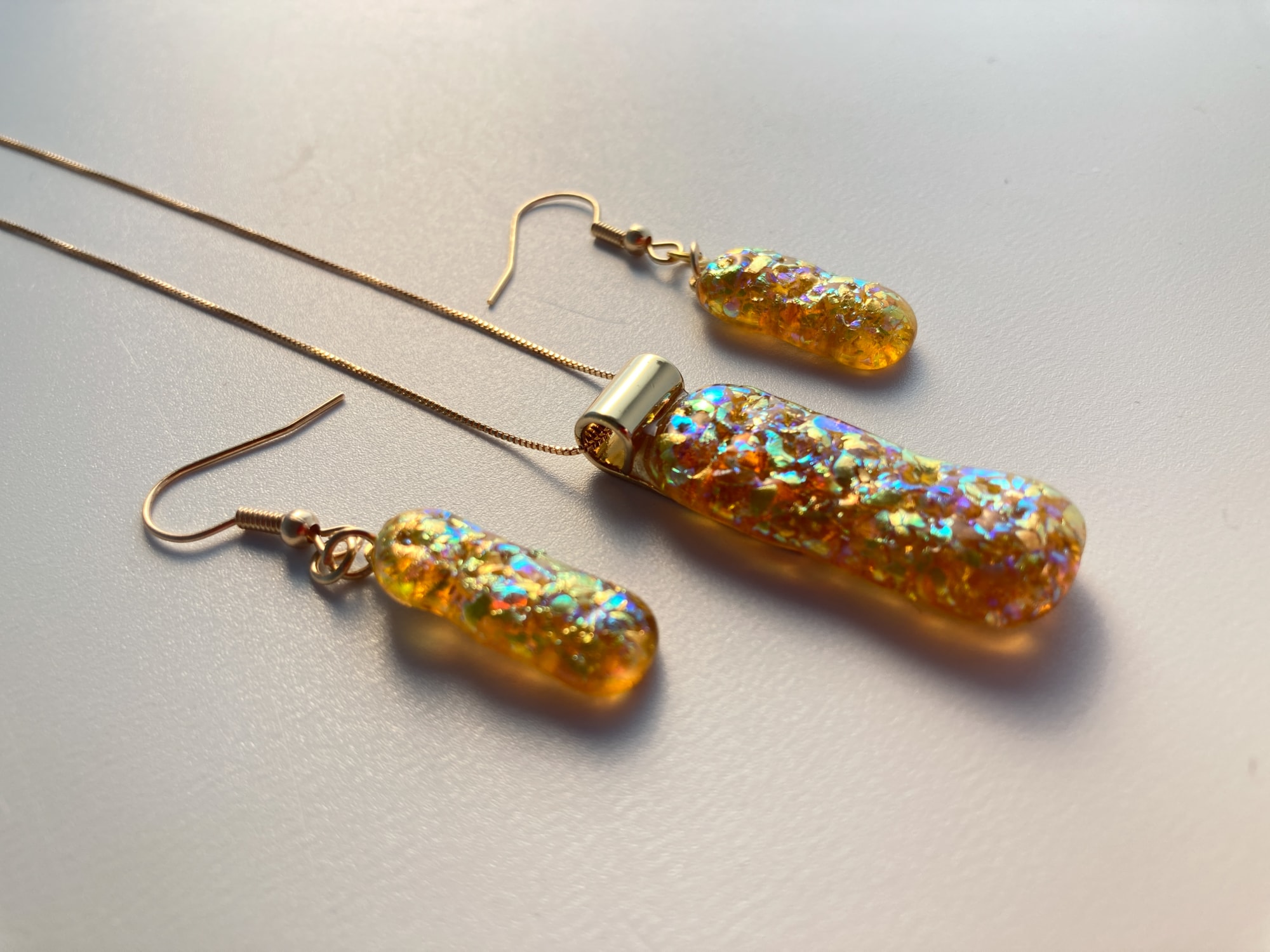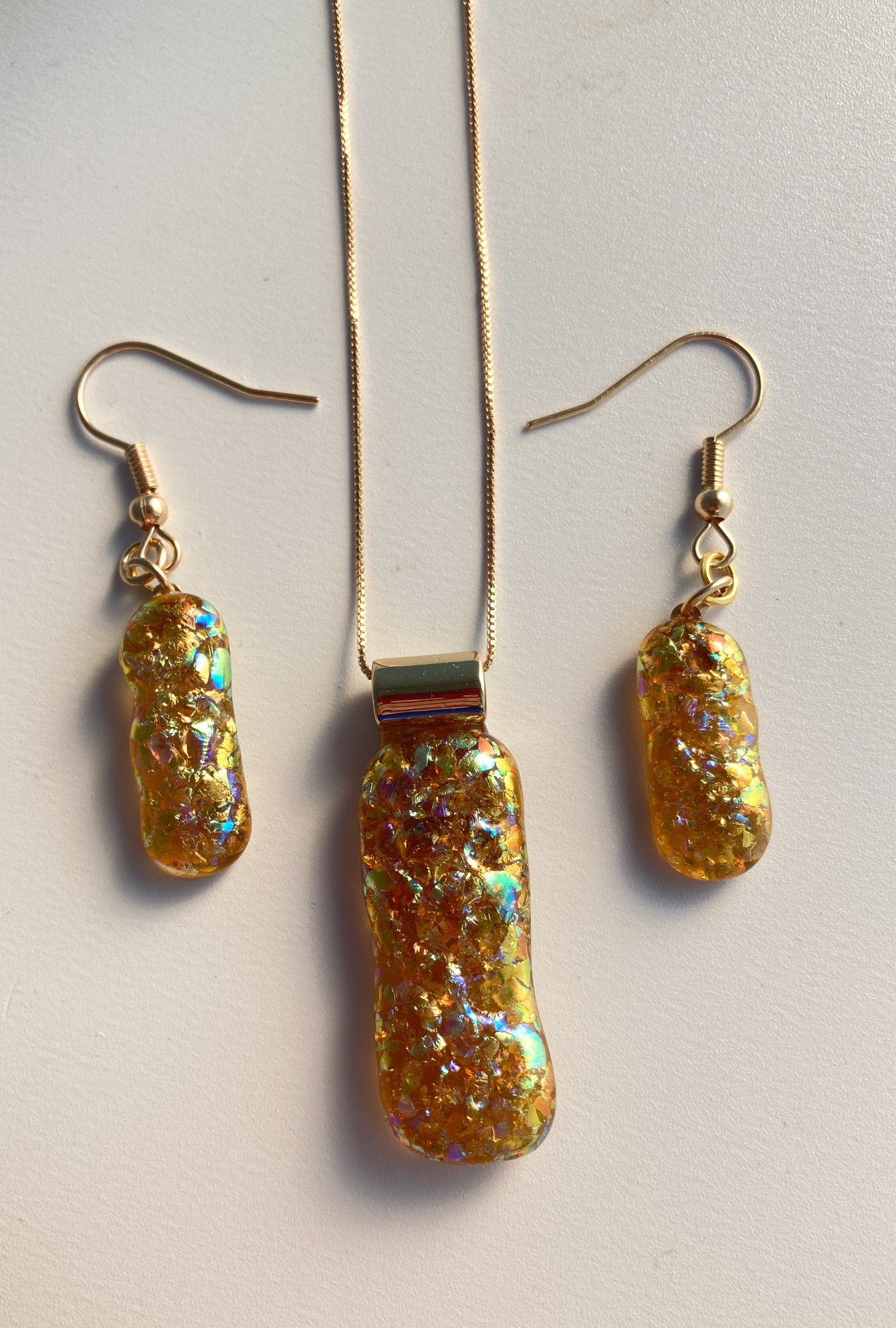 Light-weight golden glitter and glass pendant and pierced earring set. 16" chain.