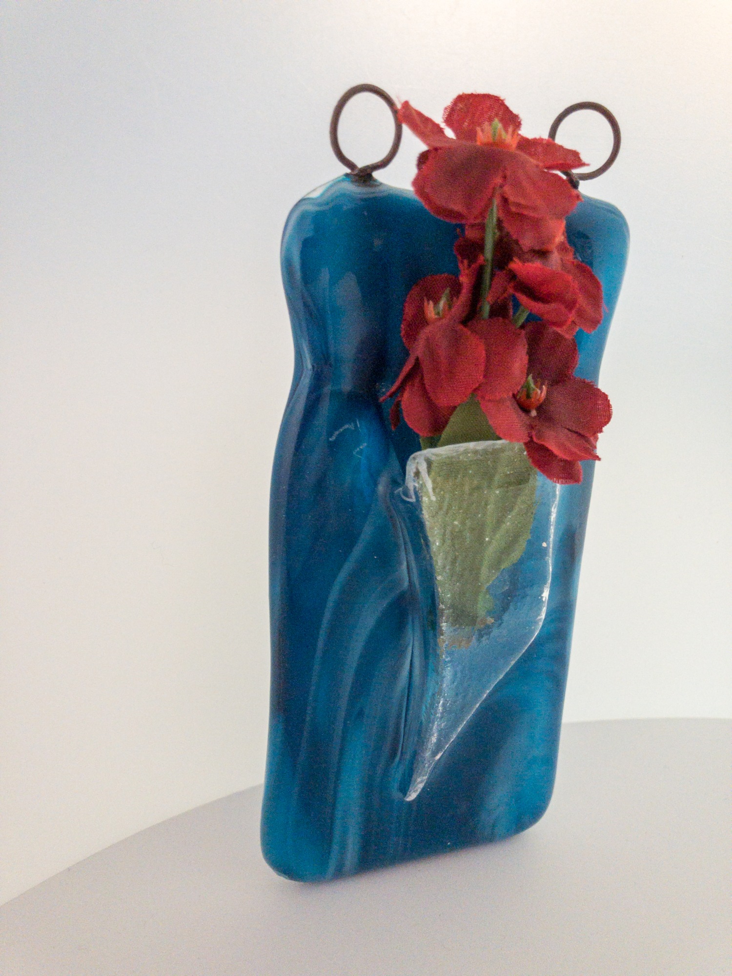 Deep blue swirl fused glass pocket vase. Looks good with dried or fresh flowers (holds water). Great hostess gift.
