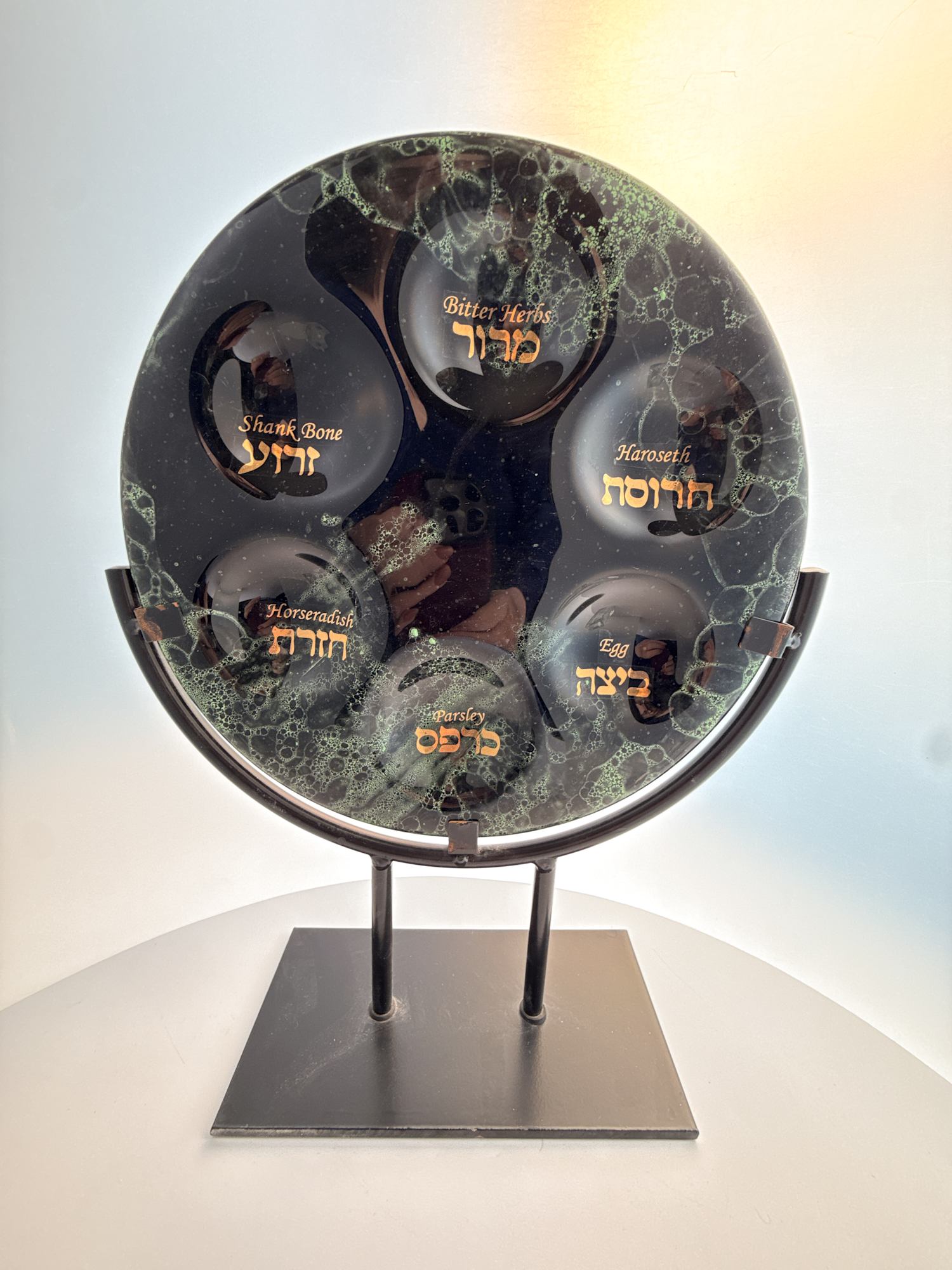 This distinctive Seder Plate features graceful green bubbles adorning black glass, complemented by gold lettering.