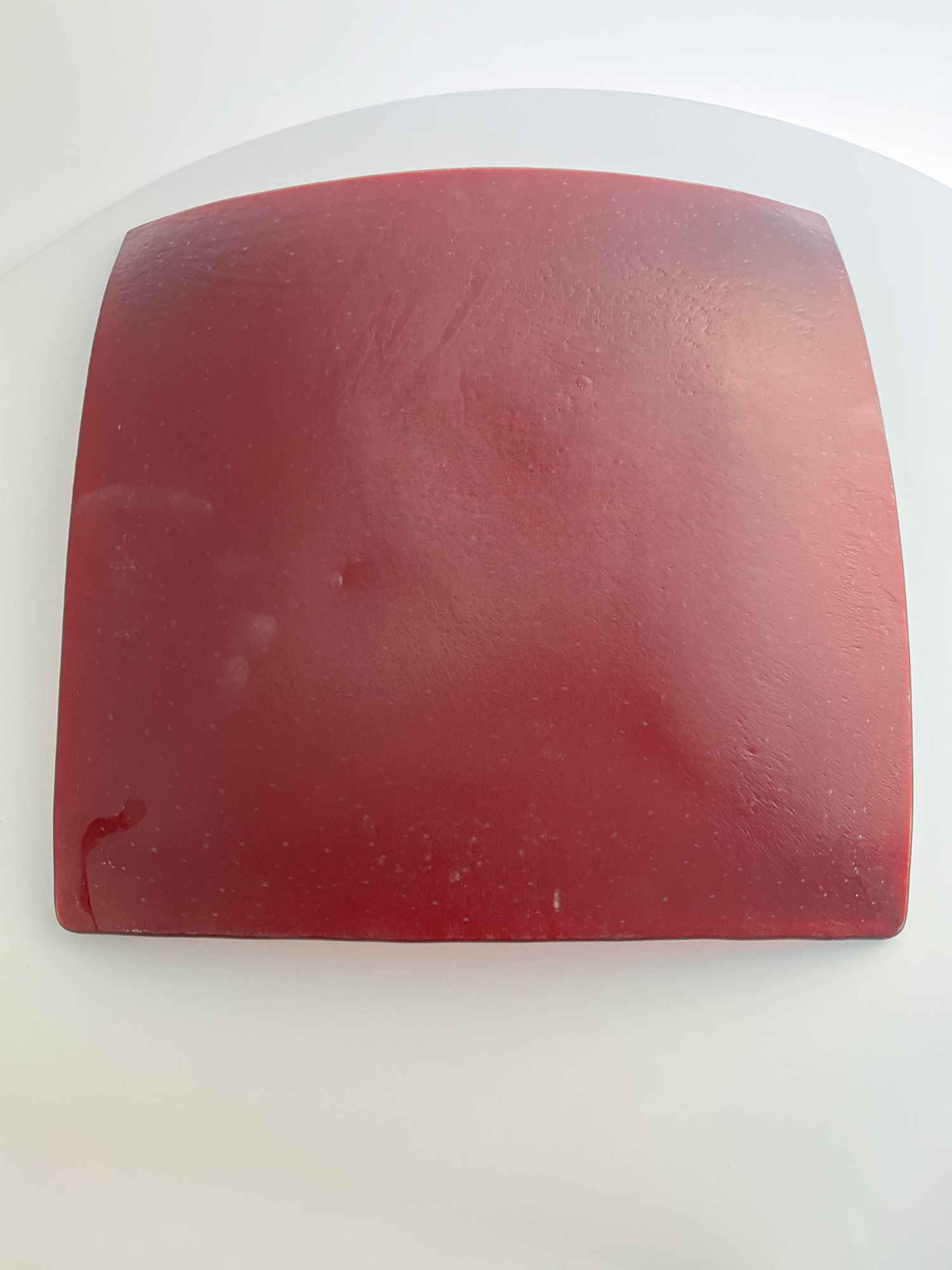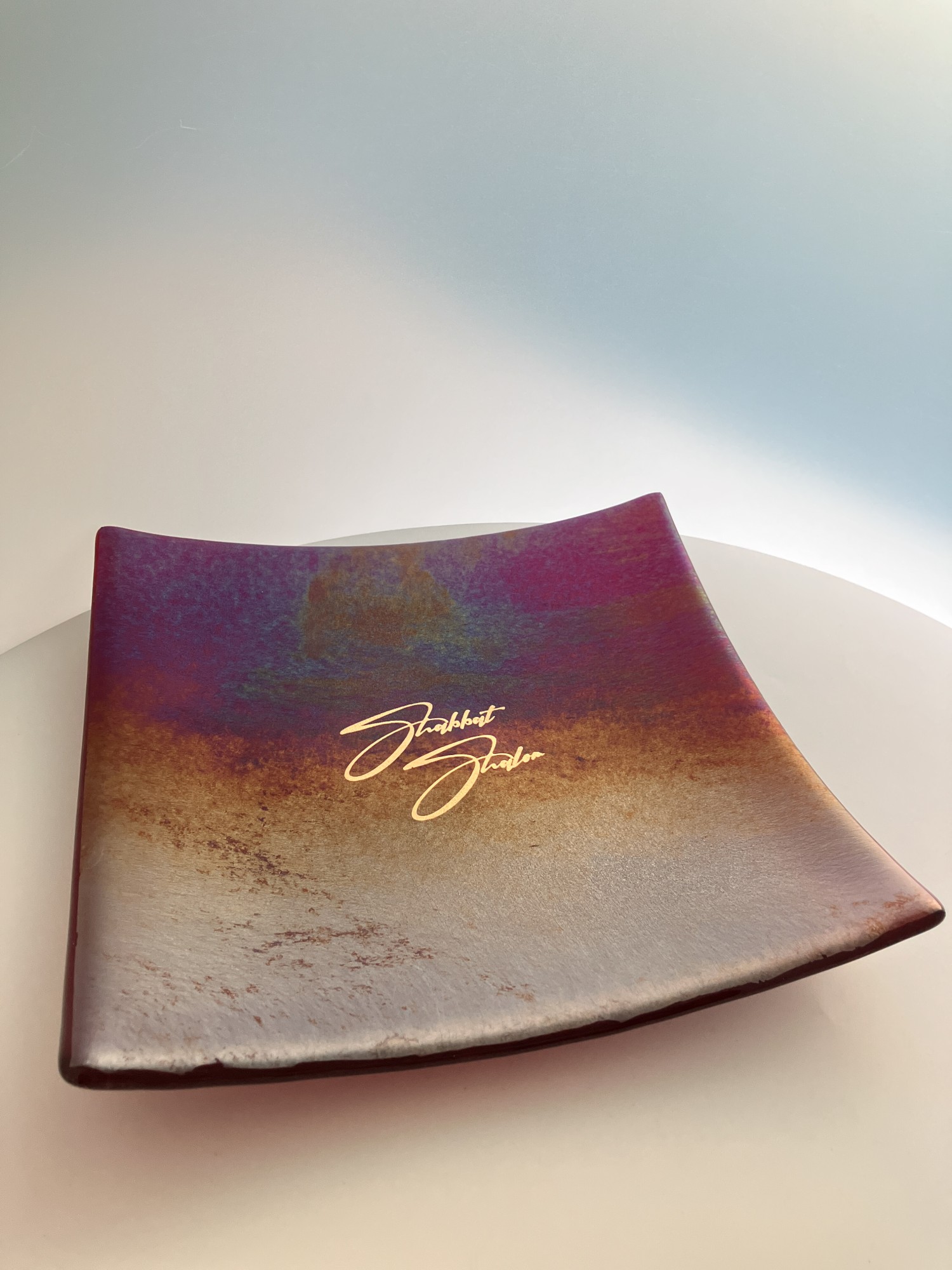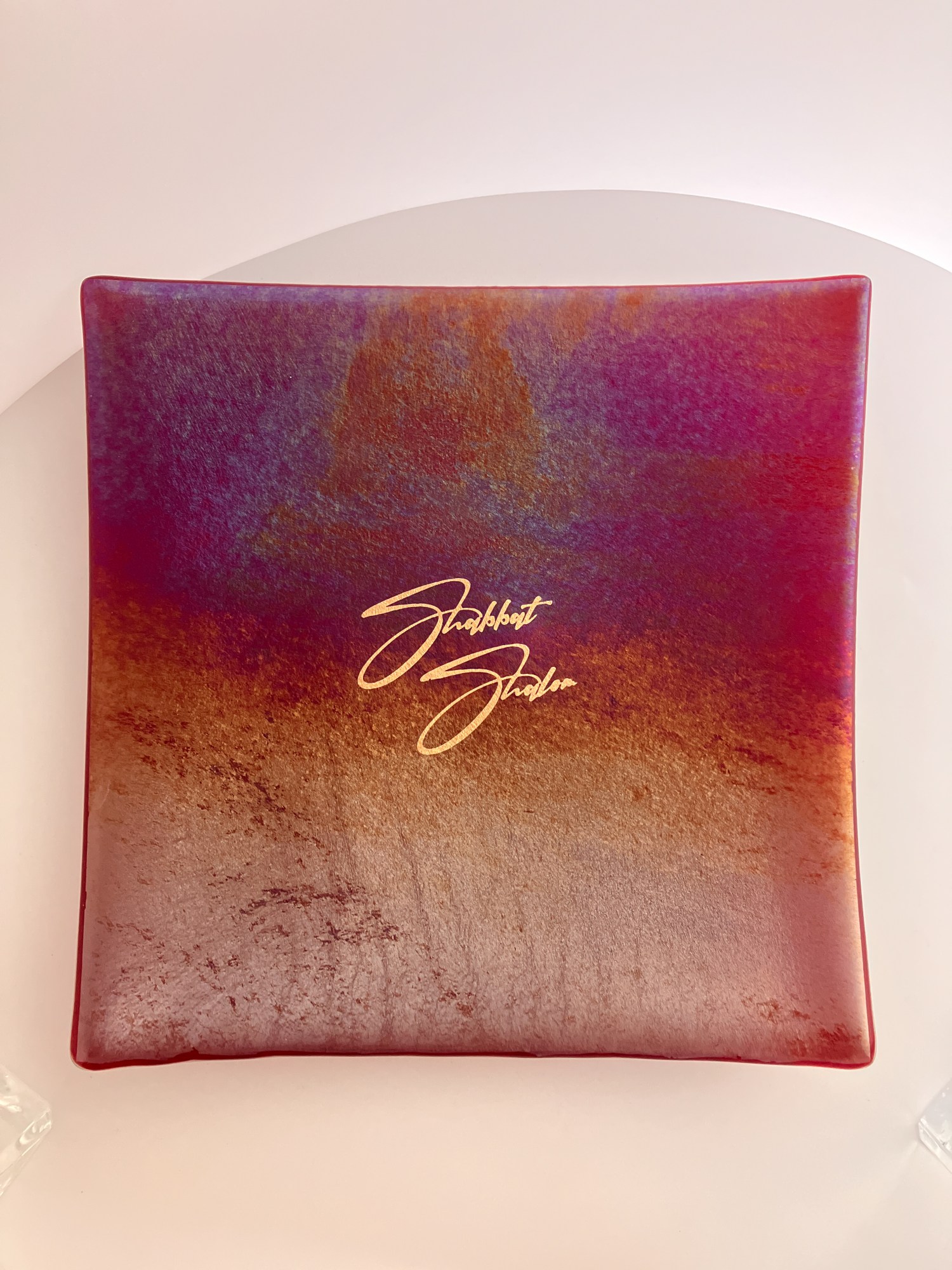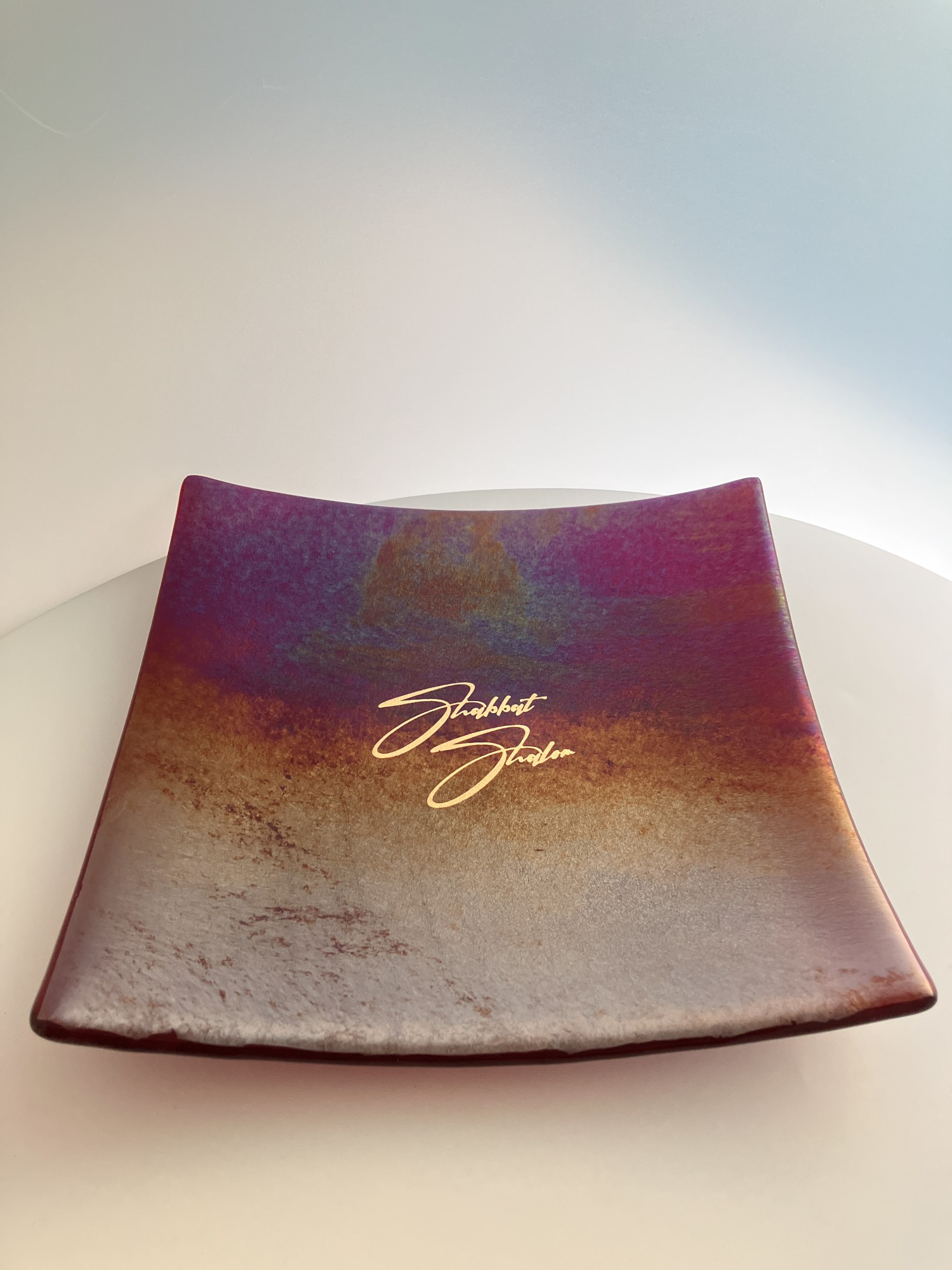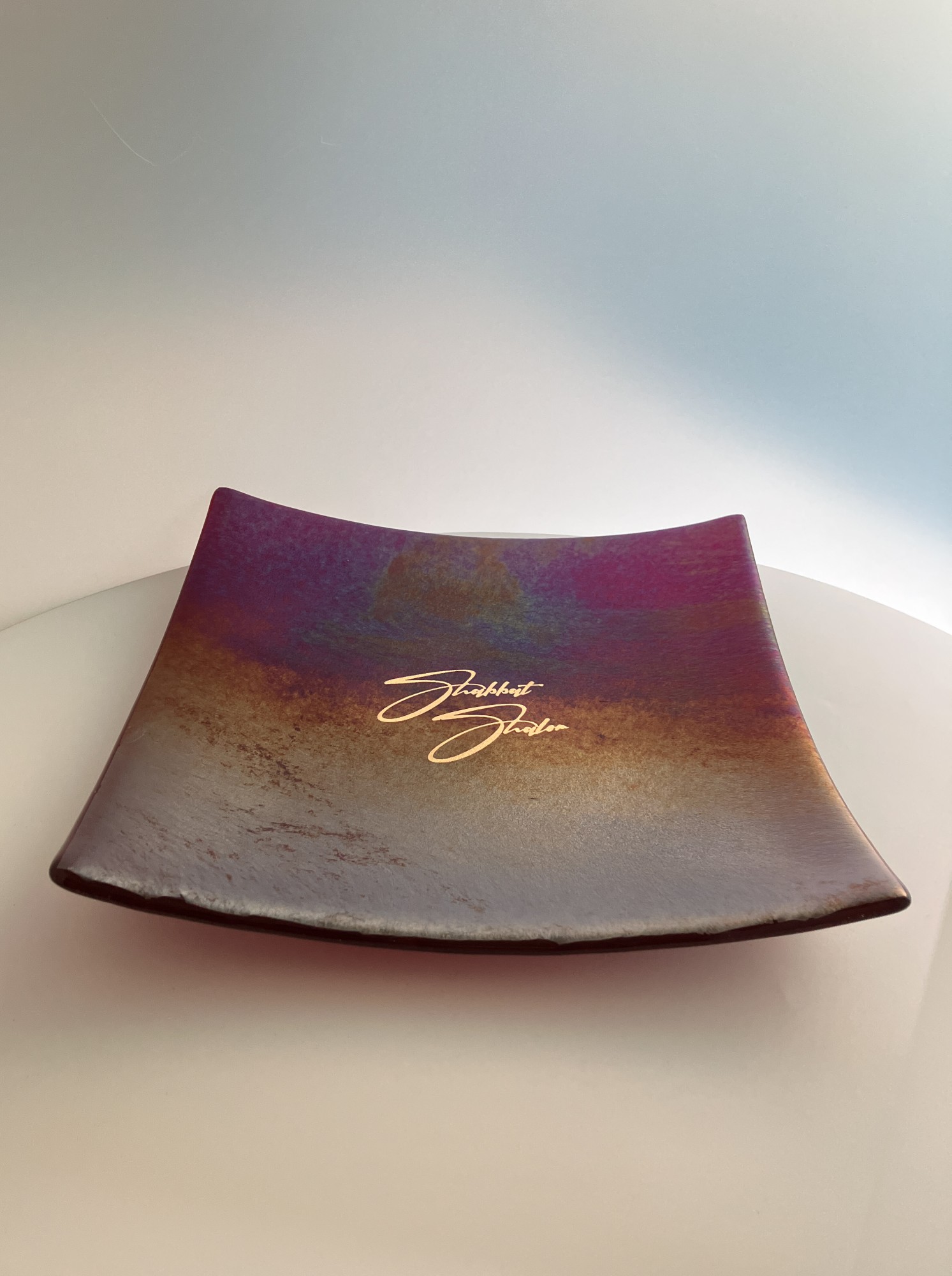A Shabbat Shalom serving dish with irid red glass and gold lettering. Adds an elegant touch to any table.