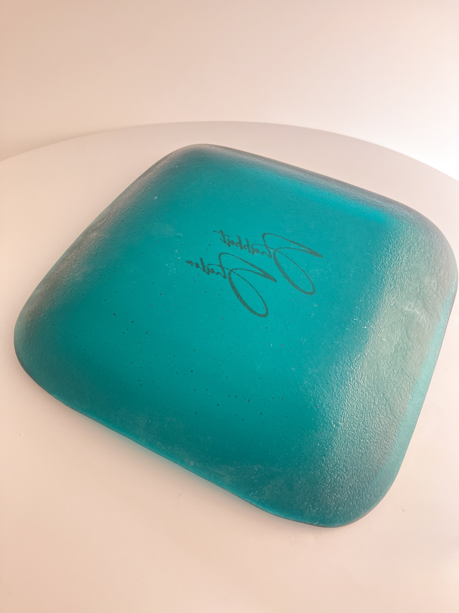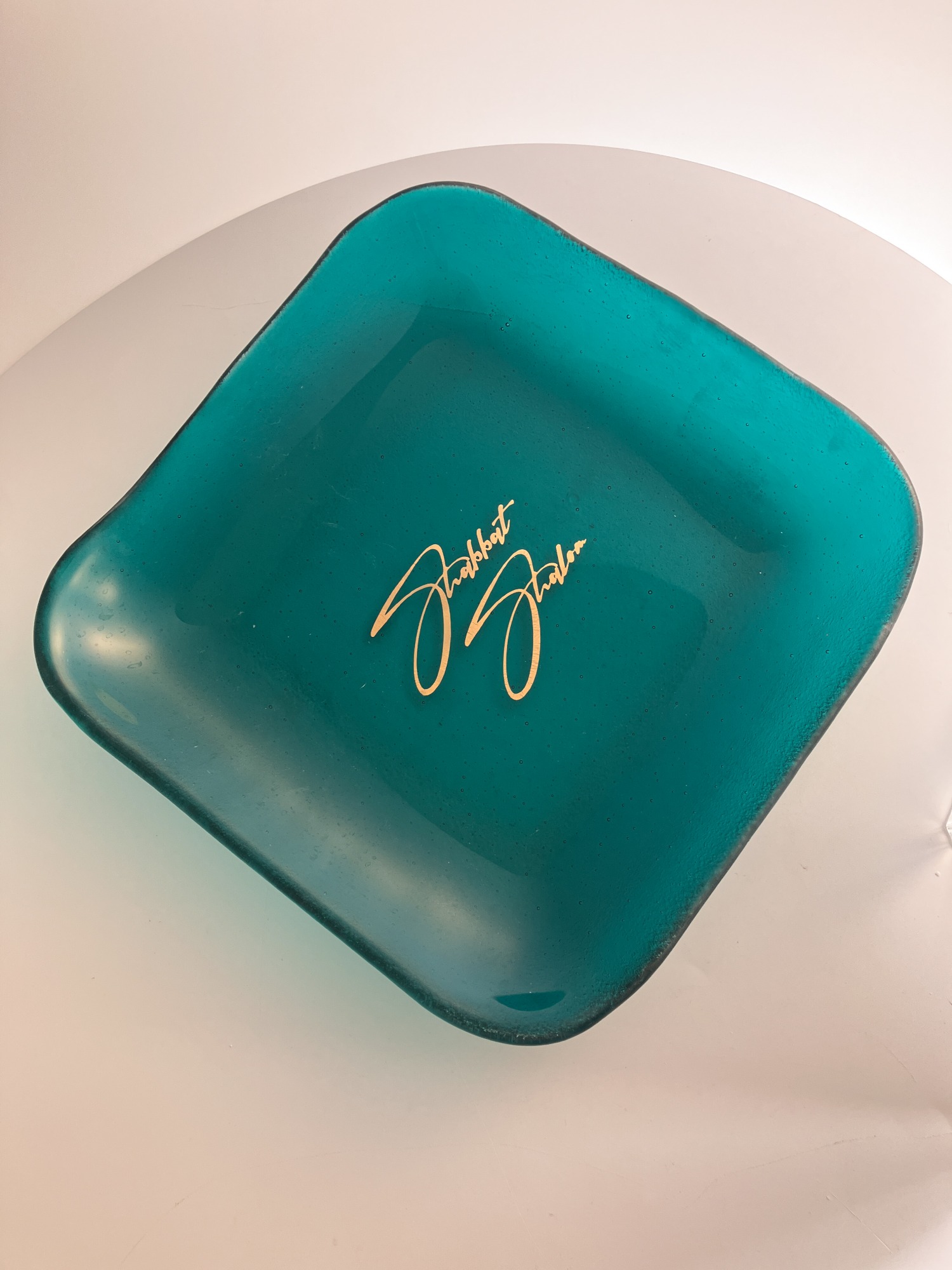Transparent peacock blue glass dish with gold lettering. A great serving dish for main course or dessert.