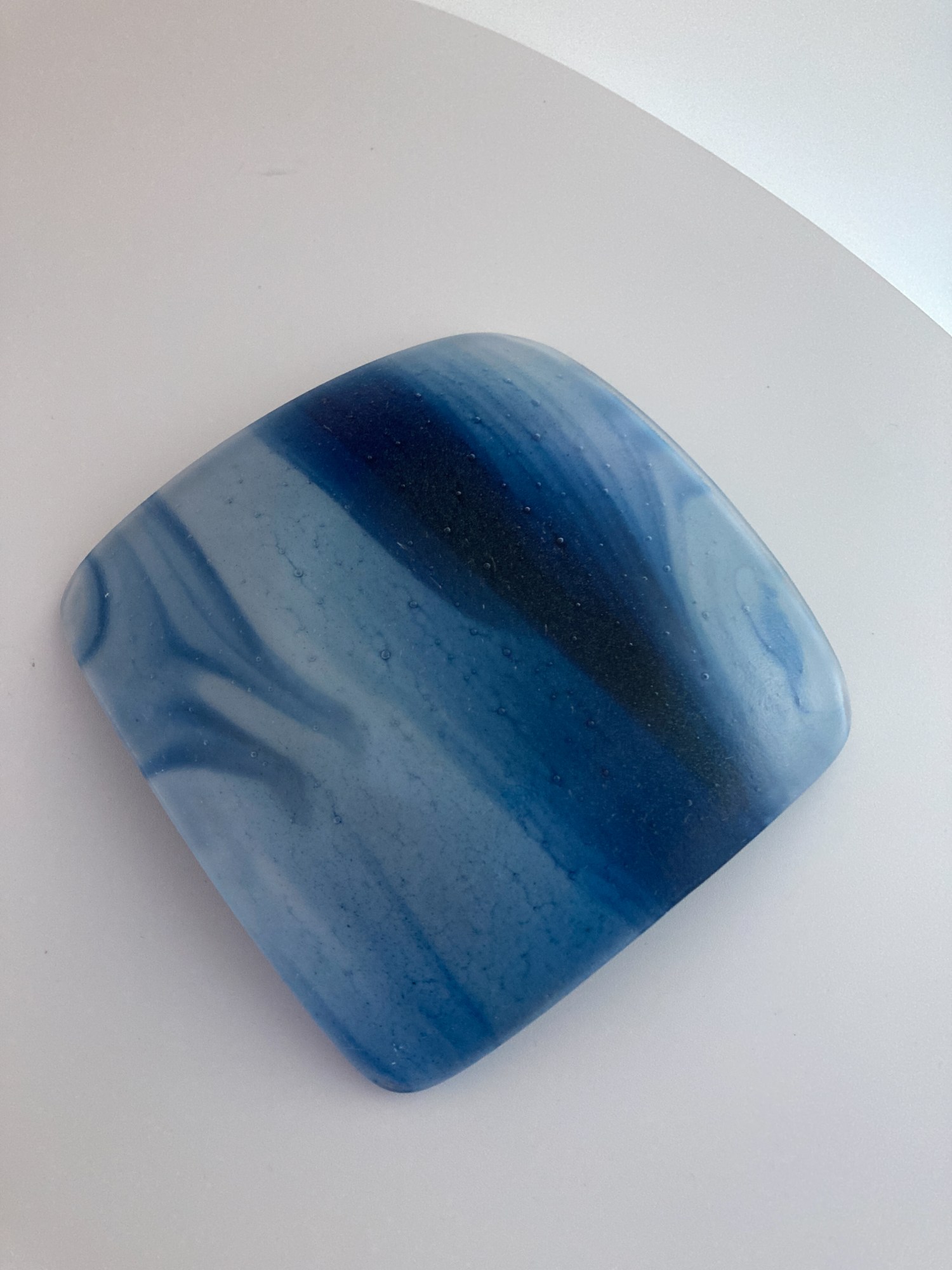 Irid streaky blue fused glass plate. Great for use as a wine coaster or drop plate for your keys and jewelry.