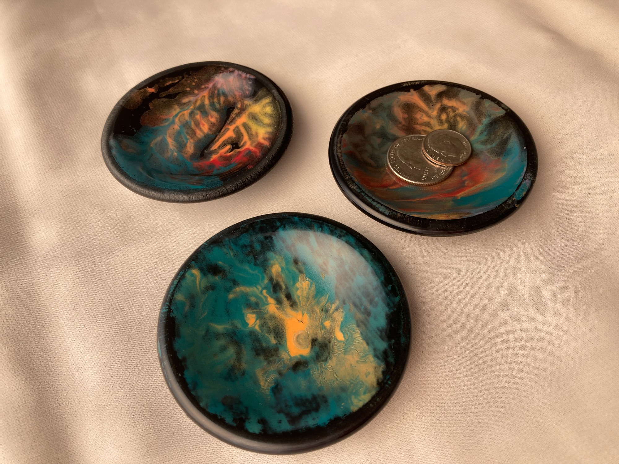 Multi-colored painted storm parting on black glass. Dish for matches, rings, teabags, or tapas. Companion dish to #0241 and #0242