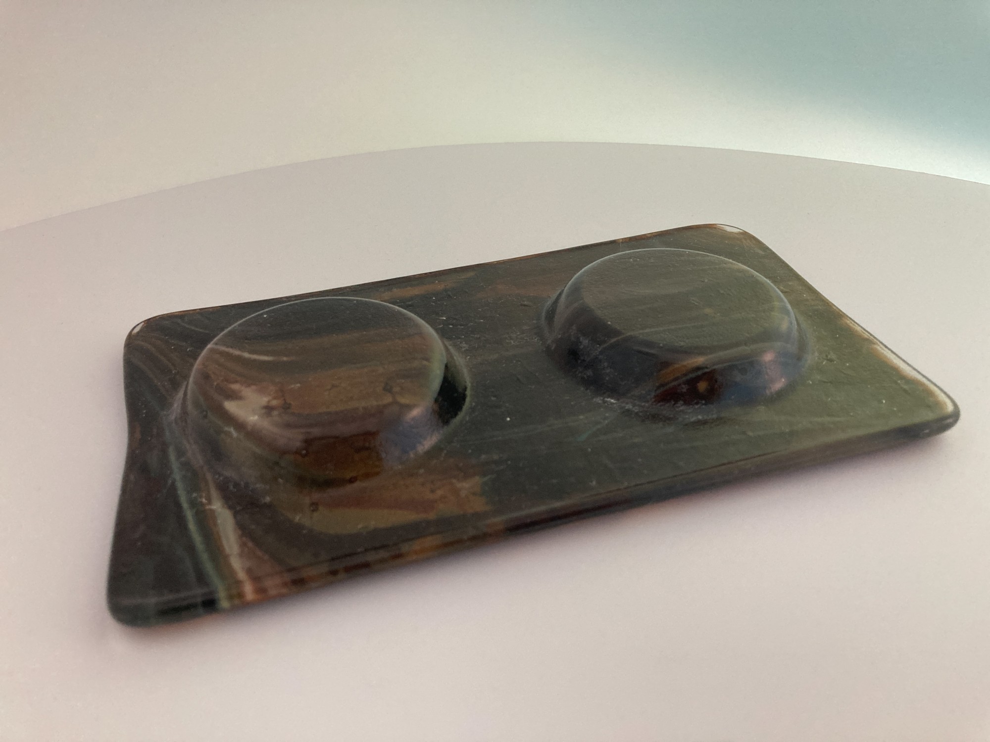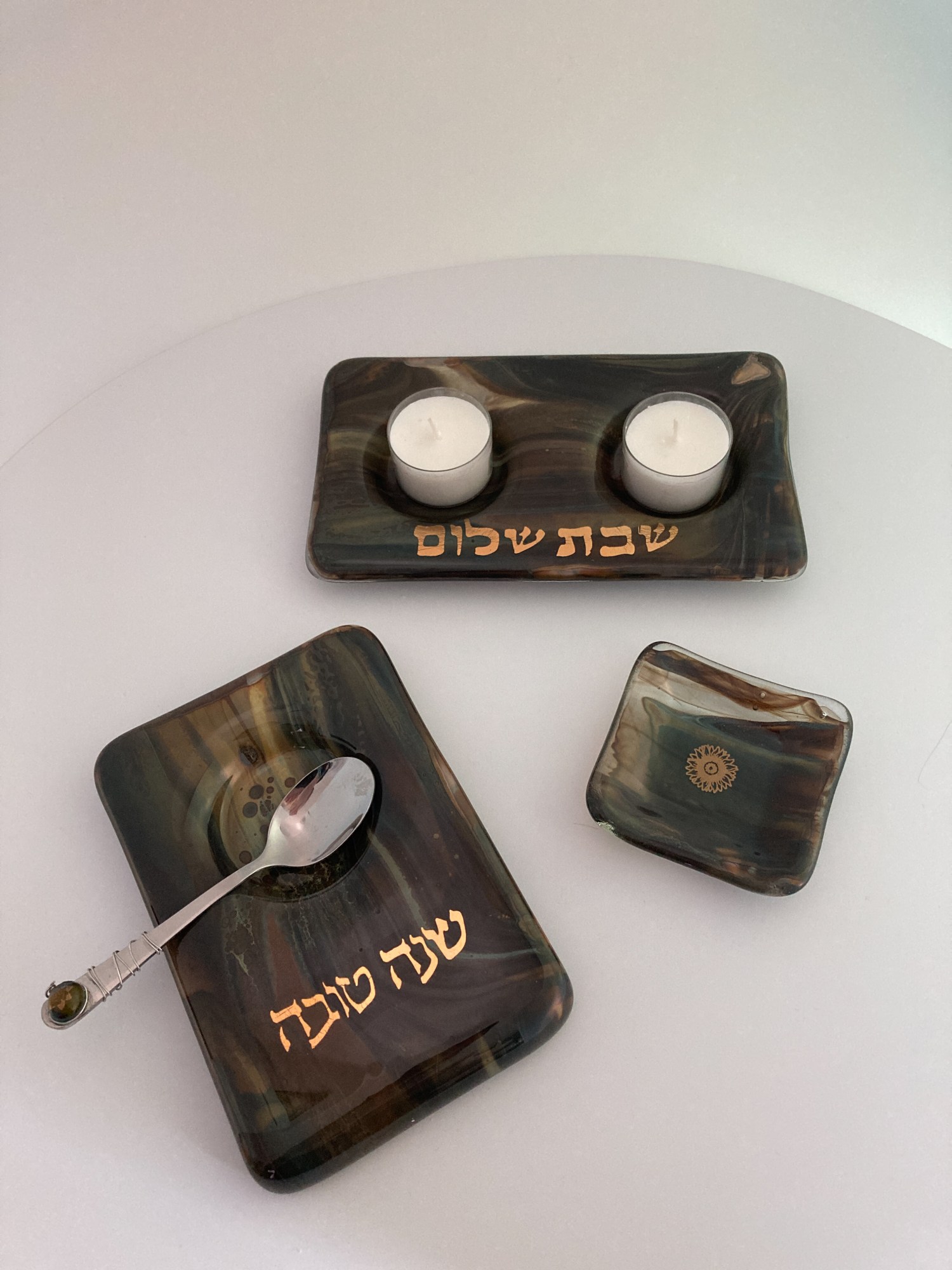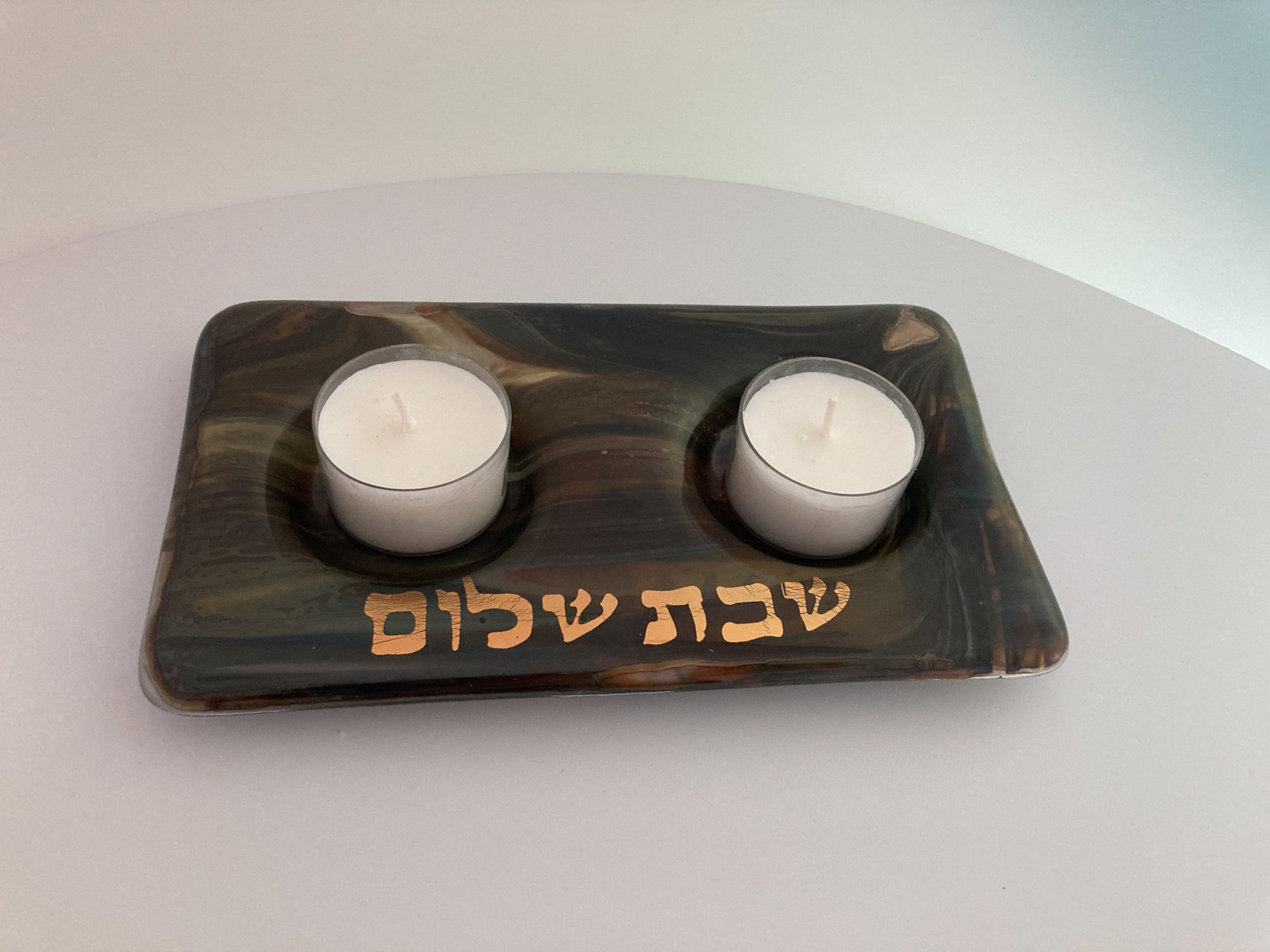 Shabbat Shalom tea light holder. This streaky brown glass compliments the shimmering gold lettering. A lovely lighting set up for your guest or just for you. Coordinates with match plate #0598 and honey dish #0599