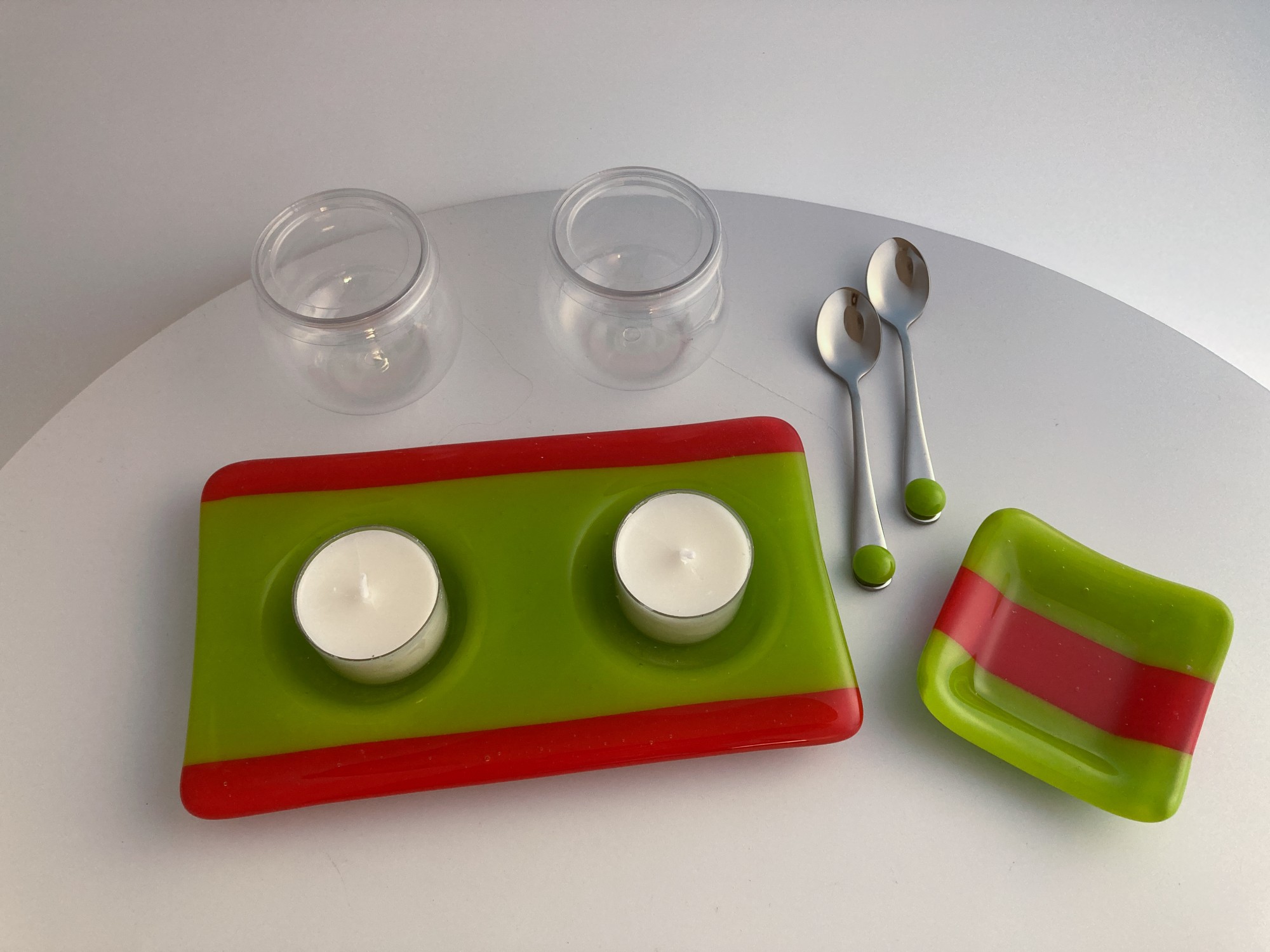 Light green and red tea light holder or condiment dish. Good match to 0694-A, 3" dish.