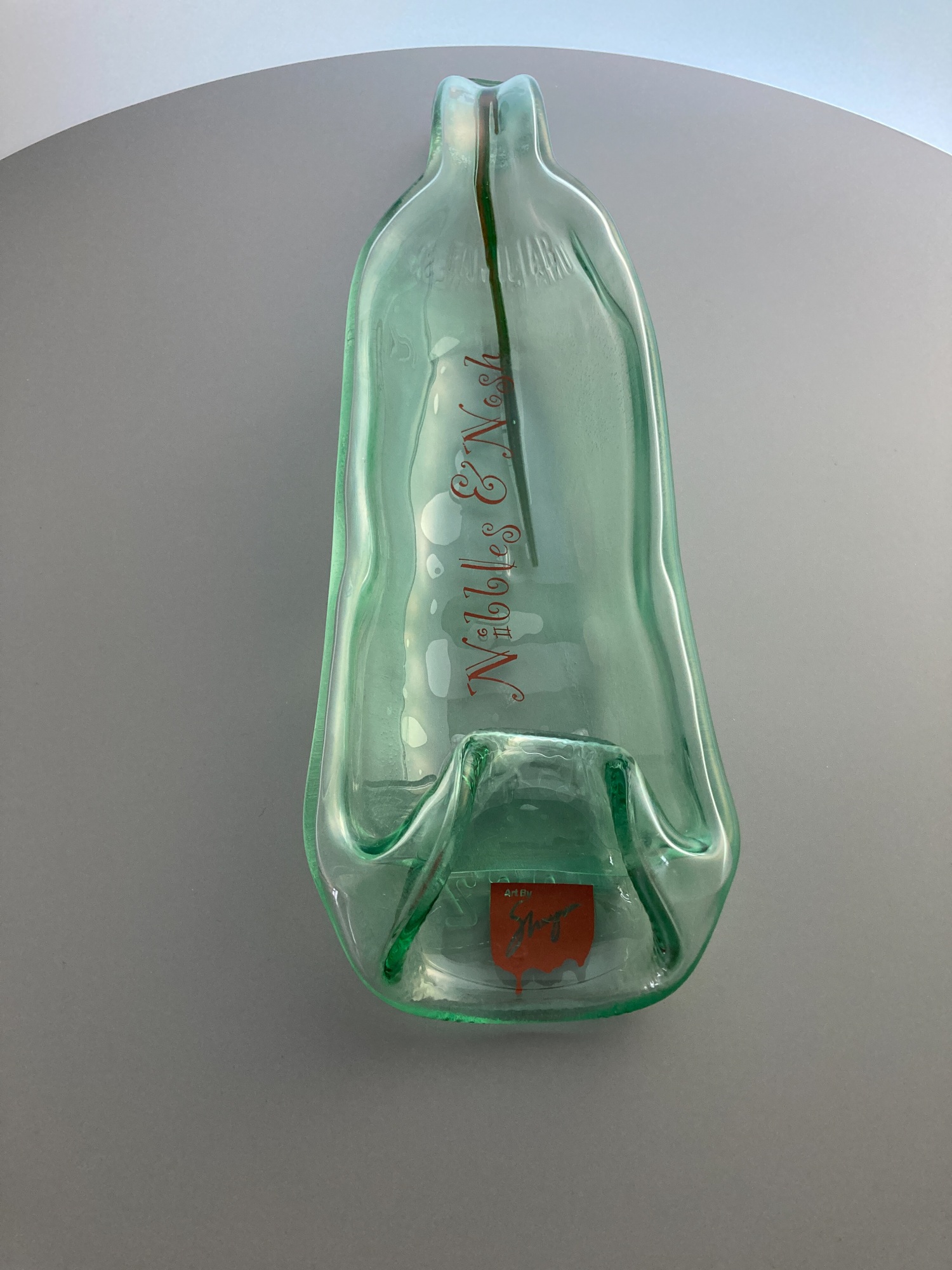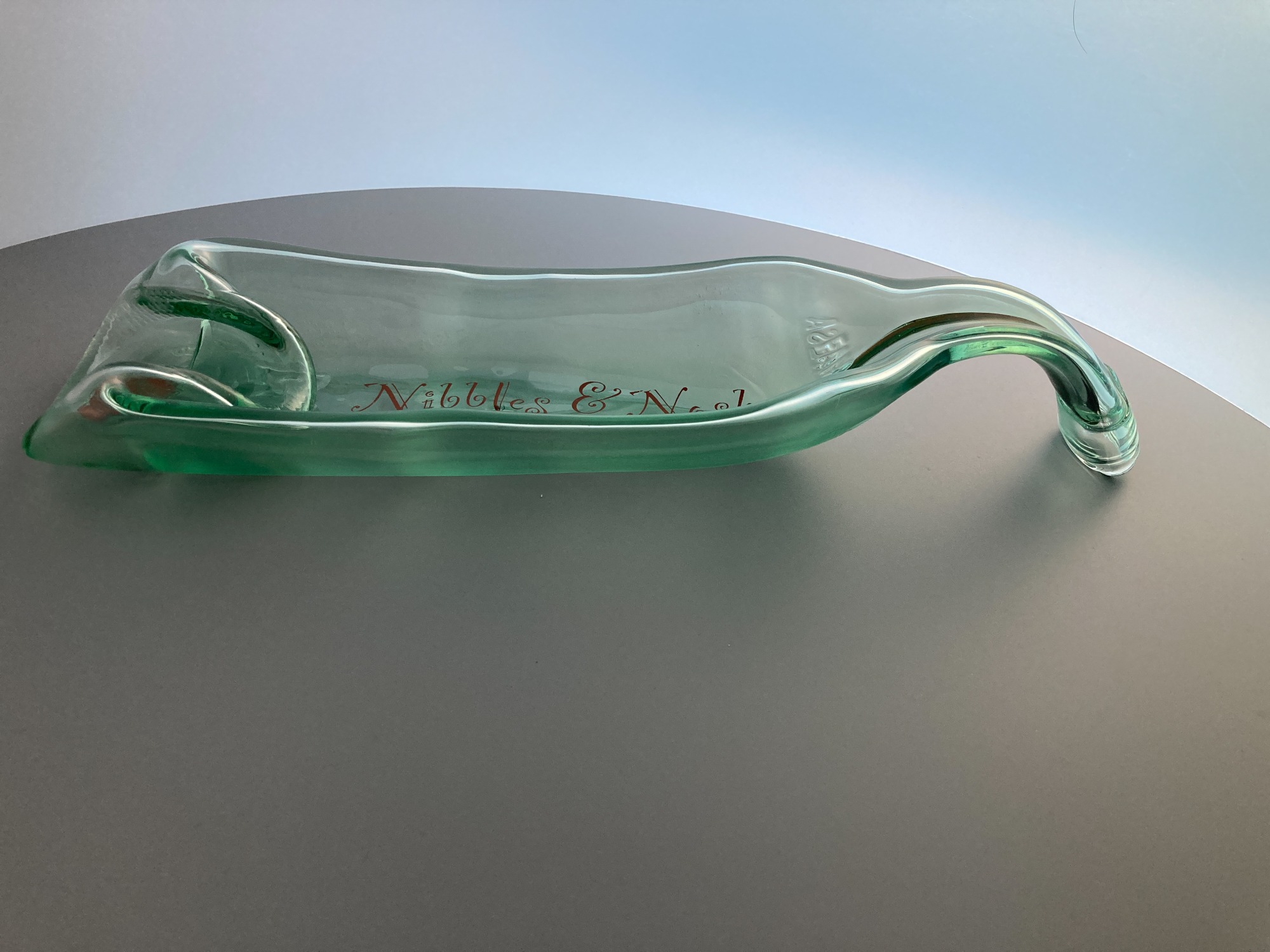 "Nibbles & Nosh" serving dish upcycled from light green transparent wine bottle. Brown pulled glass flows through the swan neck. 12" length.