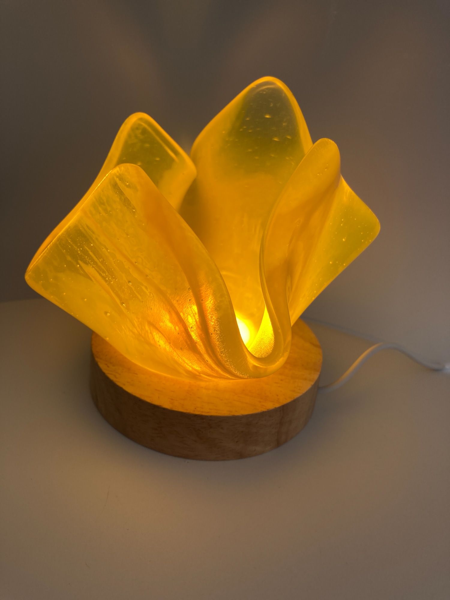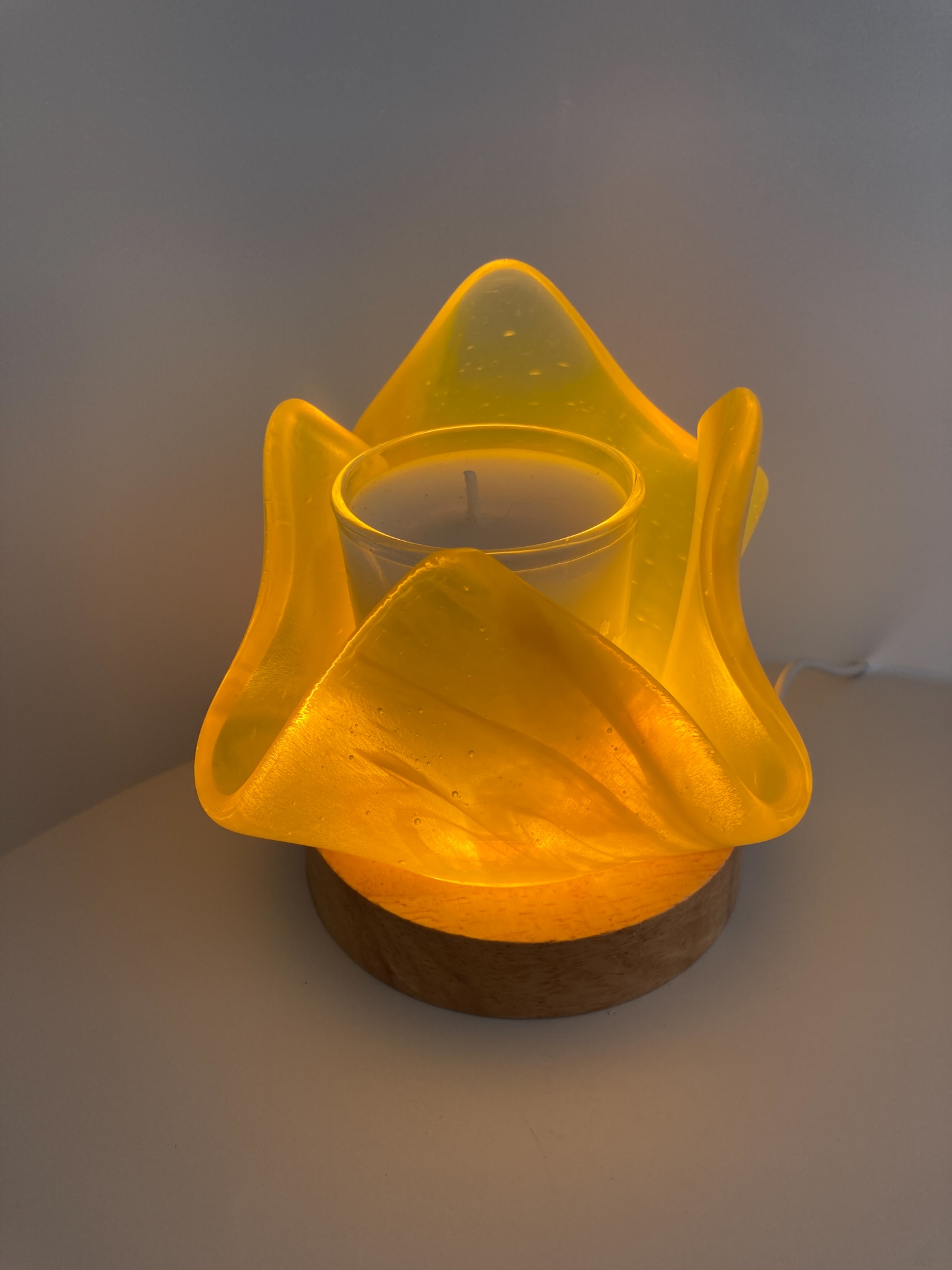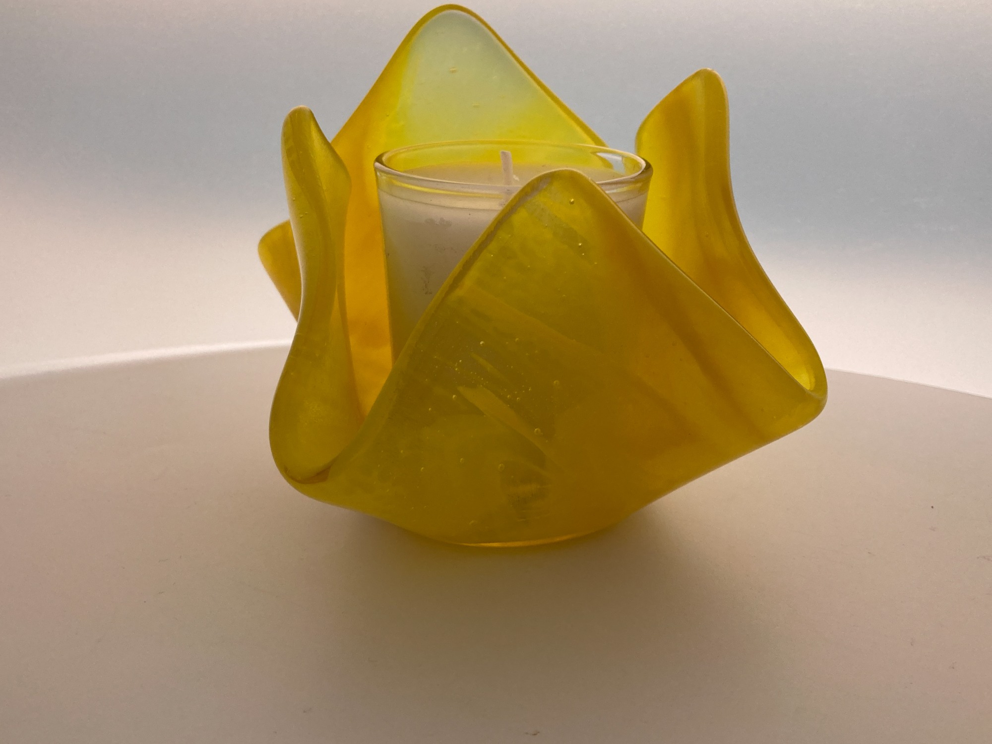 Streaky yellow and clear fused glass votive candle holder.