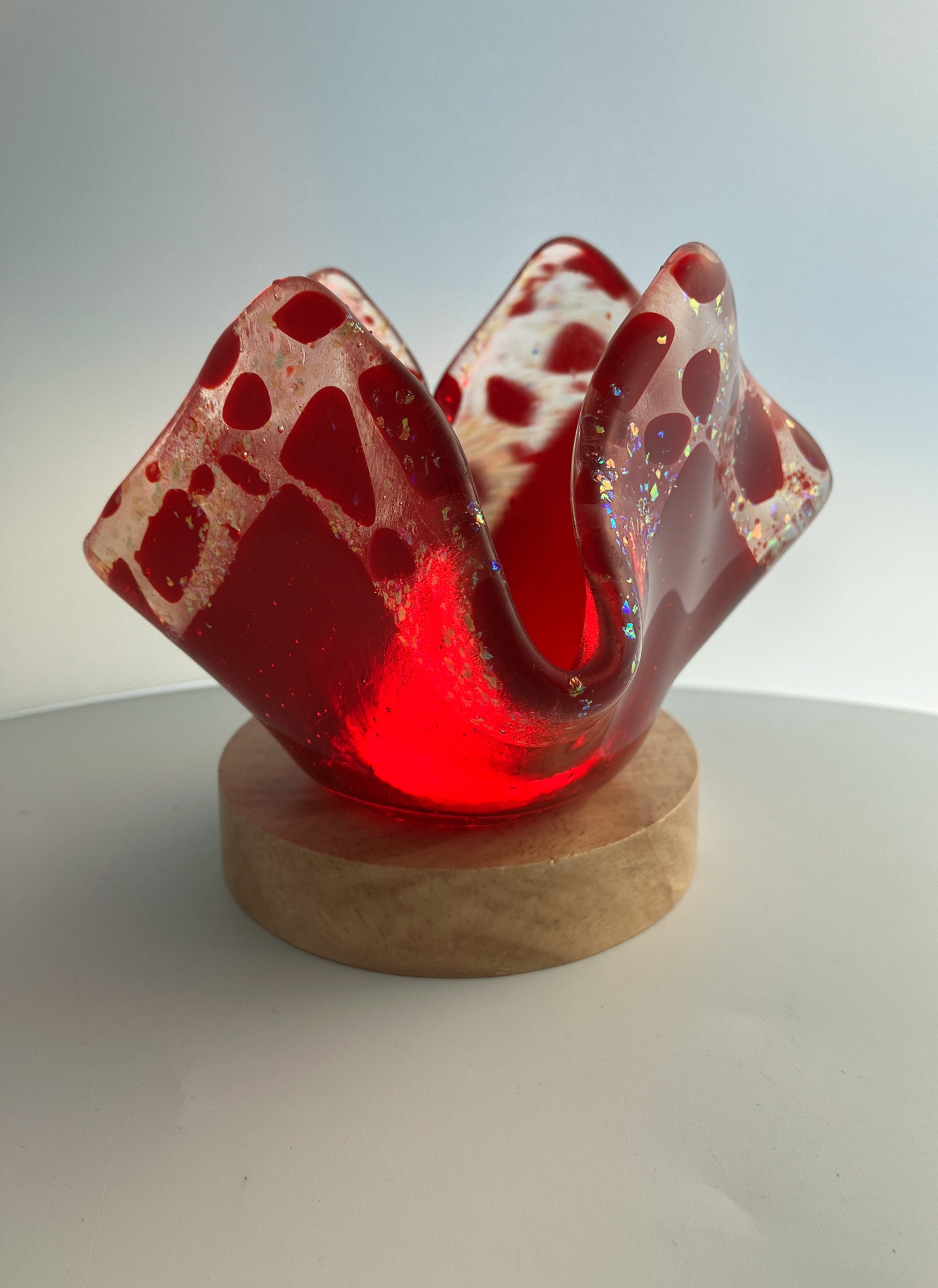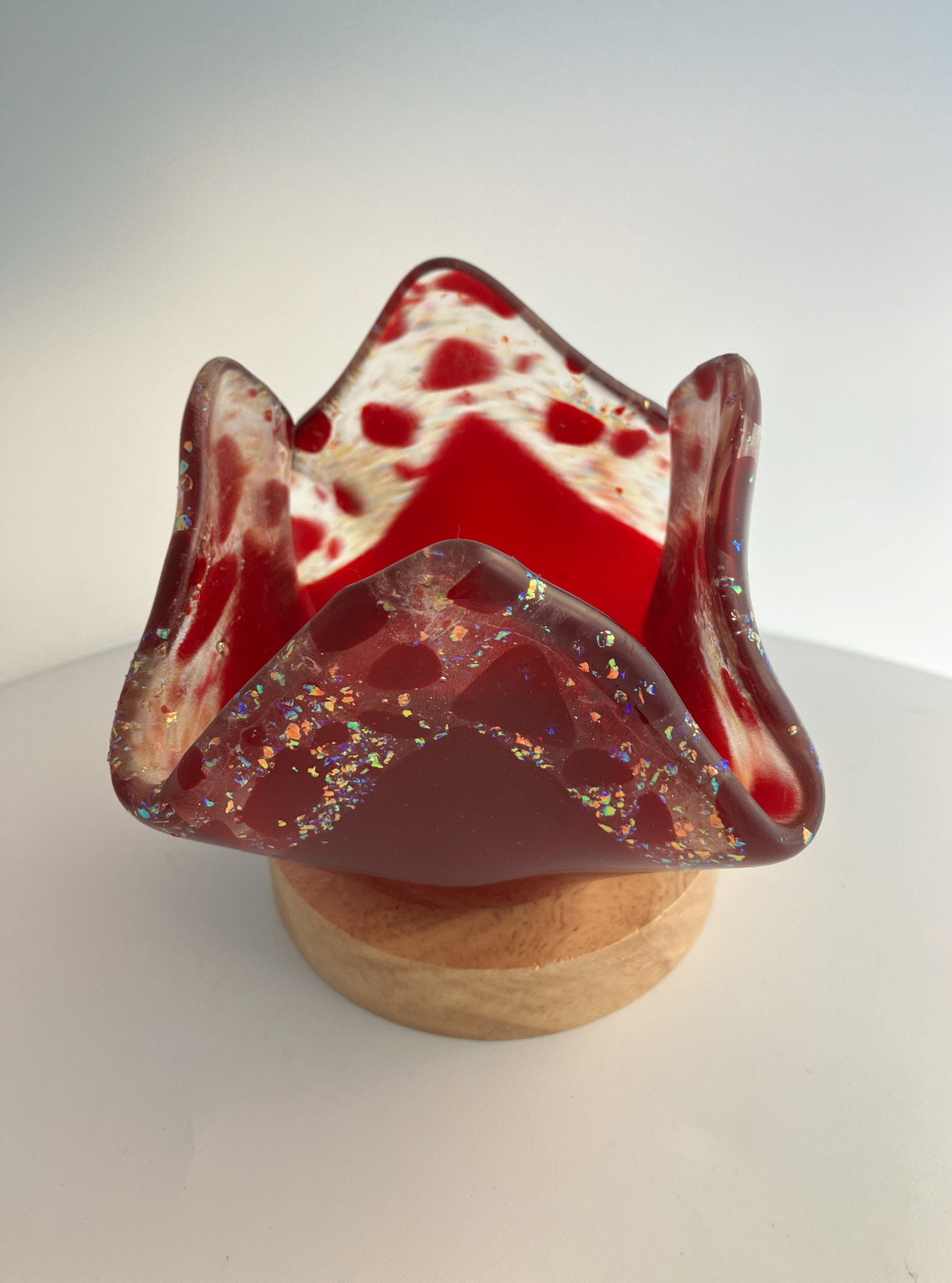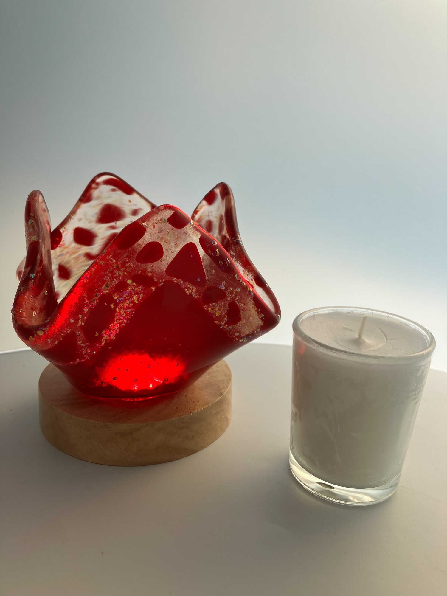 Transparent red with gold flake glass votive candle holder.