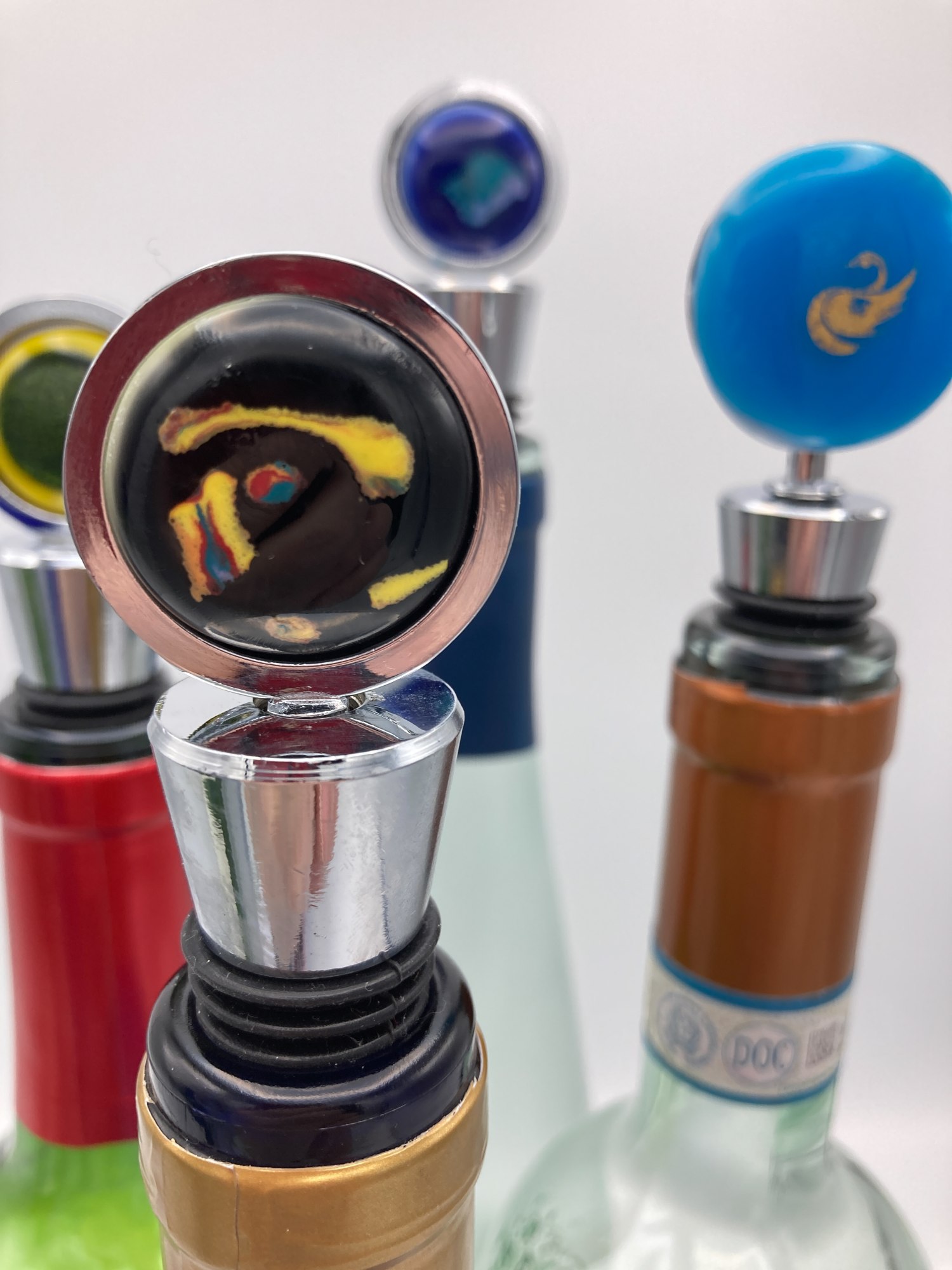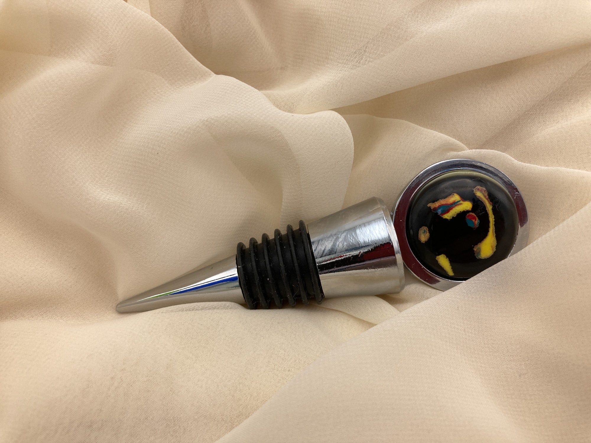 Hand painted yellow with color accents on black glass inset tops this conical shape wine stopper made of zinc alloy and food-grade silicone rubber seal.