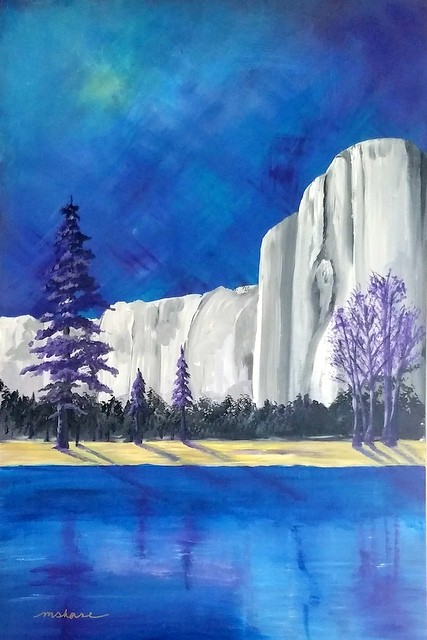 Some of the greatest wonders of the High Sierras are captured in Yosemite National Park. Originally photographed by Ansel Adams, this piece is inspired by one of his black and white photographs of El Capitan. By adding the colors that speak to me, it gives new life to his magnificent work.