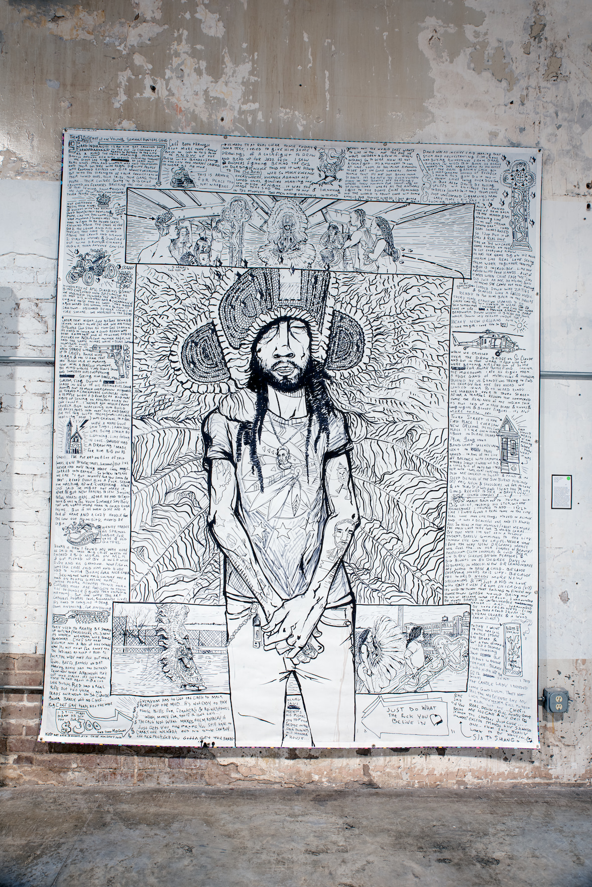 This drawing is the final piece in a series of black and white works on found vinyl banners. It is framed by stream of conscious text drawn from Allston's reflections on a second line as it passed under the Claiborne Bridge. The series developed through conversations with friends and loved ones about the city and their relationship to it, with the drawings acting as a sort of notebook.