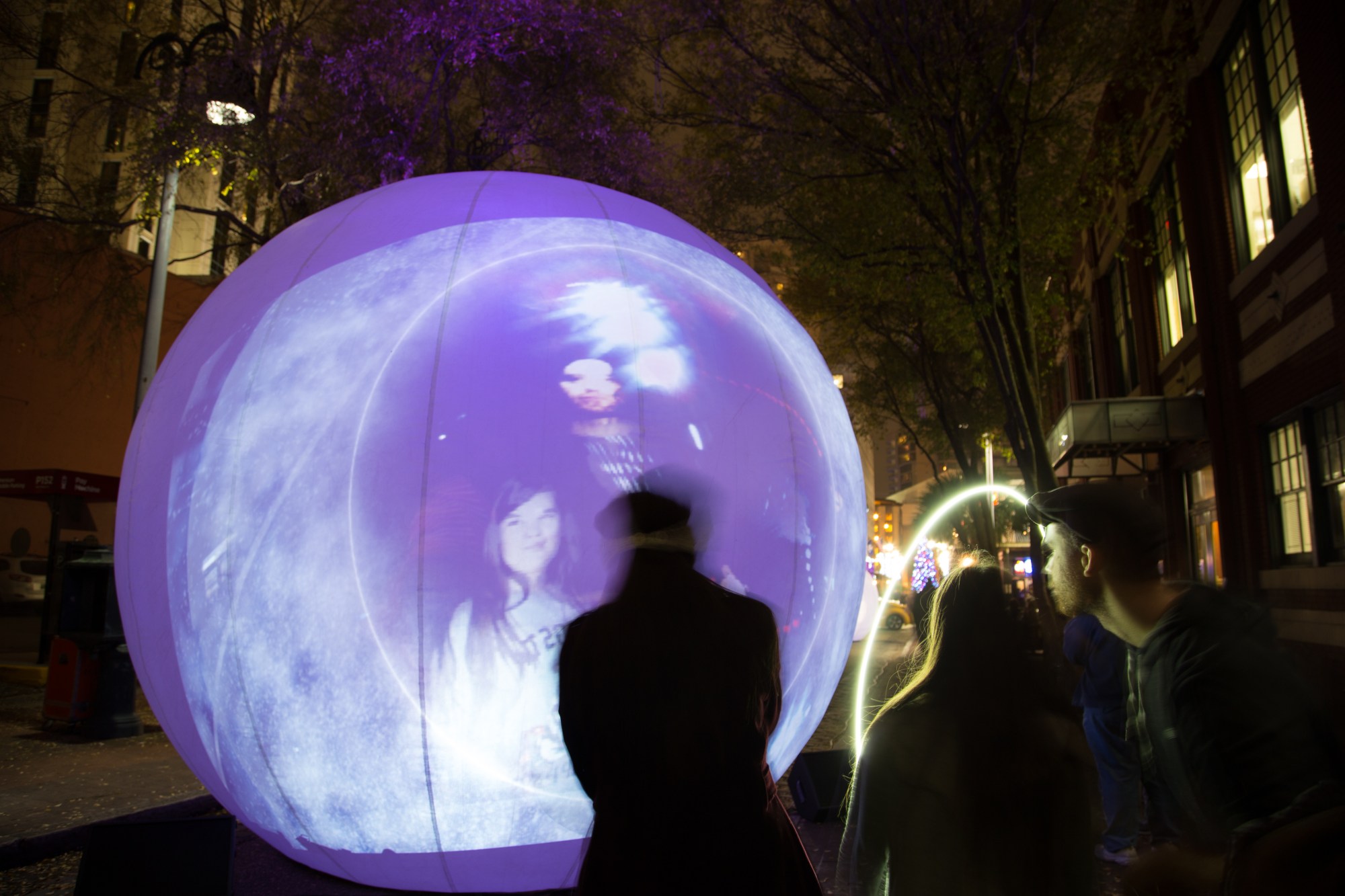 A series of light-sensitive spheres that are sensitive to viewer interaction. This could come by using anything from smartphones and glowsticks to flashlights, resulting in lit self-portraits.
