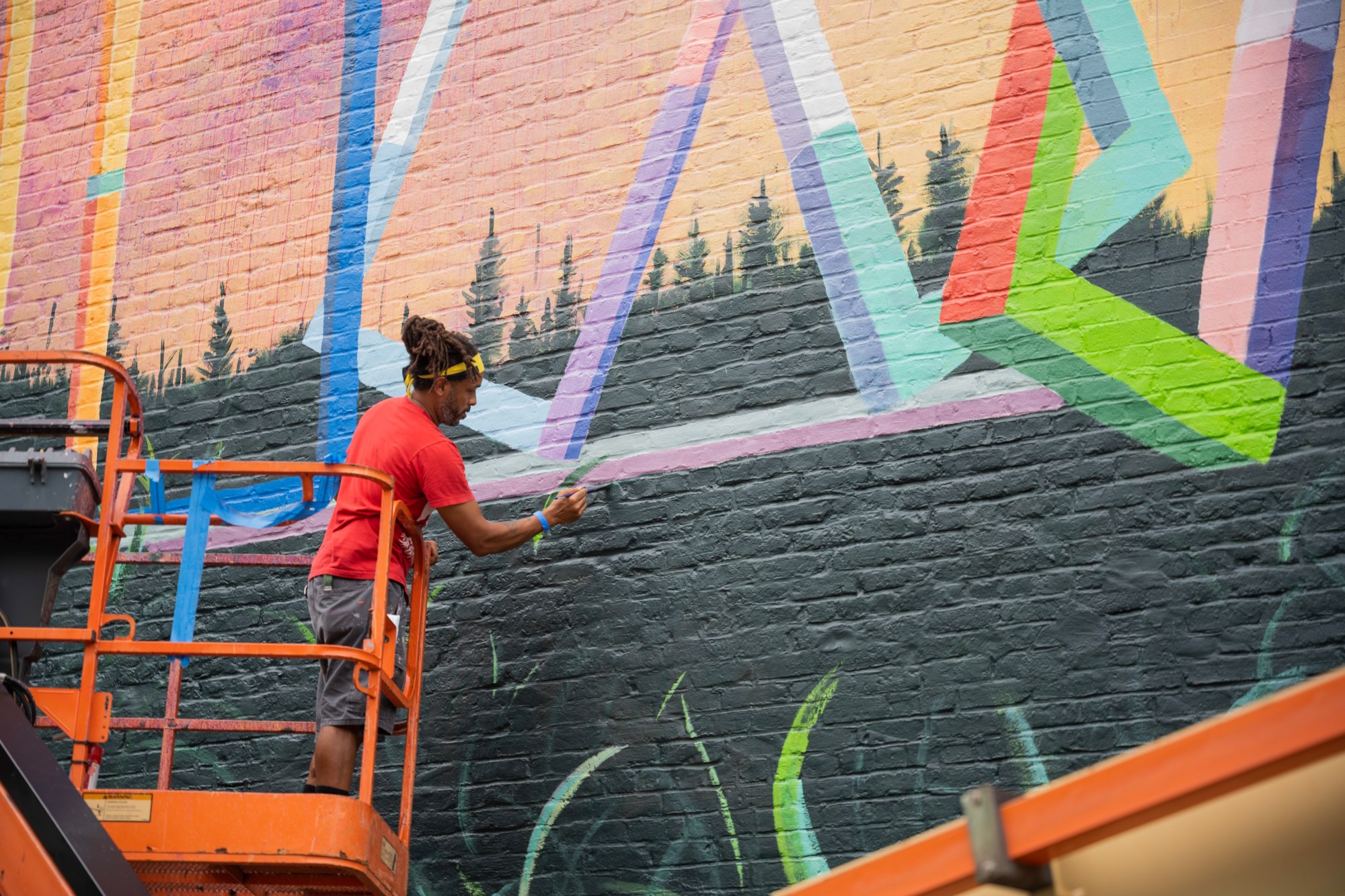 This mural is an ode to generations of New Orleanians, with depictions of artist Ayo Scott's father John Scott’s well-known public sculptures "Spirit House" and "Ocean Song," and his young daughter dressed as Wonder Woman holding a daisy as tribute to his mother.