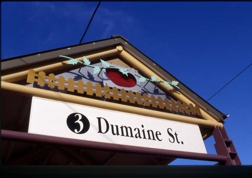 Thomas Mann has used the food and industry of the wharf area as the subject matter of his decorative triangular gables. Tomatoes, coffee cups, and ships are cut into flat, semi-abstract shapes. Mann's creative style suggests a "Techno-Romantic" design effort that incorporates contemporary high-tech materials with historically romantic imagery. The intent is to "humanize" and personalize the relationship between technology and the individual.
