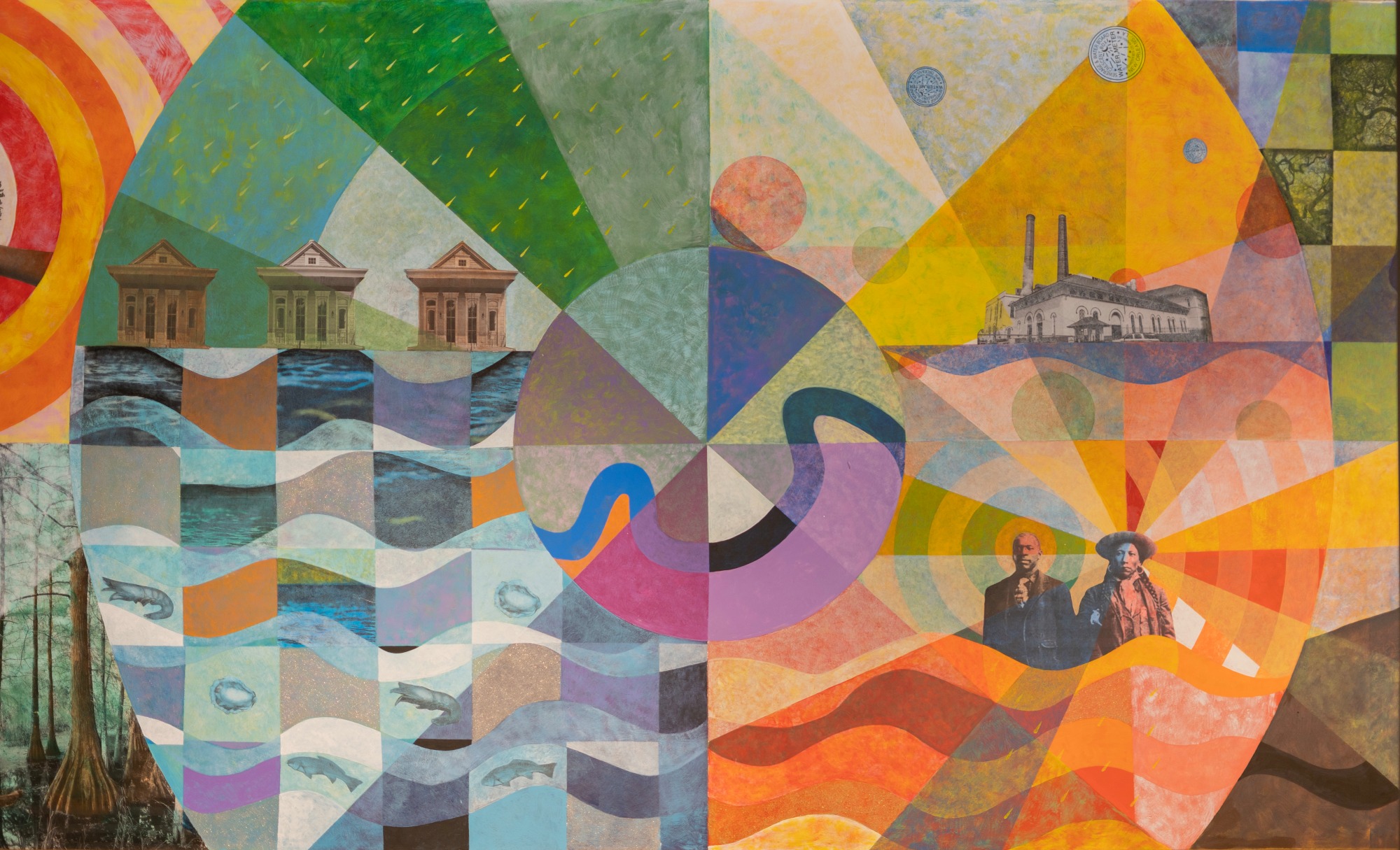 The lobby mural led by Carl Joe Williams explores the city’s past, present, and future relationship with water. Placed next to a towering wooden cistern that collects stormwater, the mural encourages visitors to think about what it looks like to live more responsibly with our environment. With both murals, YAM hoped to move beyond stereotypical depictions of the city and to spark conversations about the city’s history of activism and resilience.